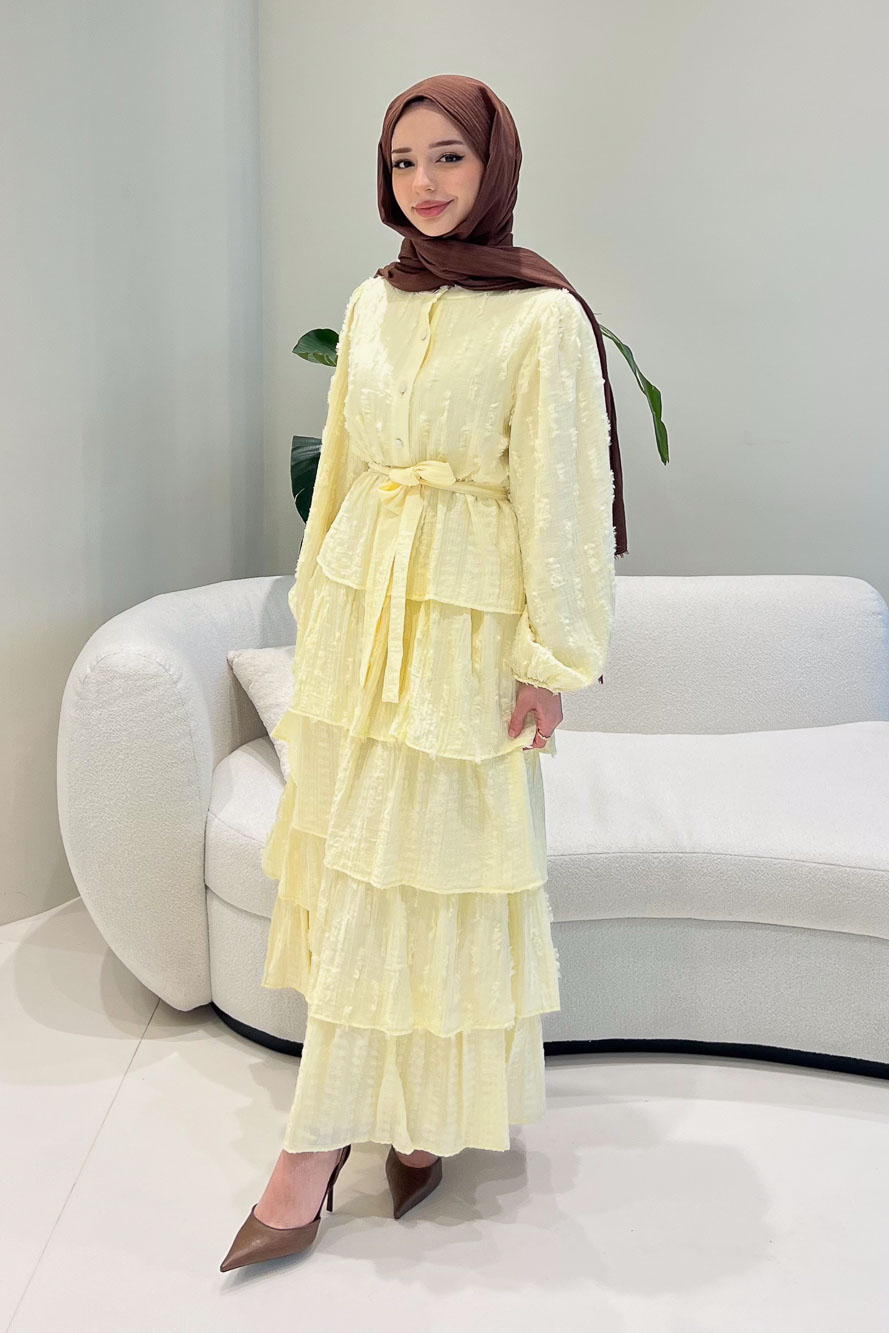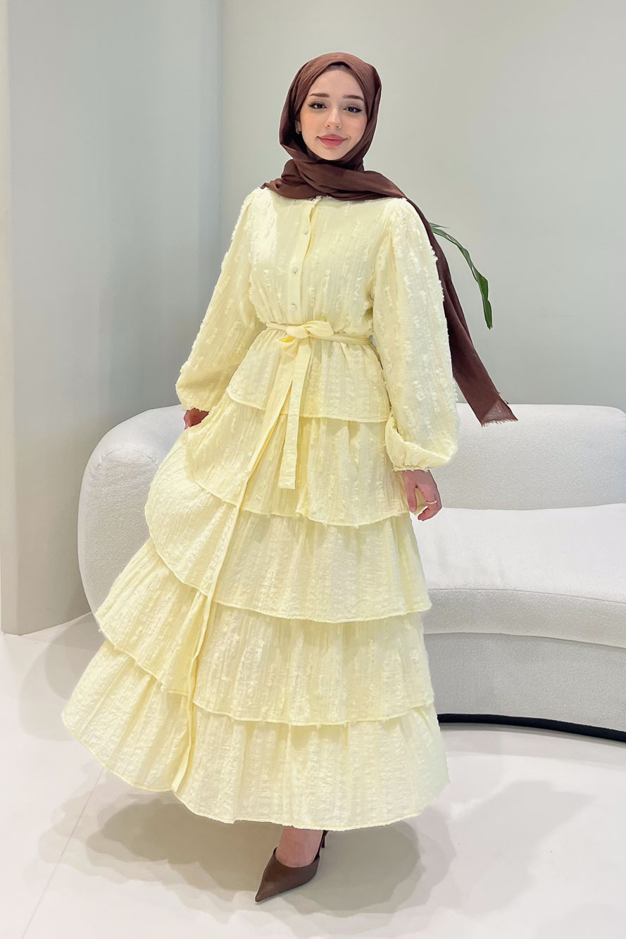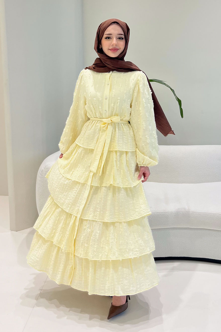 Kat kat volanlı etek yapısı ve düğme detaylarıyla romantik ve akışkan bir siluet sunar.