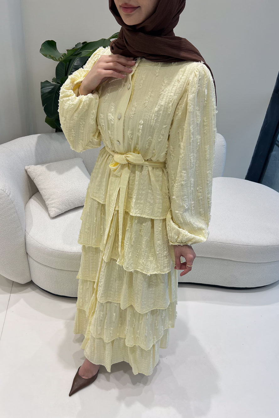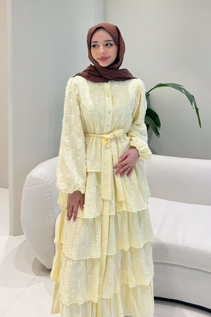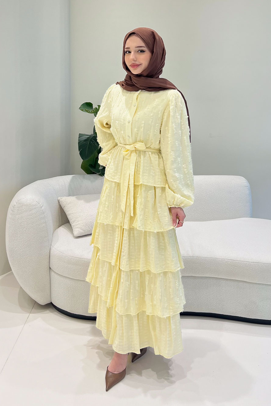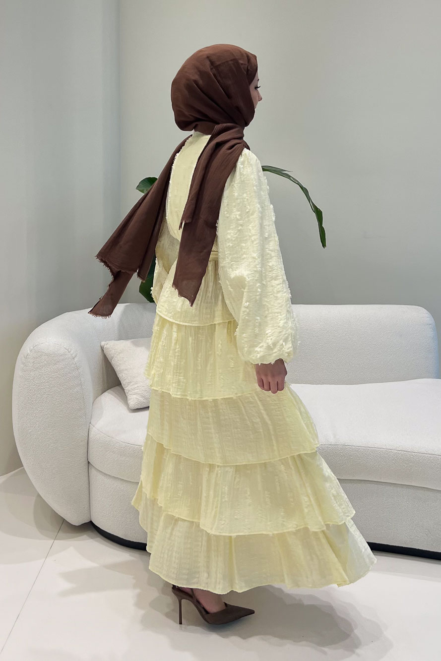 Kat kat volanlı etek yapısı ve düğme detaylarıyla romantik ve akışkan bir siluet sunar.