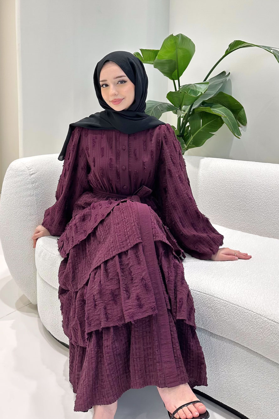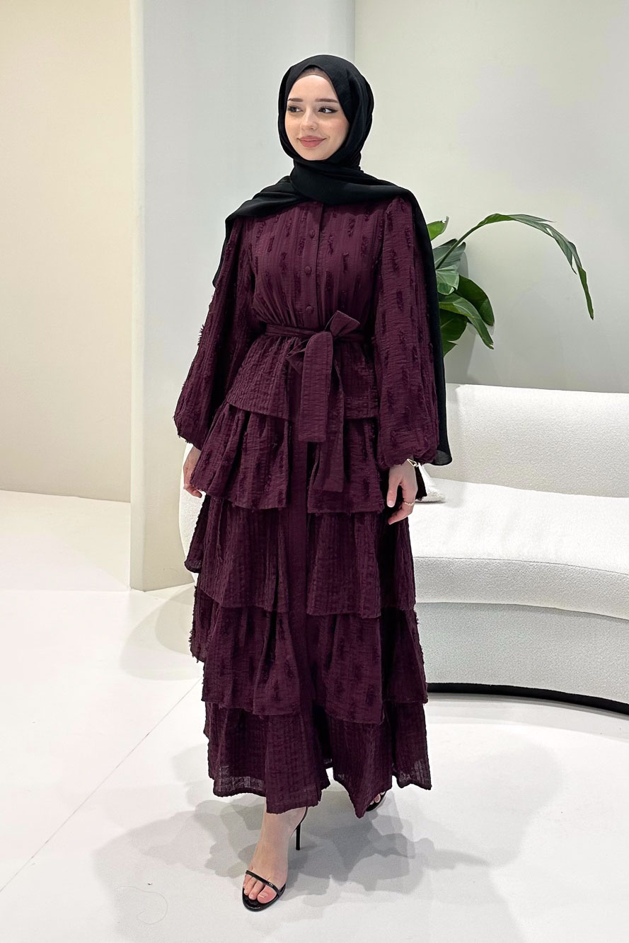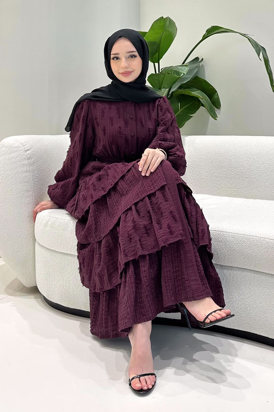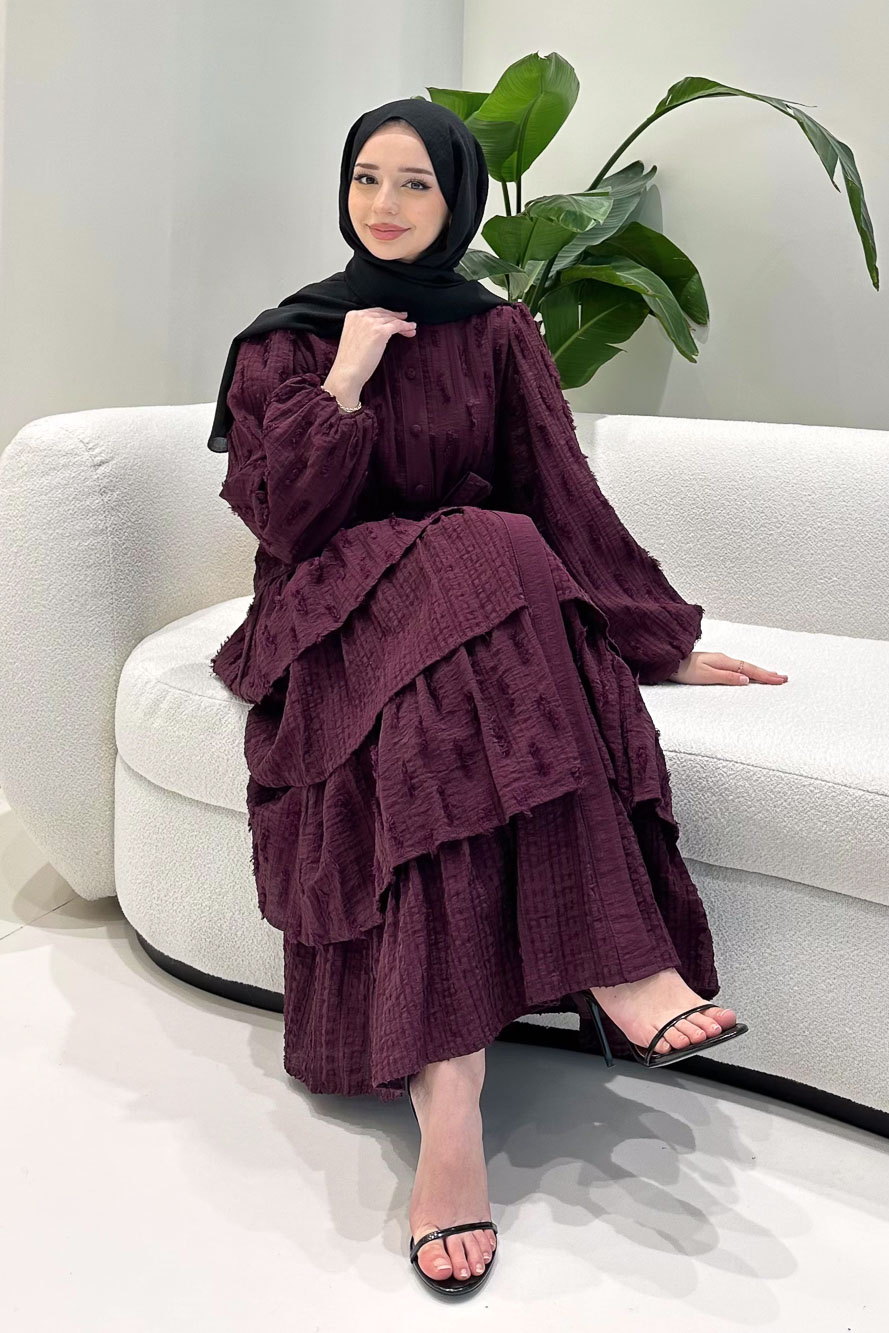 Kat kat volanlı etek yapısı ve düğme detaylarıyla romantik ve akışkan bir siluet sunar.
