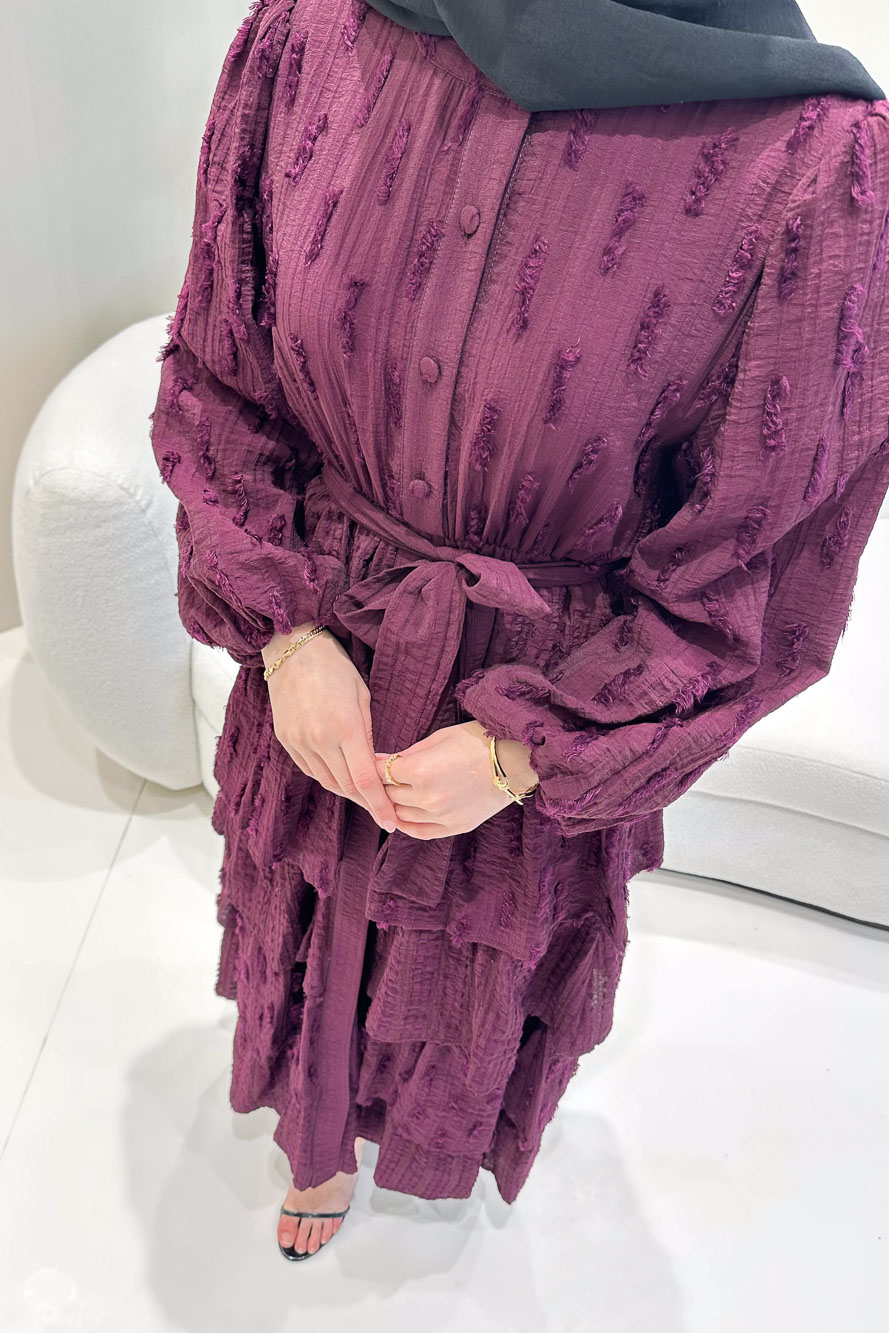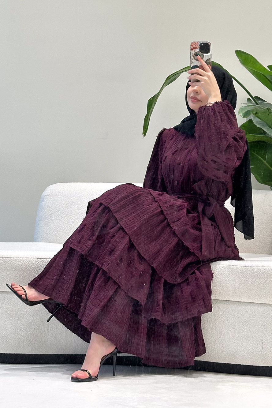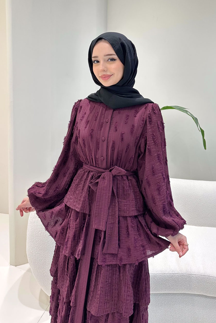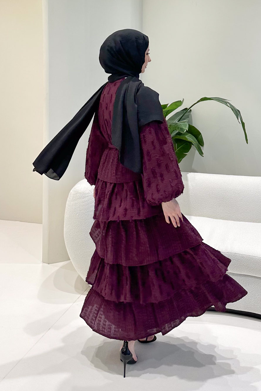 Kat kat volanlı etek yapısı ve düğme detaylarıyla romantik ve akışkan bir siluet sunar.