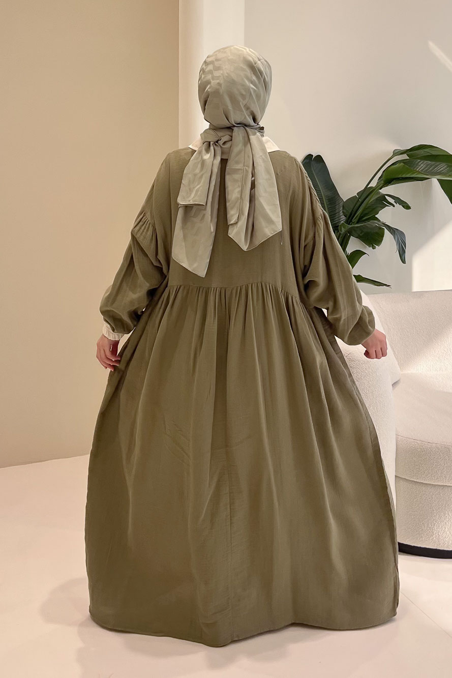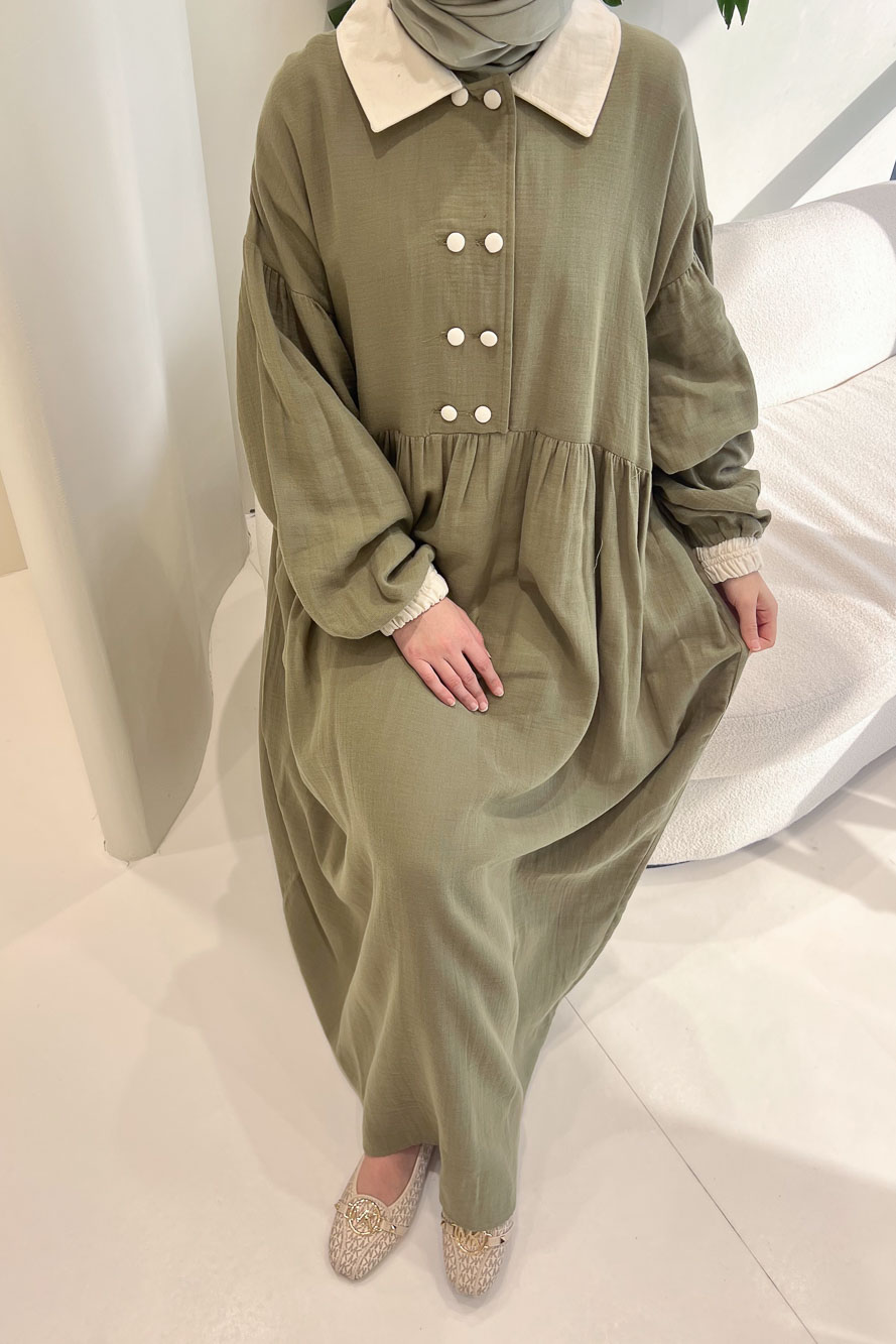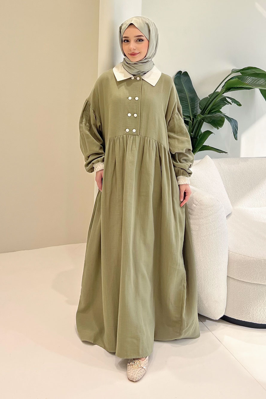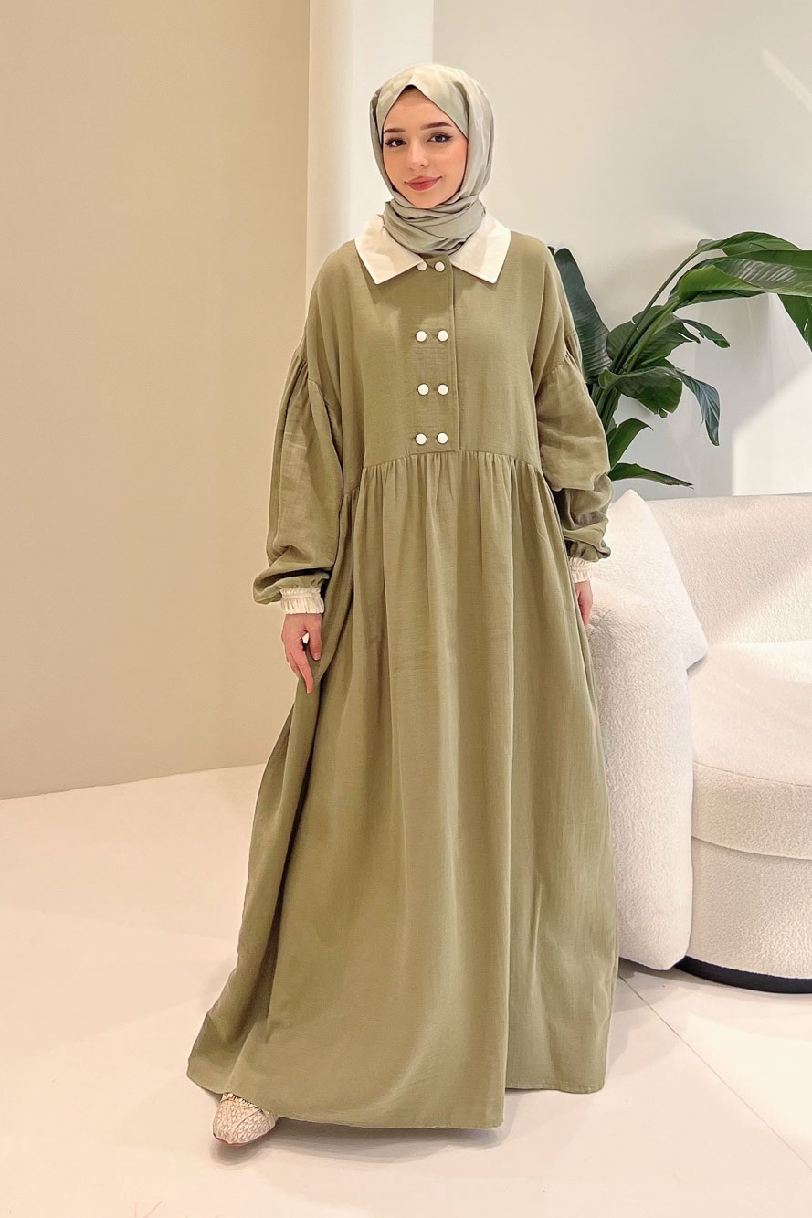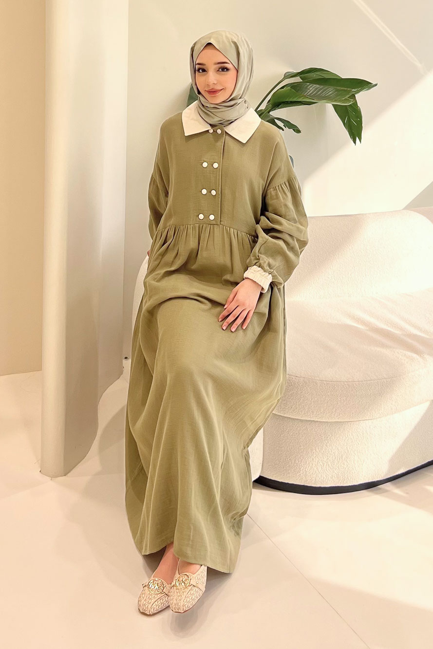 Aloura Yakalı Çift Düğmeli Müslin Elbise - Haki
