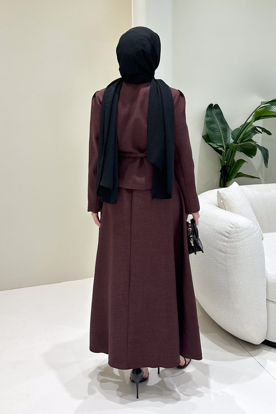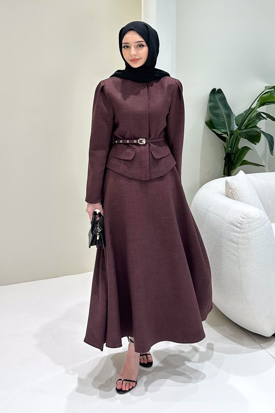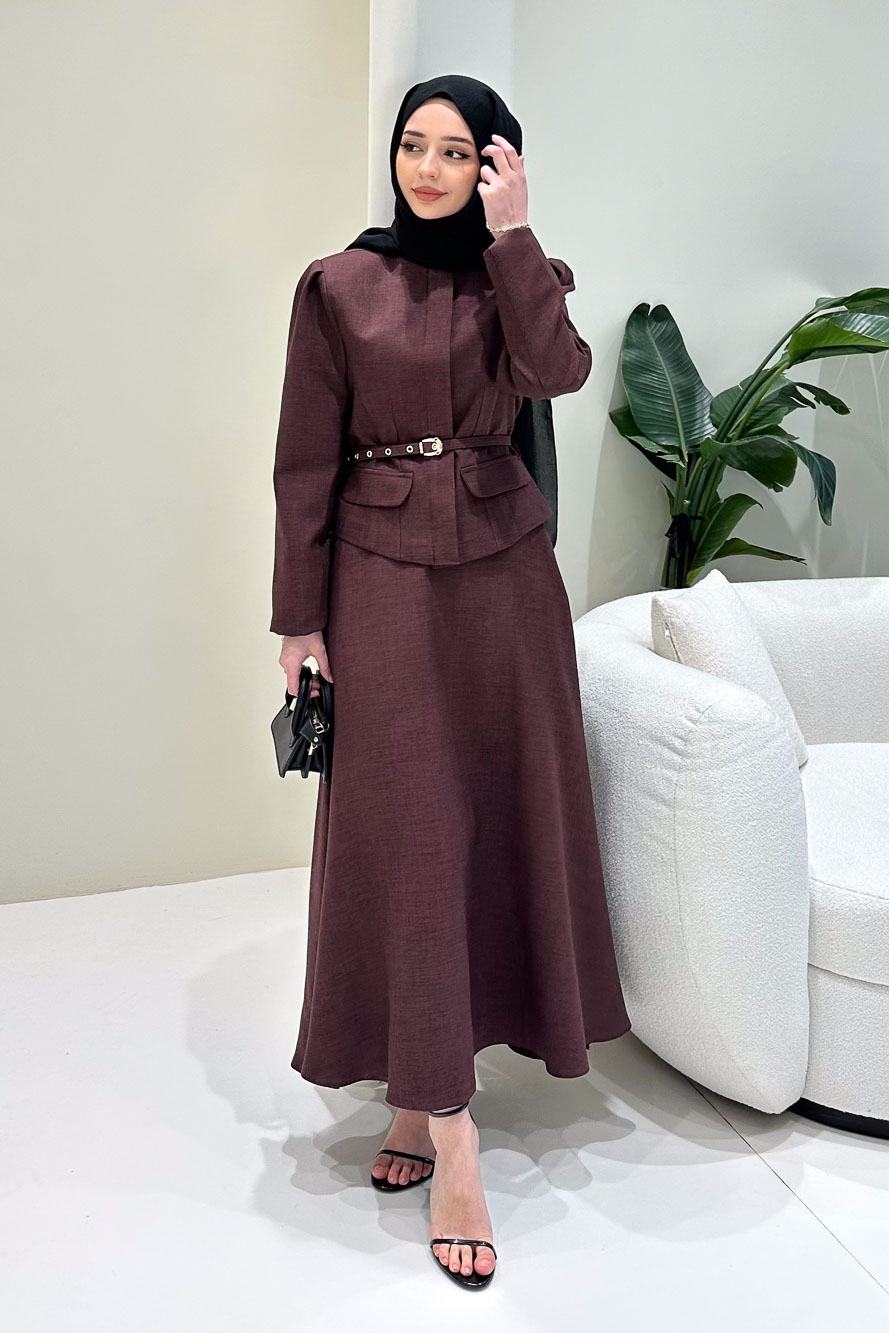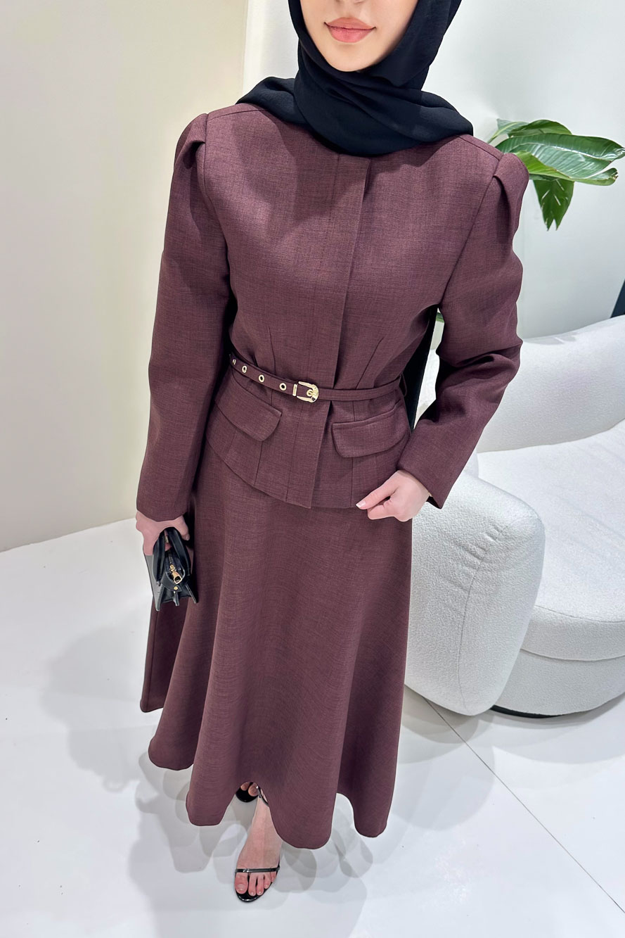 Ceketi astarlıdır ve önden gizli düğmelidir. Eteği fermuarlıdır ve seyyar kemerlidir. Manken üzerinde S bedendir.