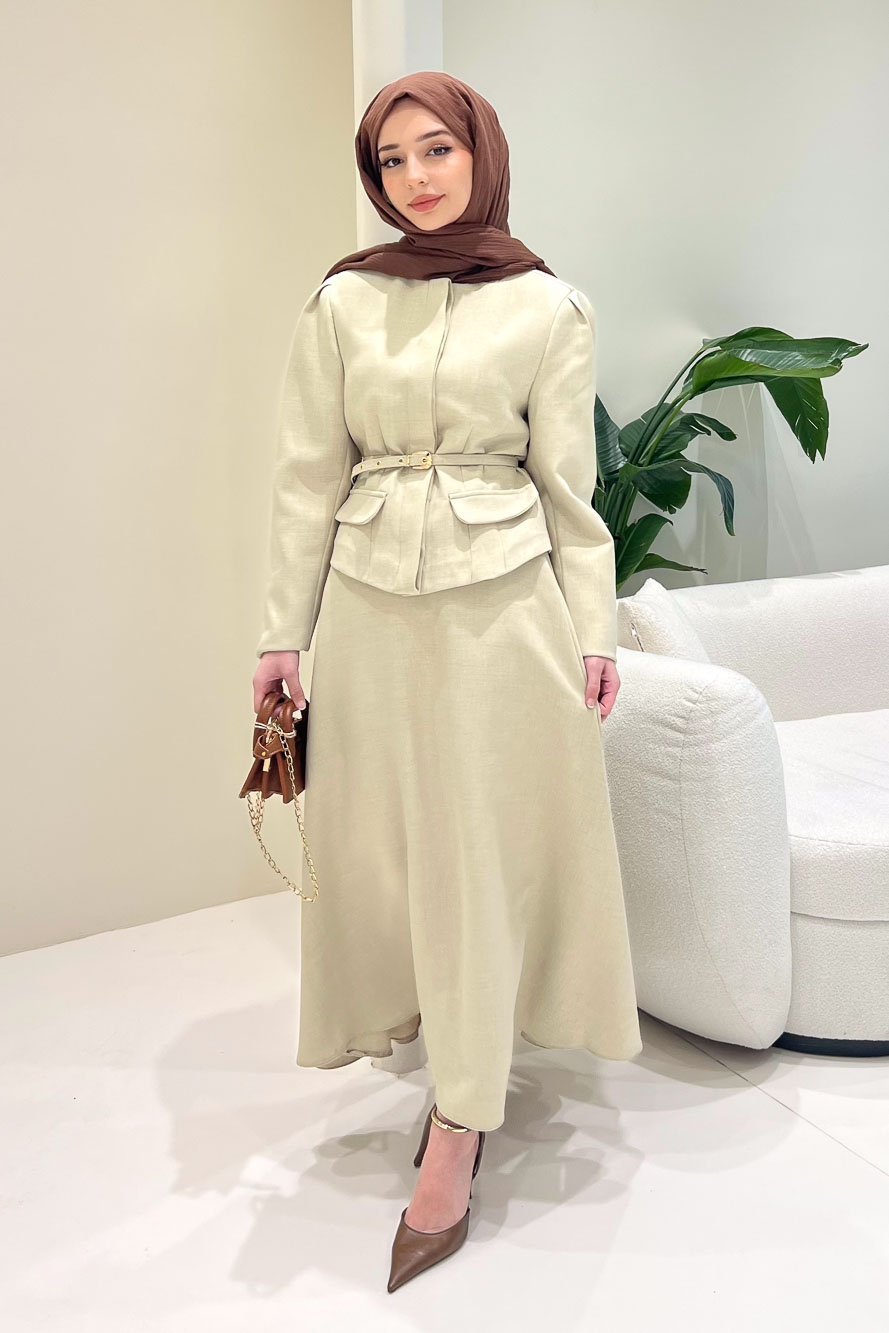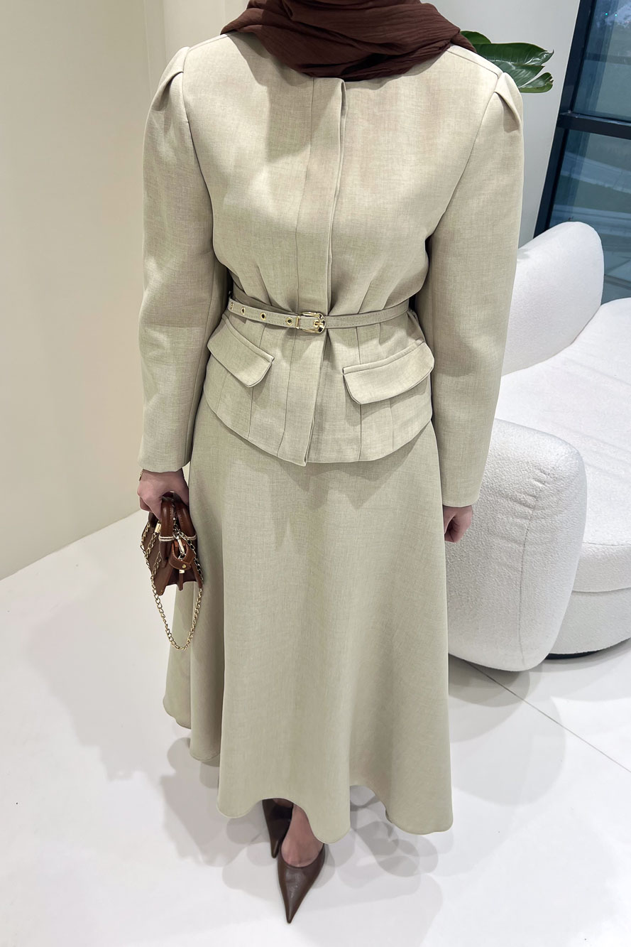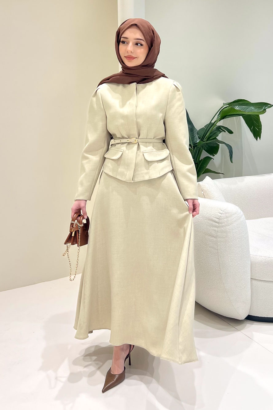 Ceketi astarlıdır ve önden gizli düğmelidir. Eteği fermuarlıdır ve seyyar kemerlidir. Manken üzerinde S bedendir.