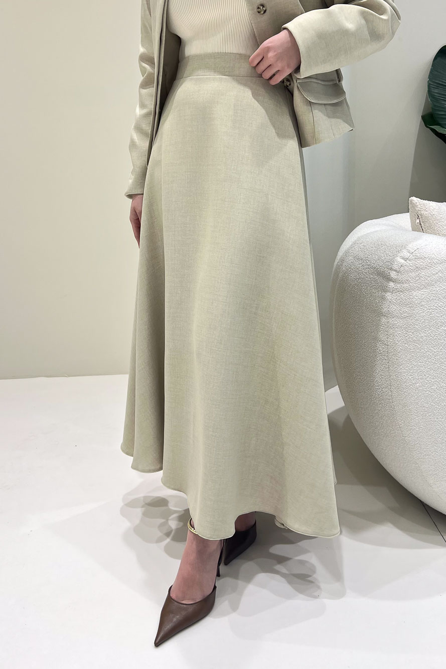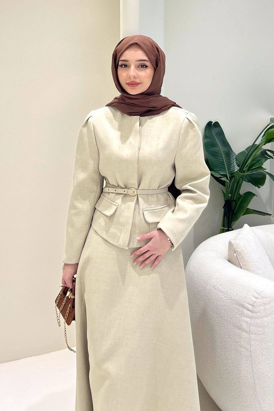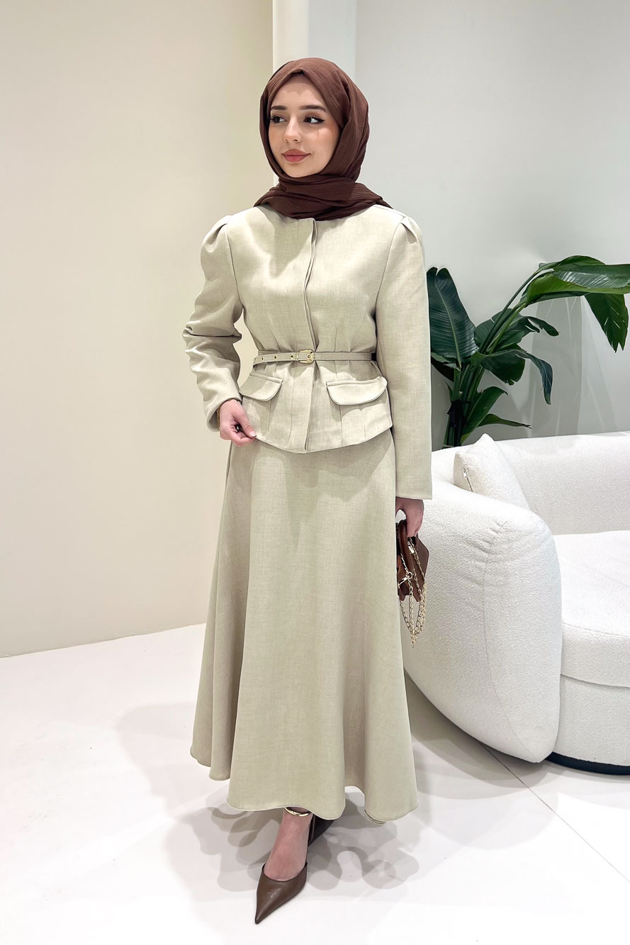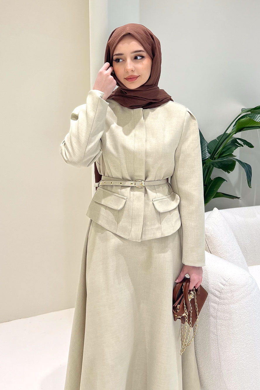 Ceketi astarlıdır ve önden gizli düğmelidir. Eteği fermuarlıdır ve seyyar kemerlidir. Manken üzerinde S bedendir.
