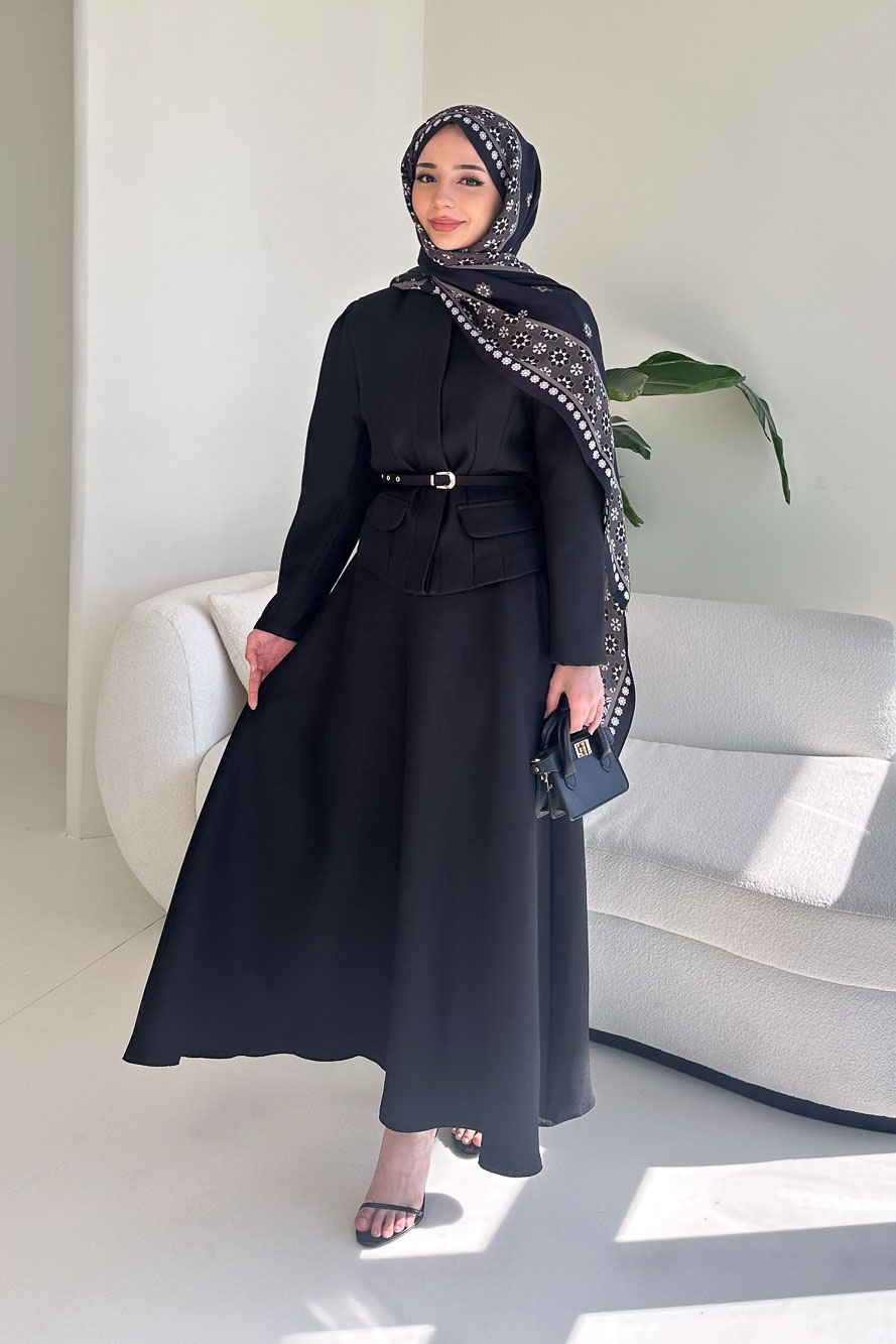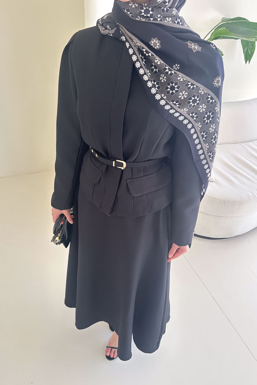Ceketi astarlıdır ve önden gizli düğmelidir. Eteği fermuarlıdır ve seyyar kemerlidir. Manken üzerinde S bedendir.