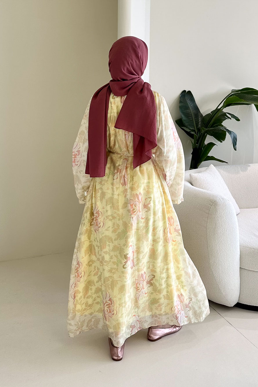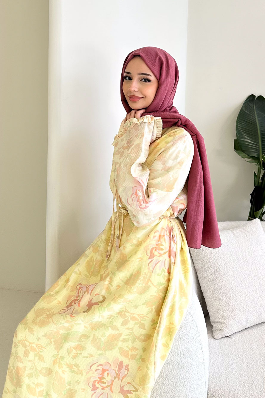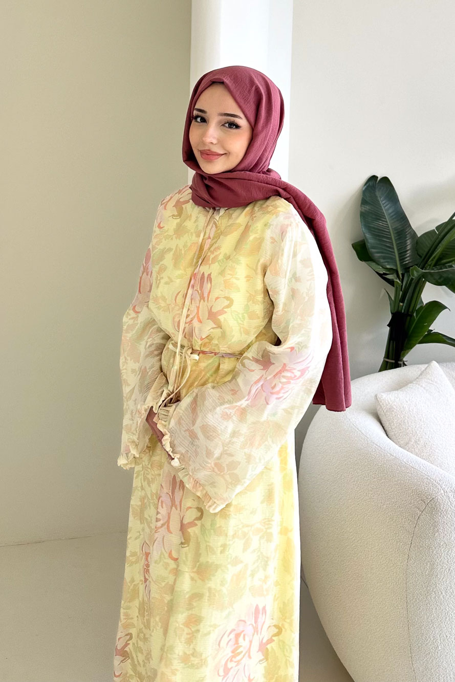Uçuşan şifon dokusu ve romantik çiçek desenleriyle yaz davetlerinin zarif parçasıdır.