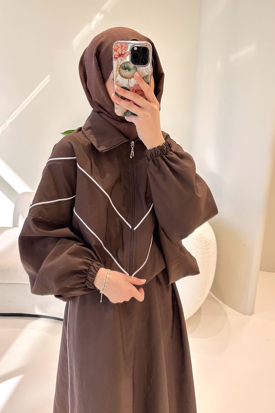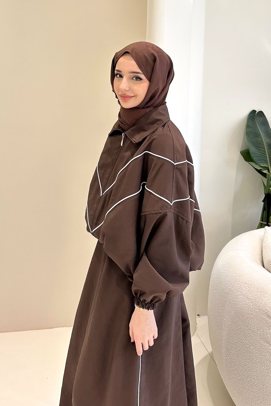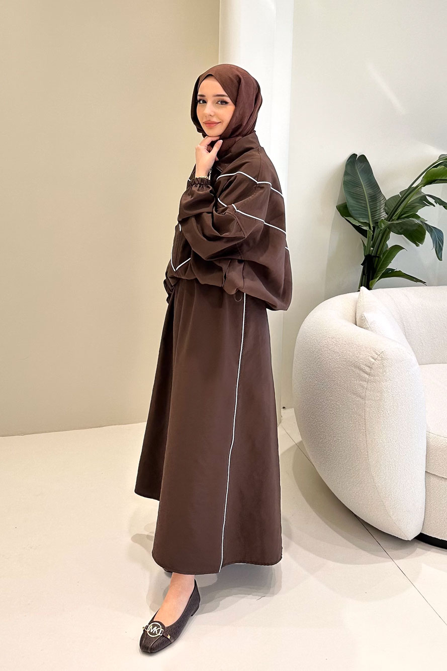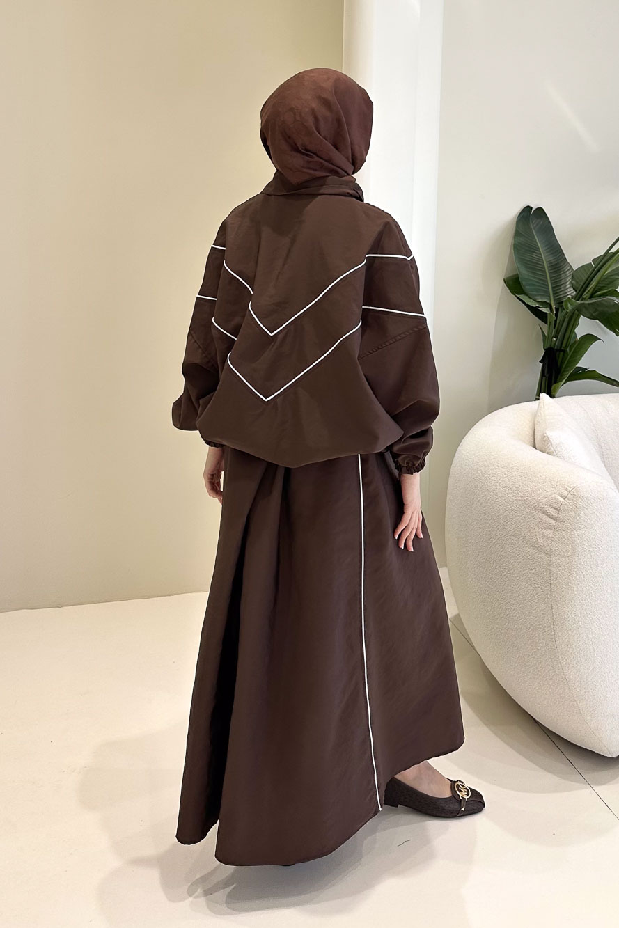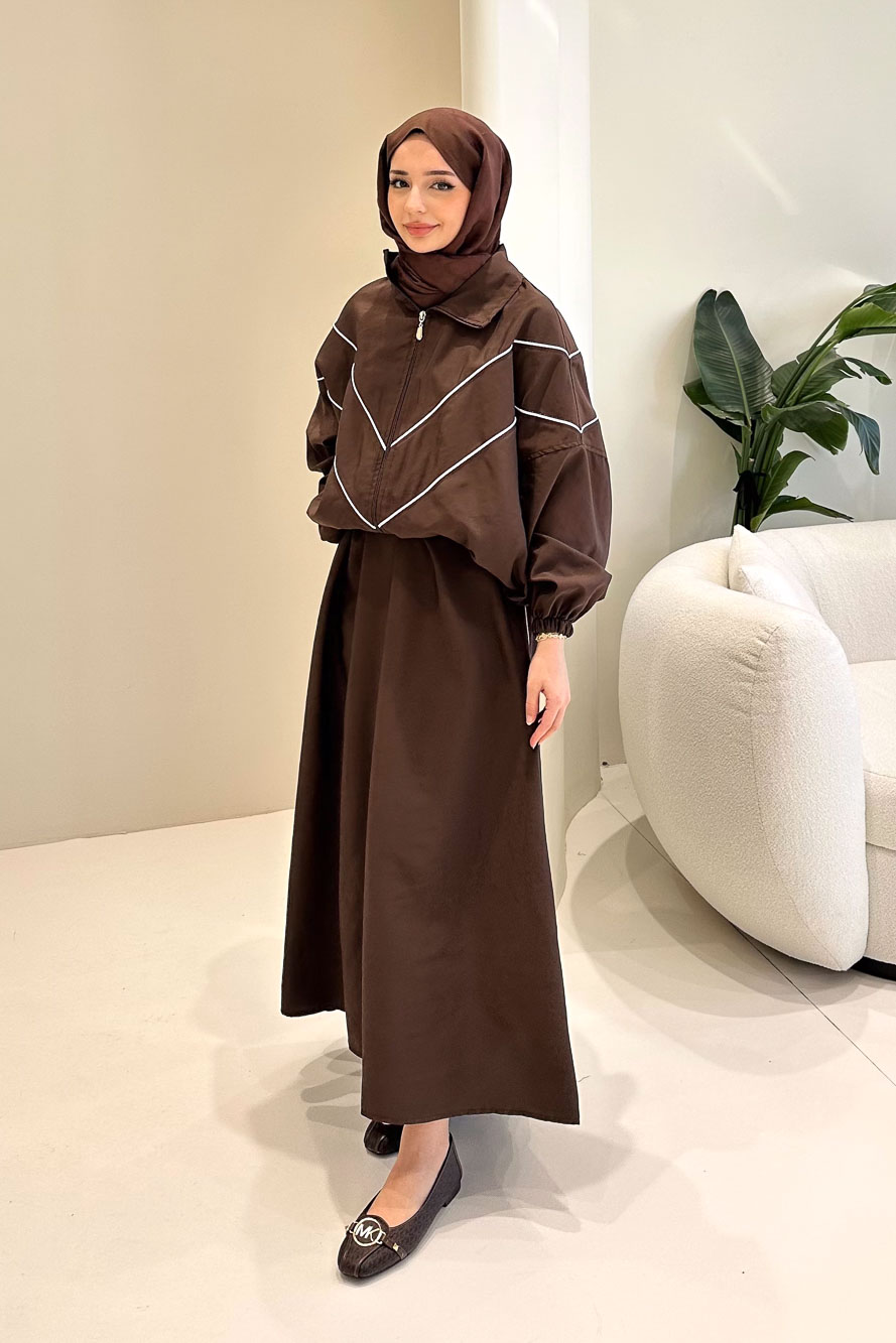 Üst kısmı ceplidir ve bel kısmı stoperlidir. Kolları lastikli yapıdadır. Eteği beli lastikli ve pile detaylıdır. Manken üzerinde S/M bedendir.
