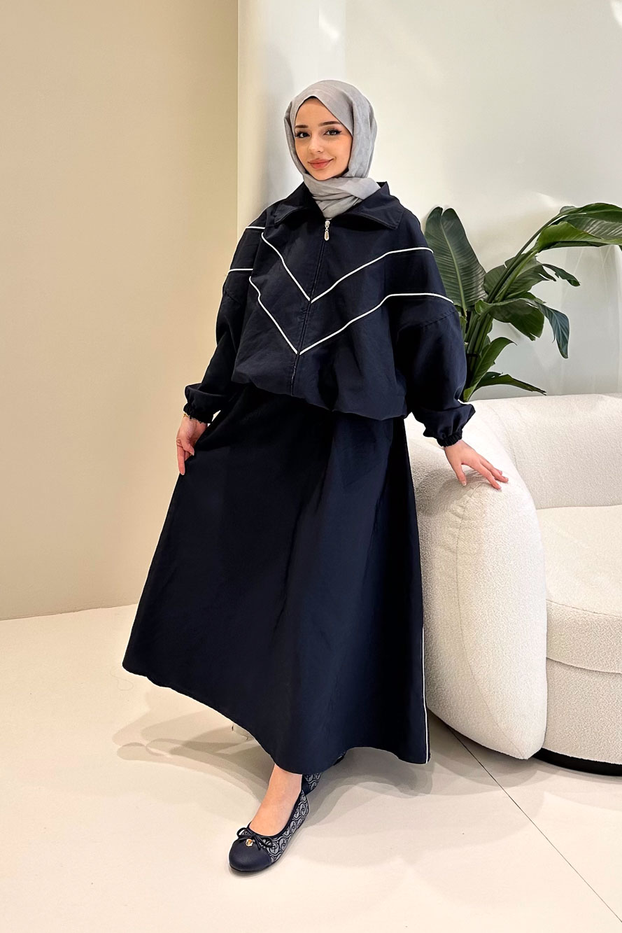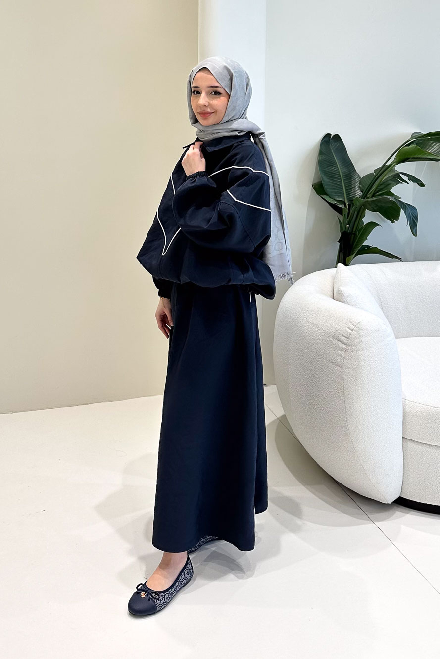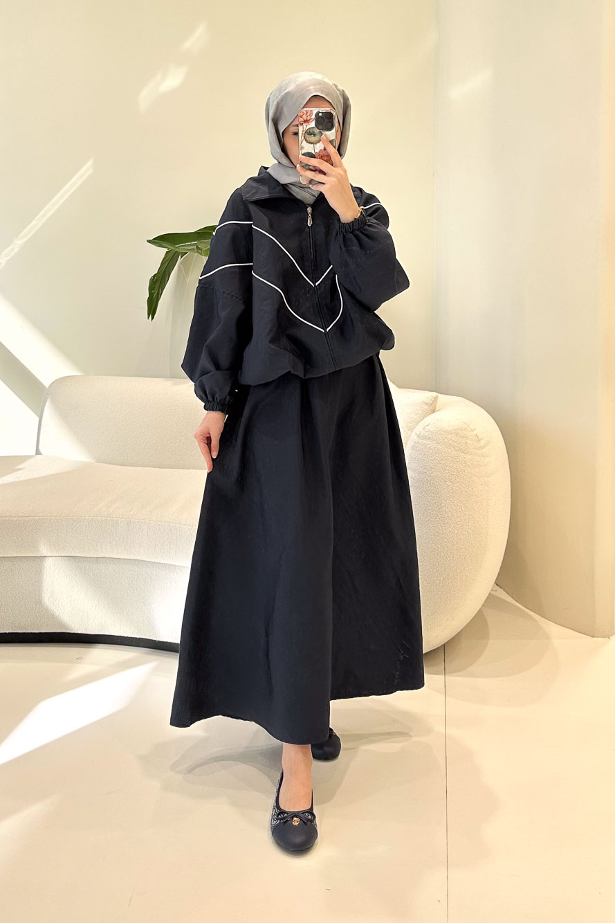 Üst kısmı ceplidir ve bel kısmı stoperlidir. Kolları lastikli yapıdadır. Eteği beli lastikli ve pile detaylıdır. Manken üzerinde S/M bedendir.