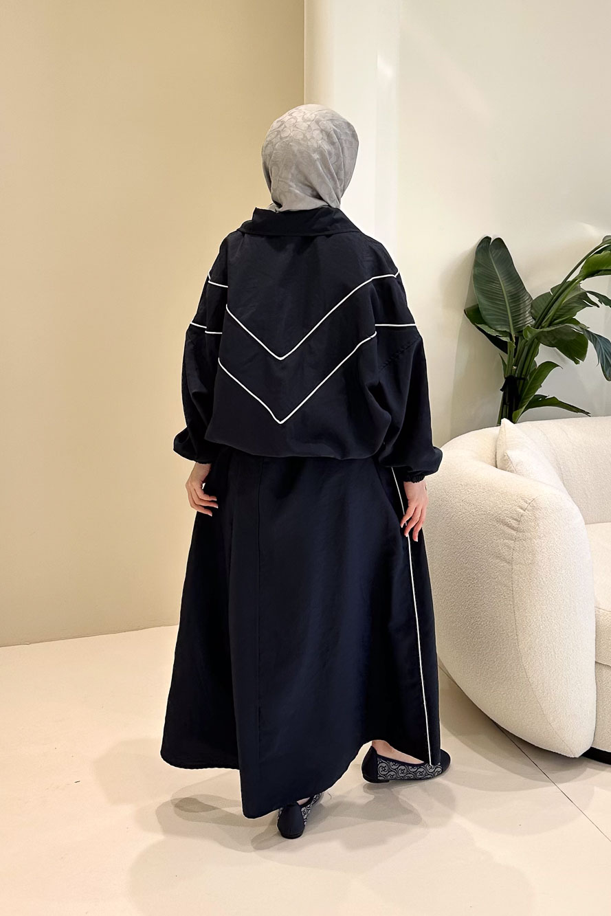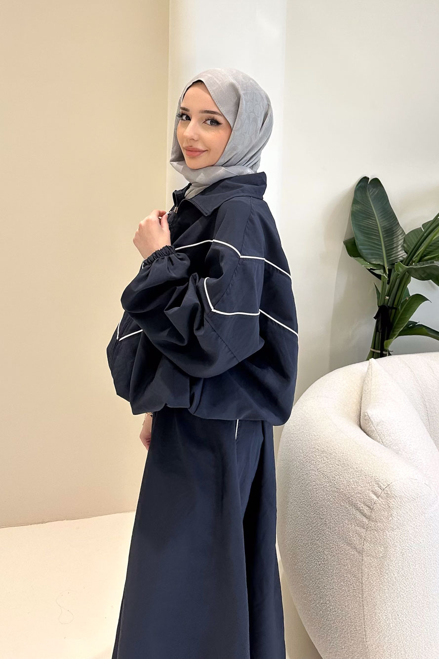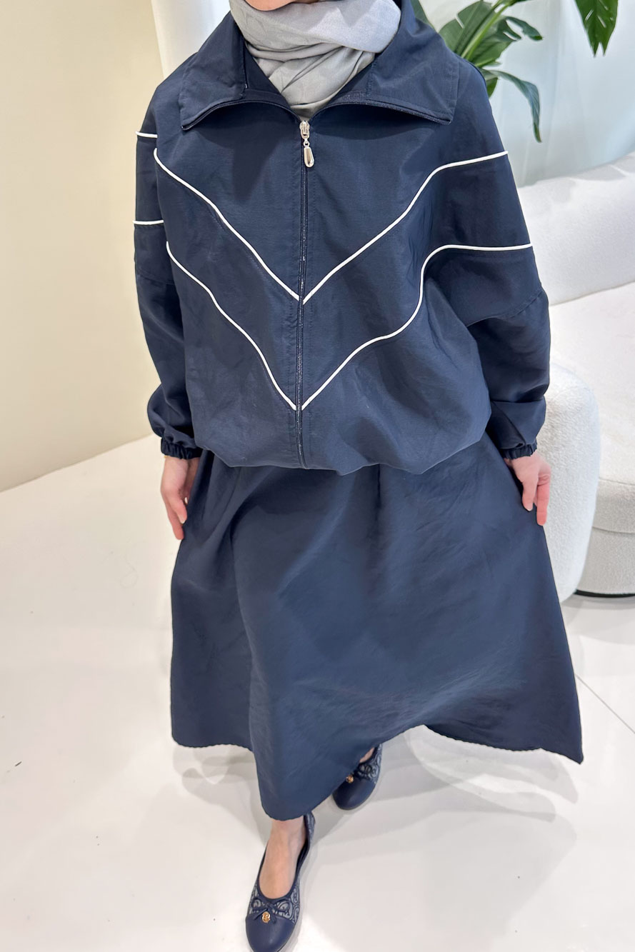 Üst kısmı ceplidir ve bel kısmı stoperlidir. Kolları lastikli yapıdadır. Eteği beli lastikli ve pile detaylıdır. Manken üzerinde S/M bedendir.