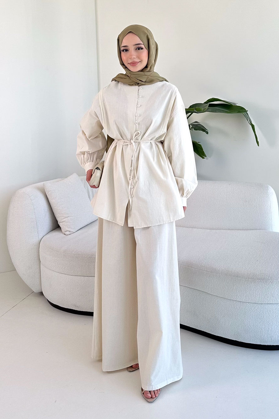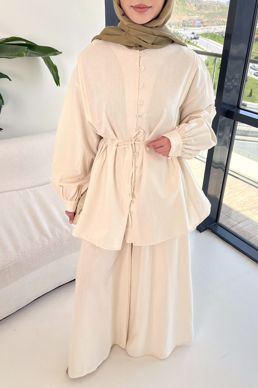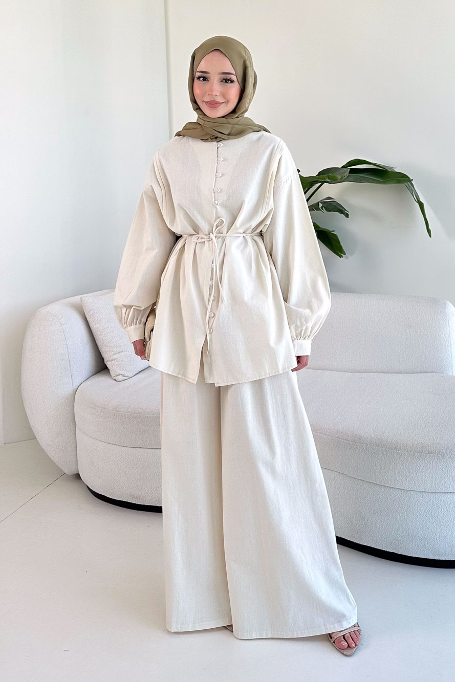 Bağcık Detaylı Keten Pantolon Takım - Bej