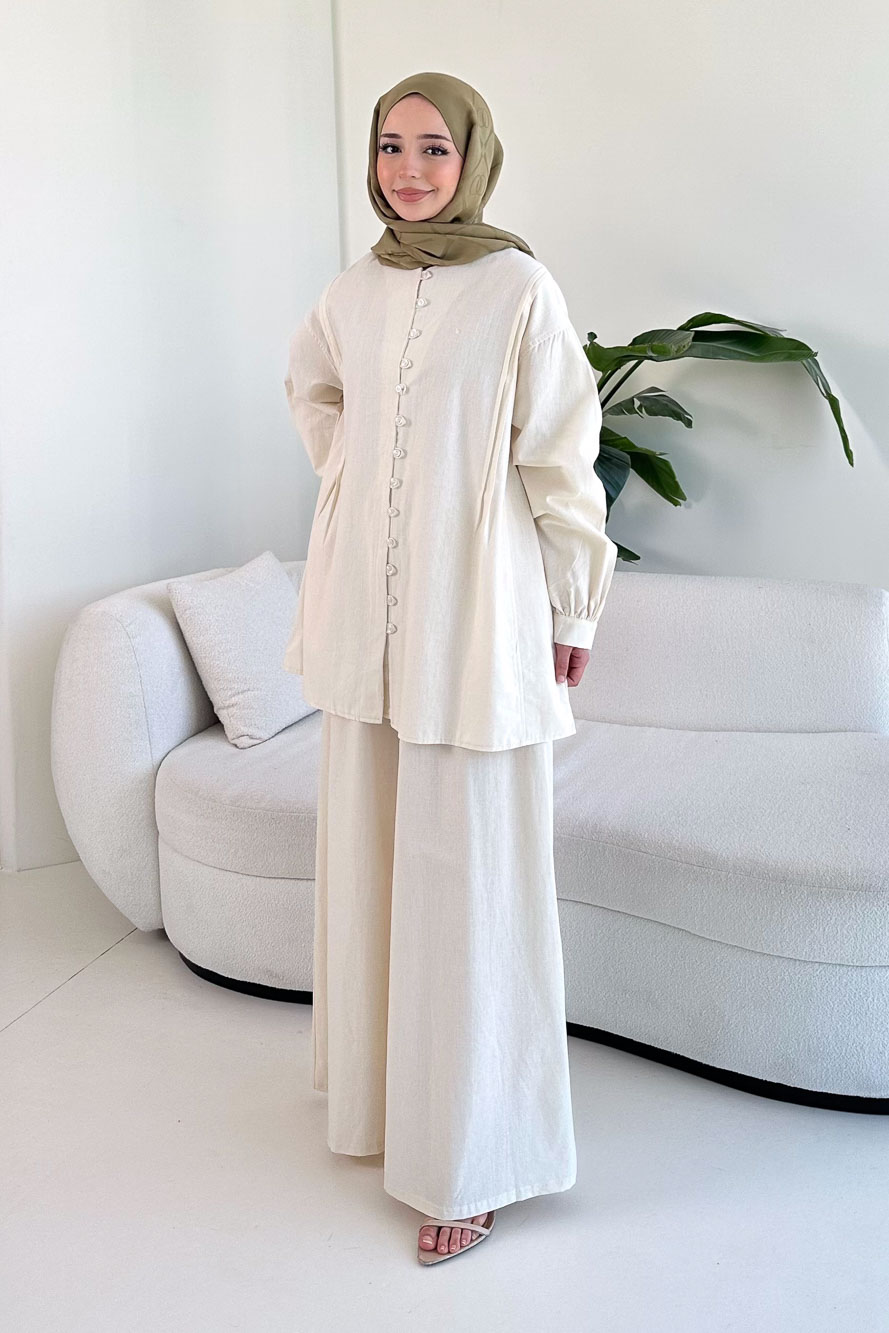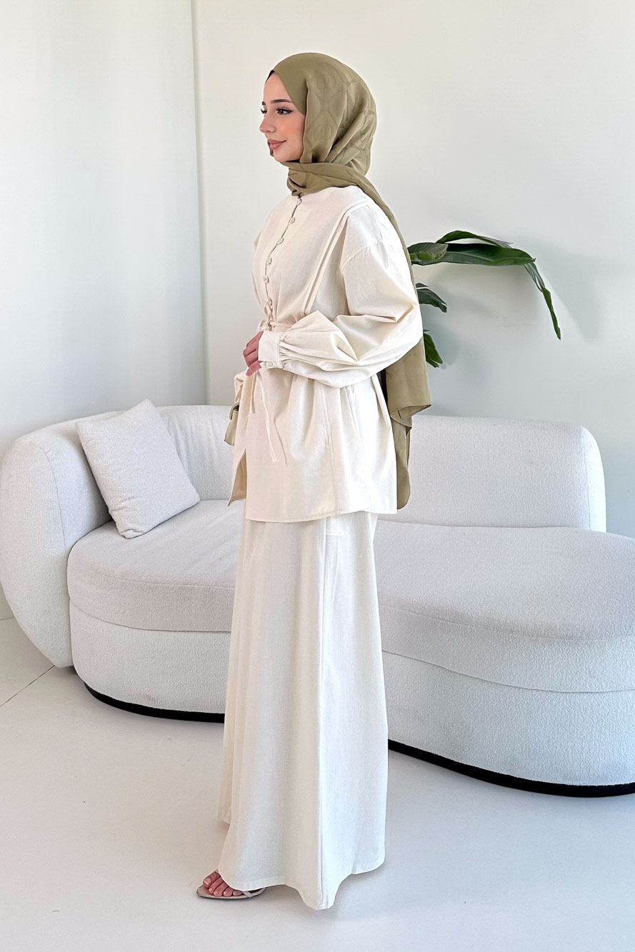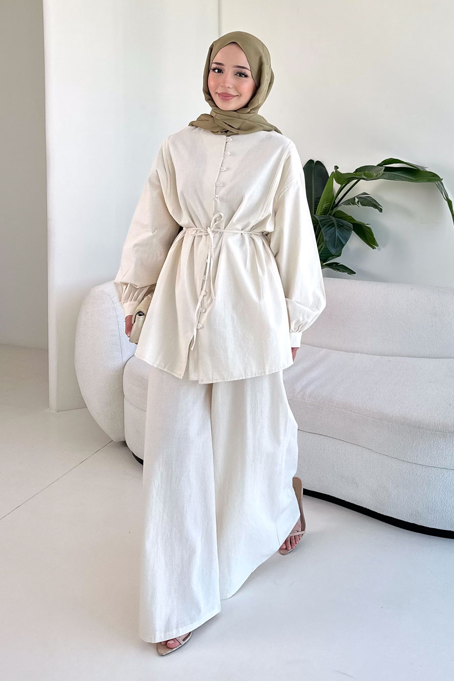 Bağcık Detaylı Keten Pantolon Takım - Bej