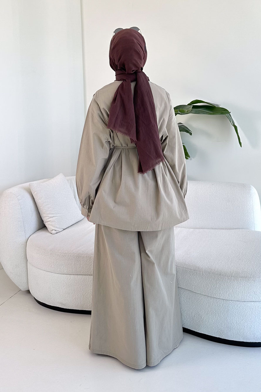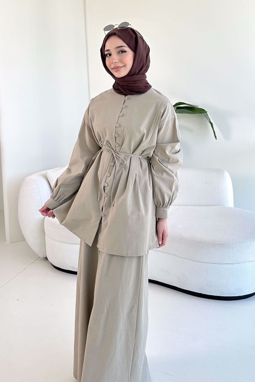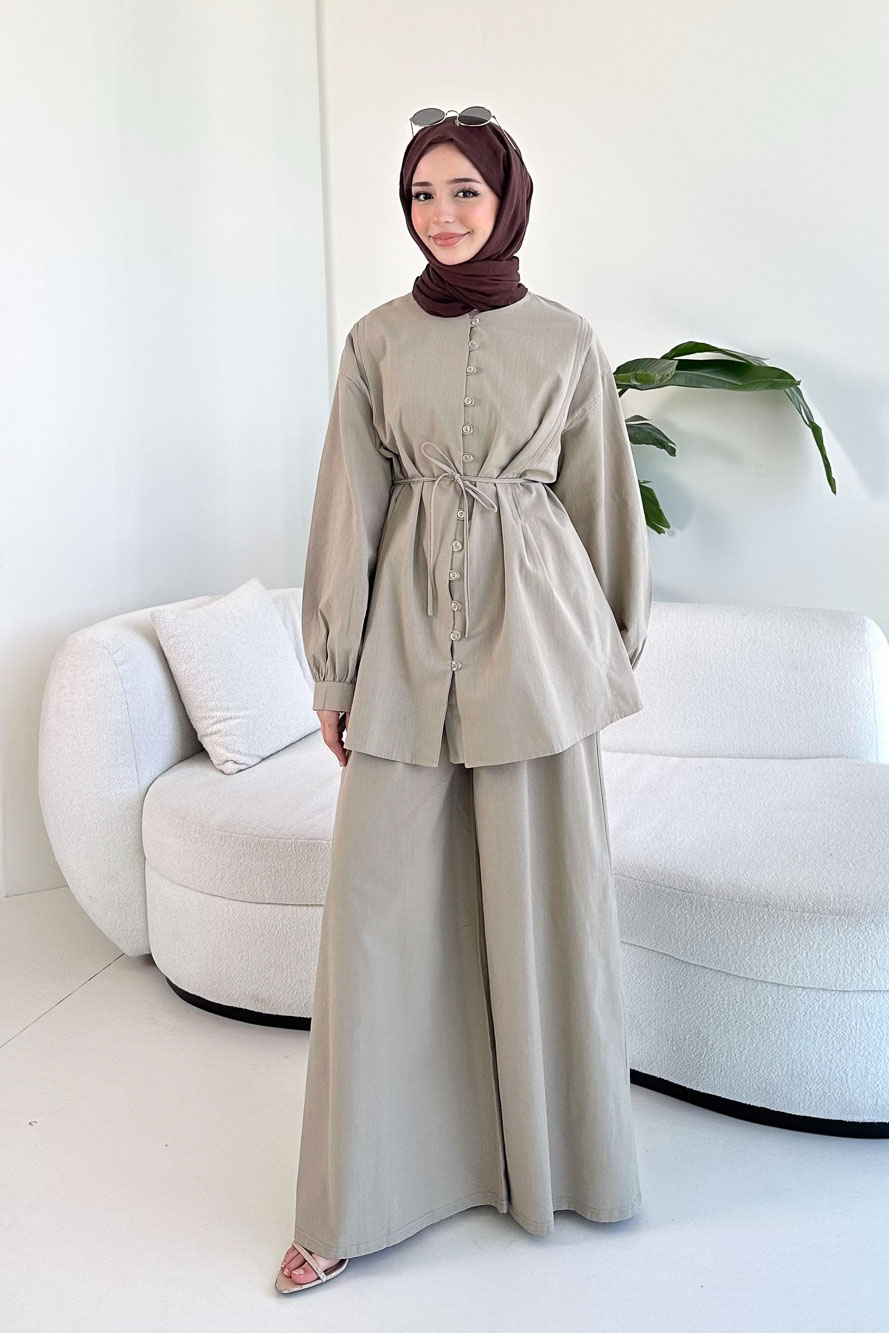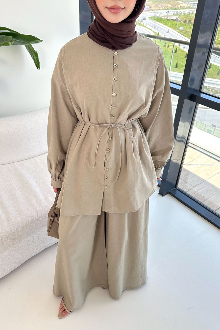 Bağcık Detaylı Keten Pantolon Takım - Vizon