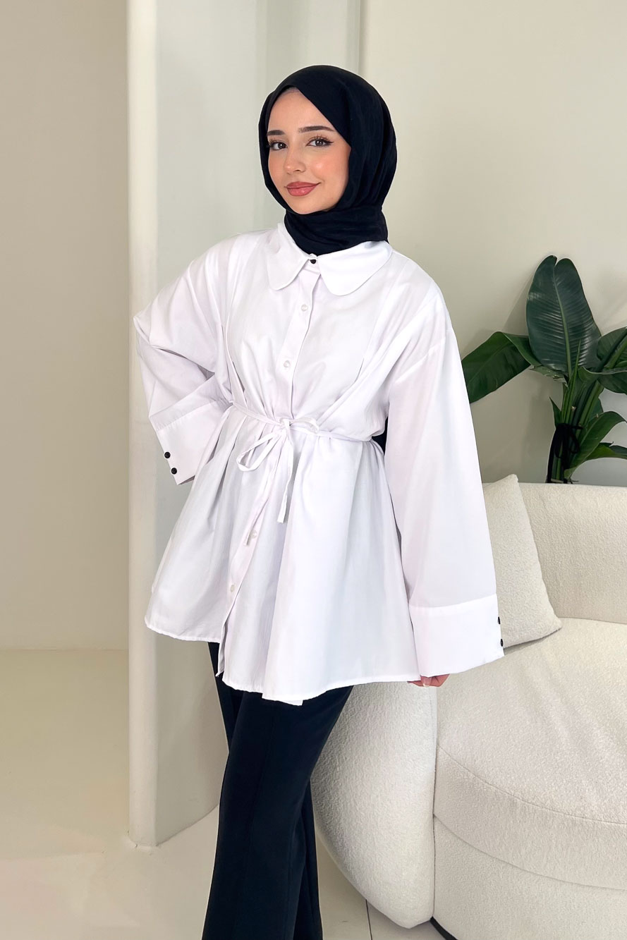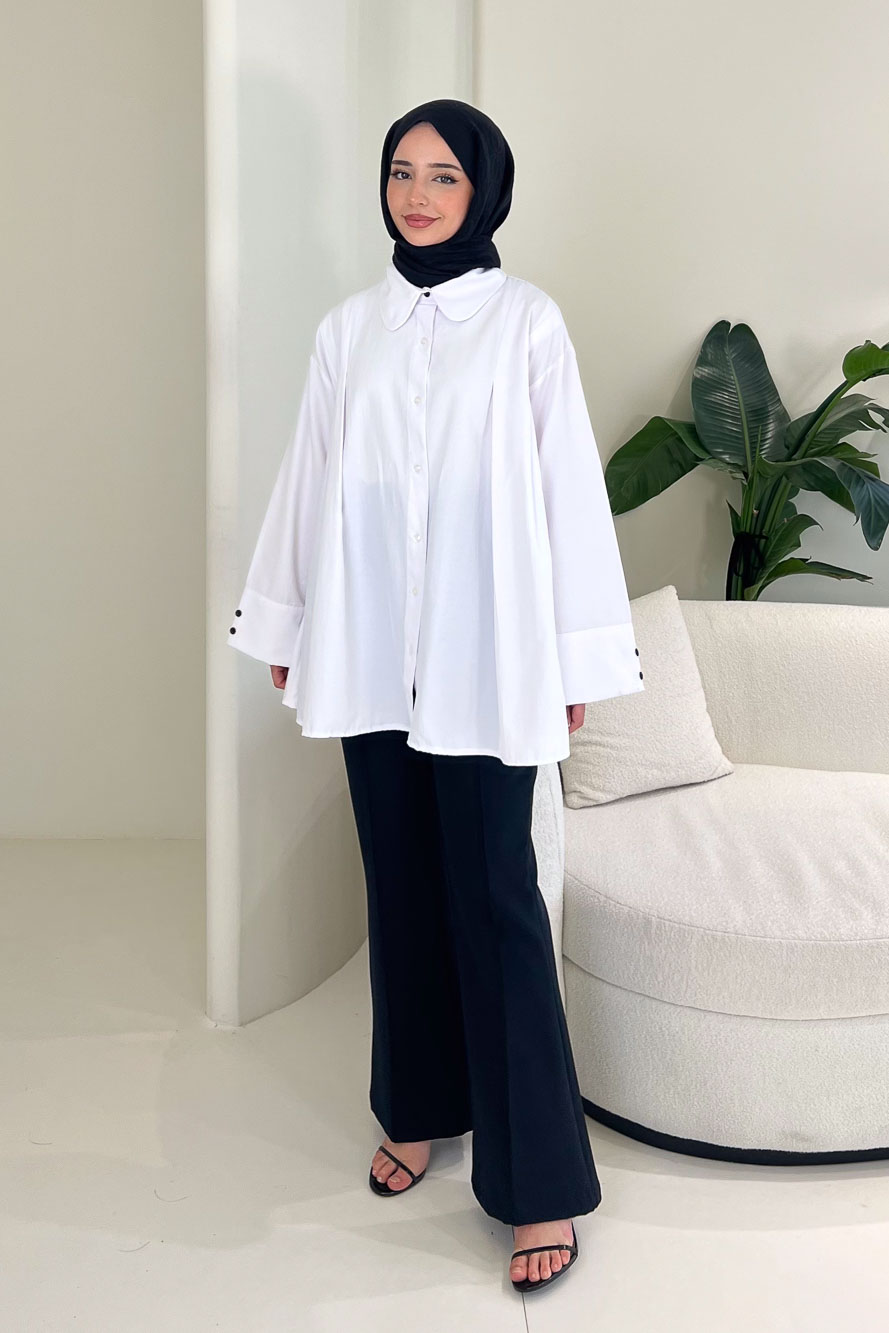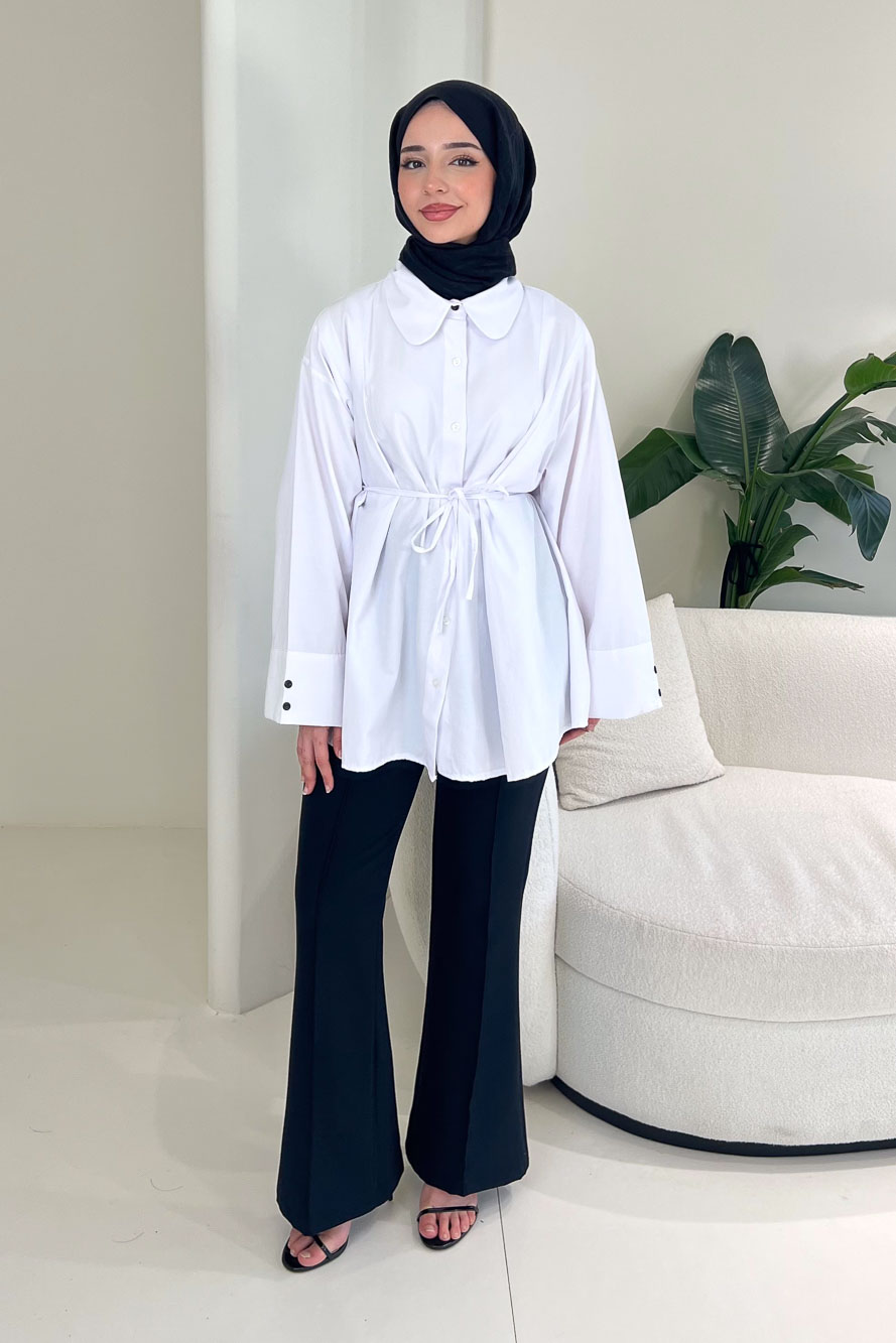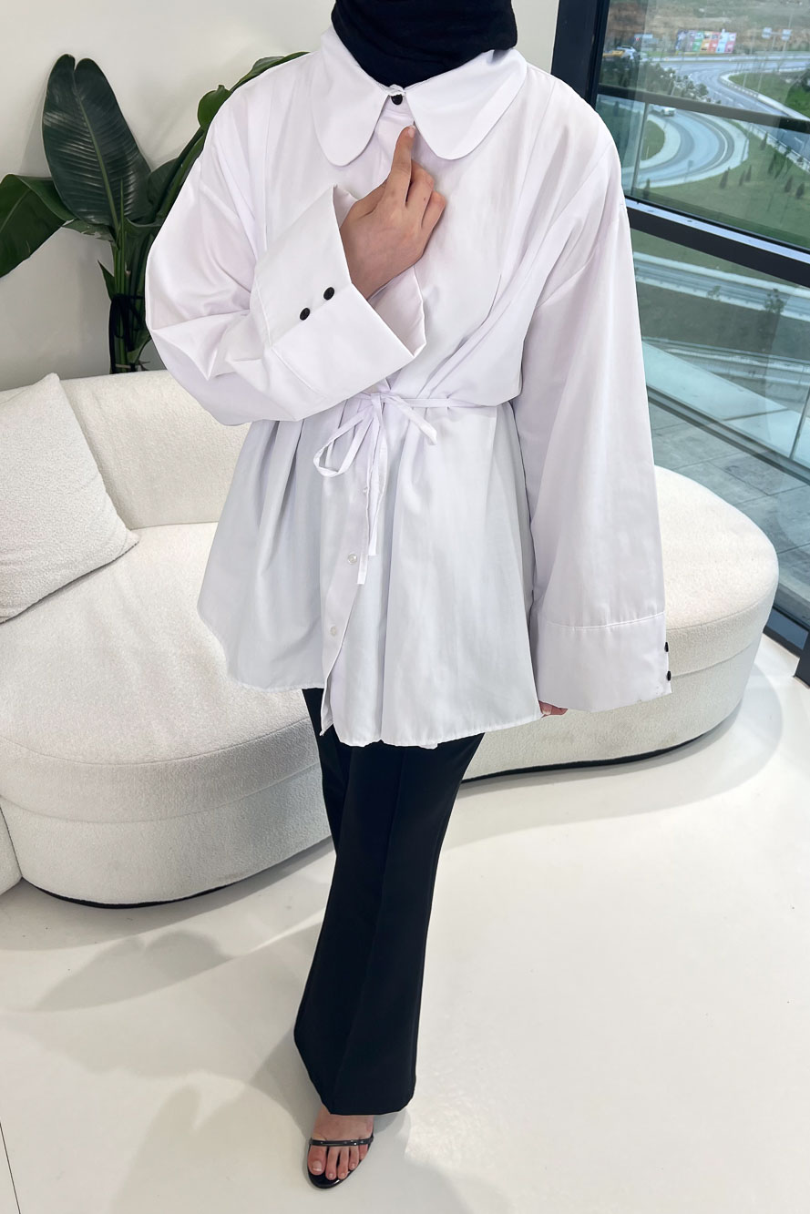 Bağcık Detaylı Pileli Gömlek - Beyaz