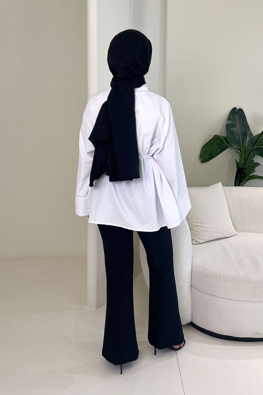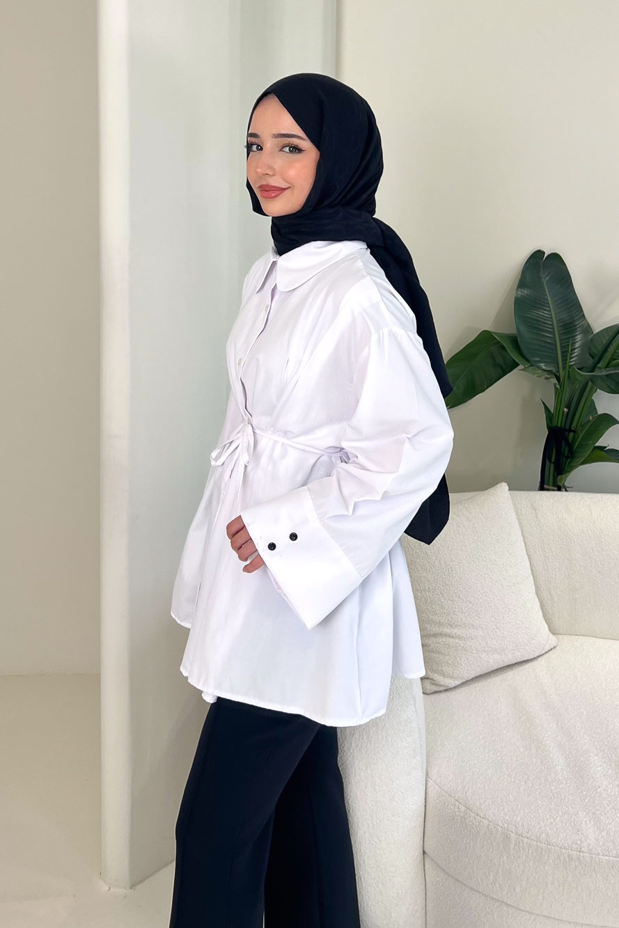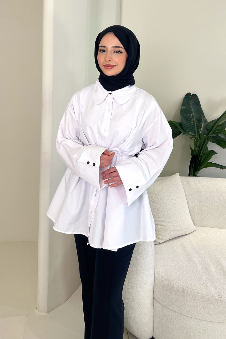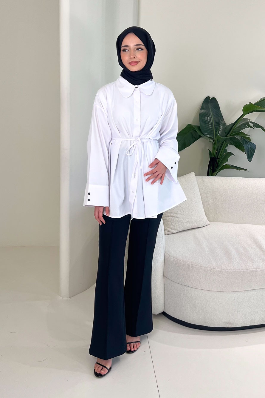 Bağcık Detaylı Pileli Gömlek - Beyaz