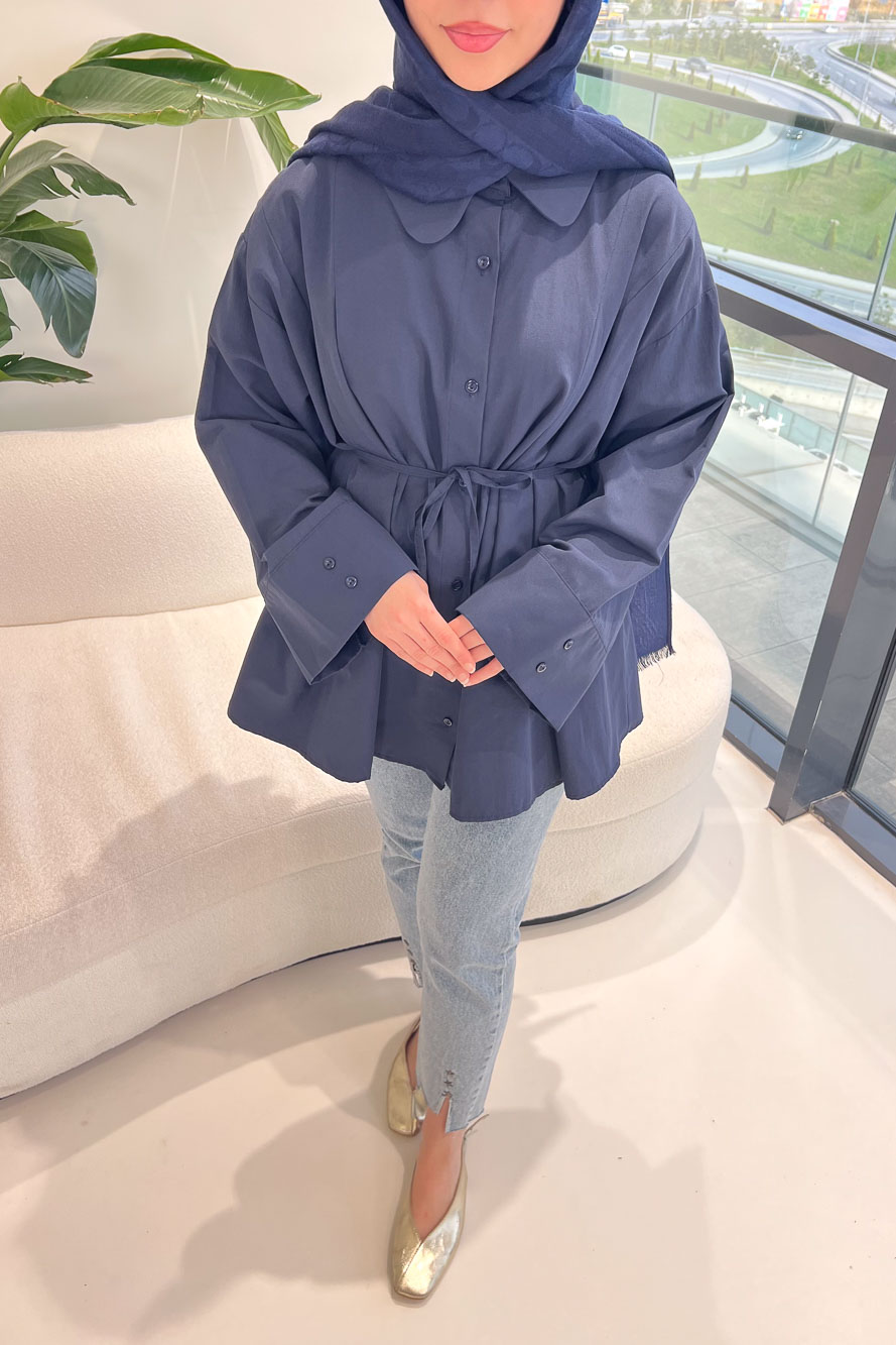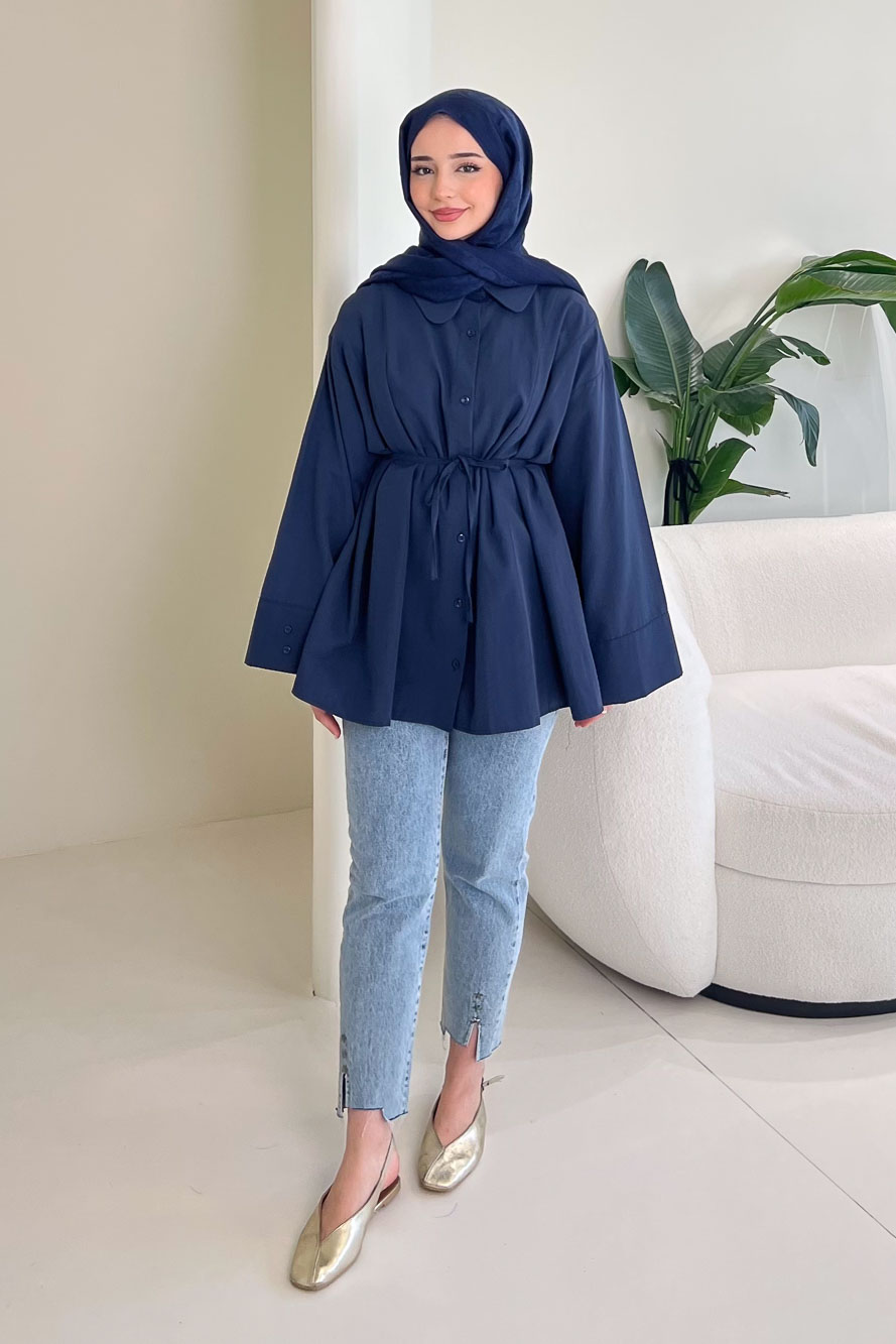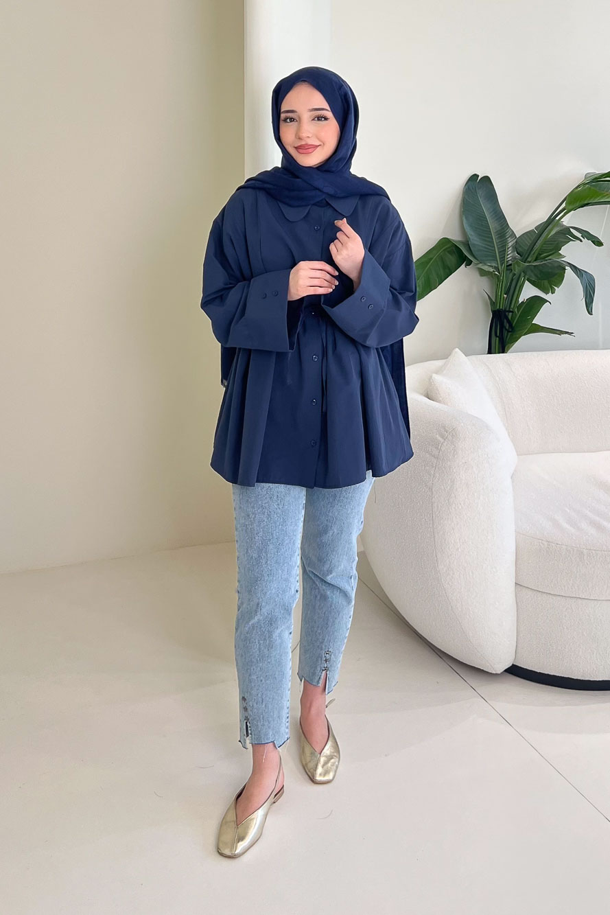 Bağcık Detaylı Pileli Gömlek - Lacivert