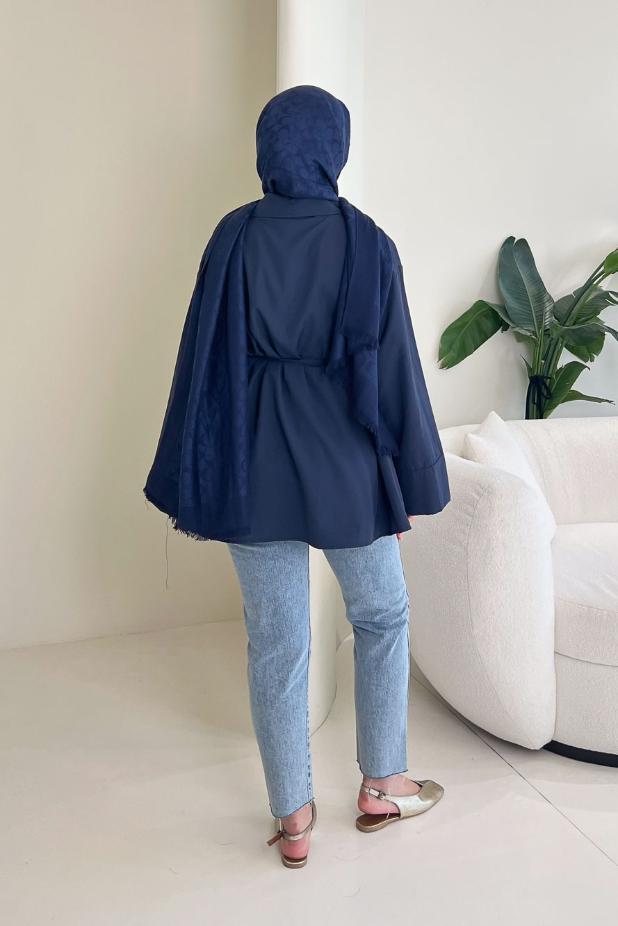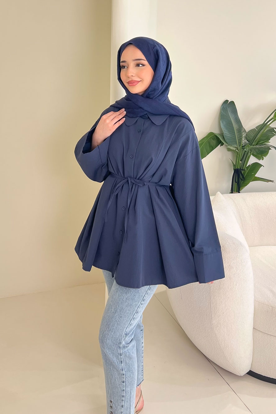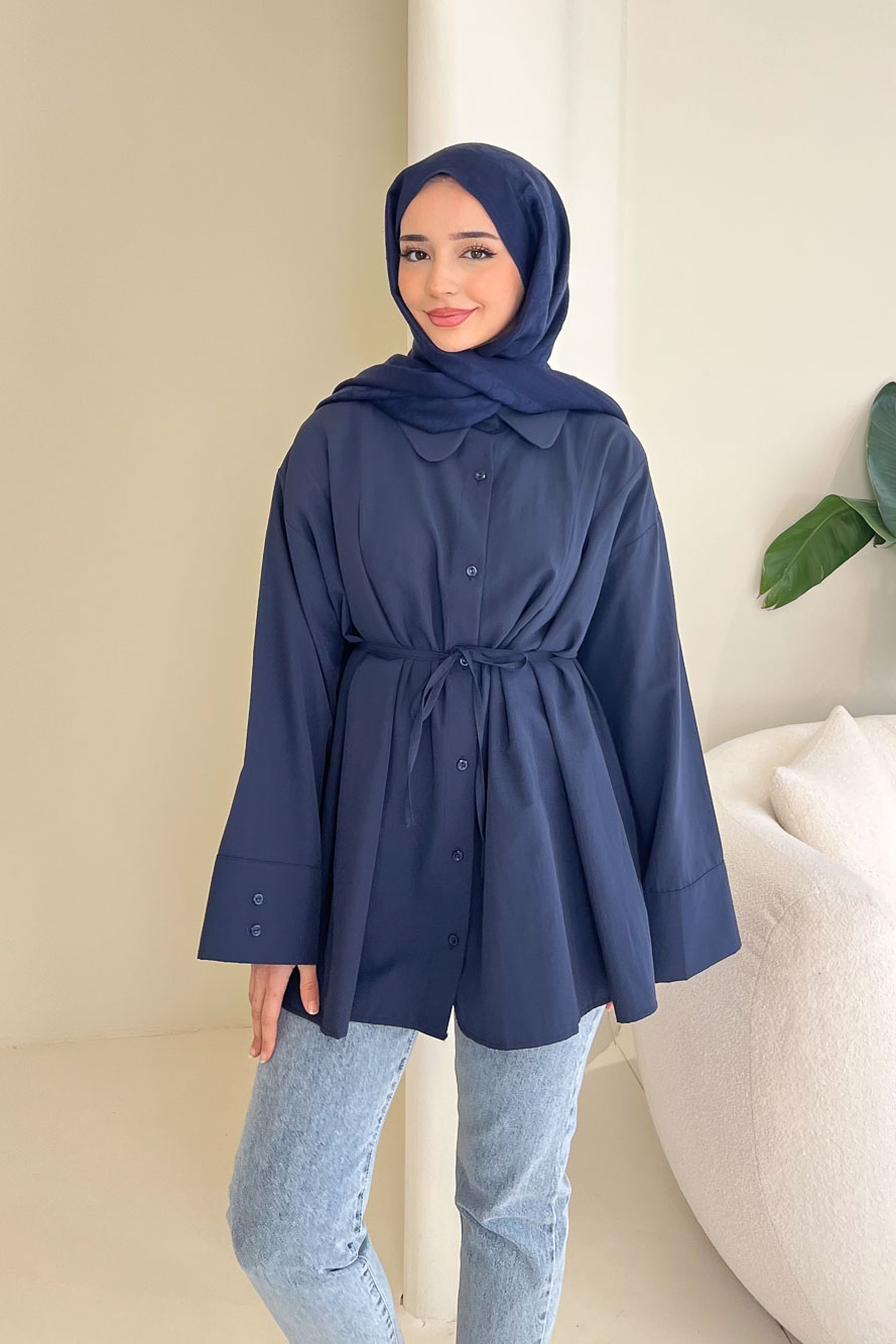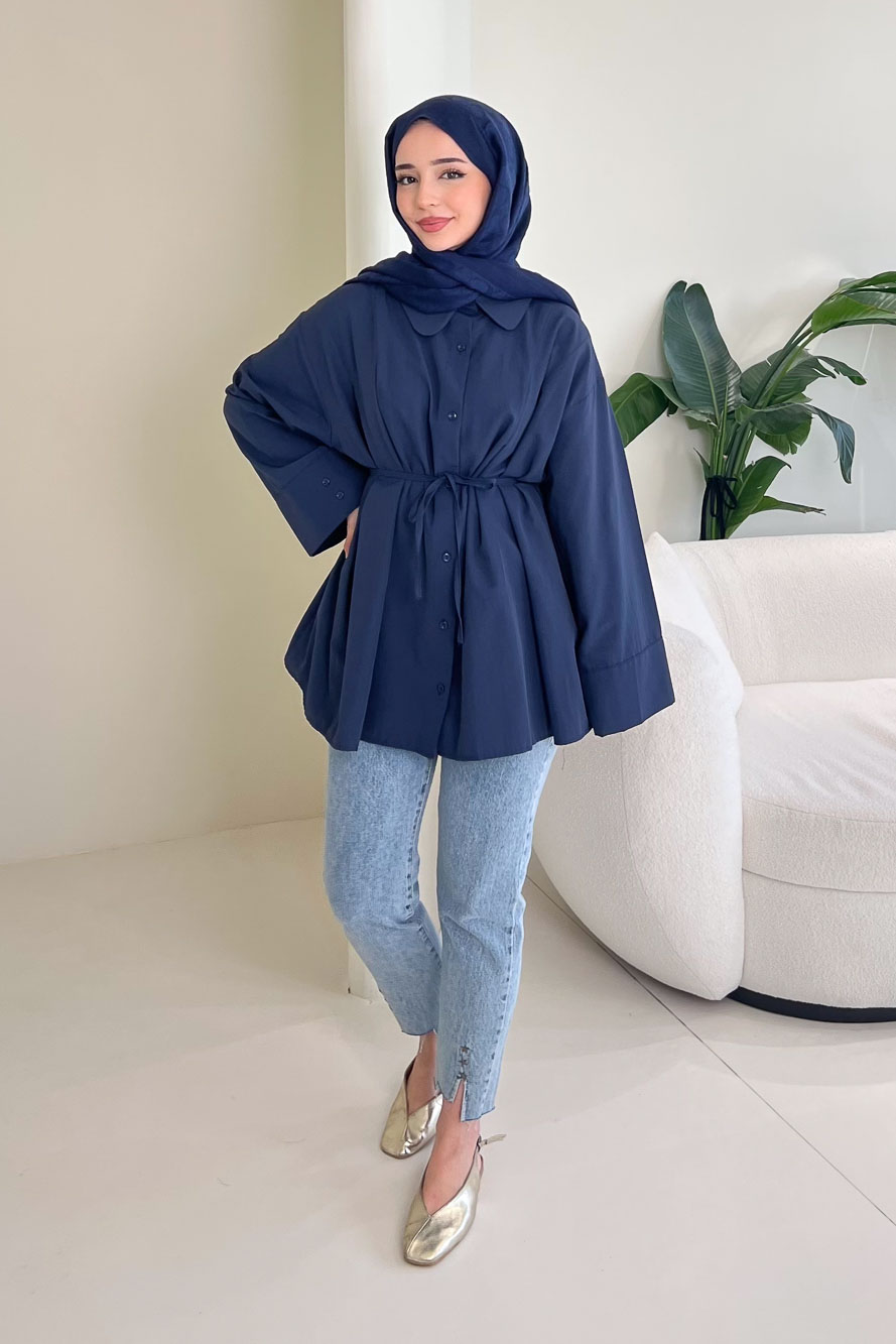 Bağcık Detaylı Pileli Gömlek - Lacivert