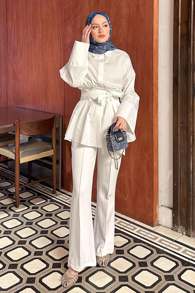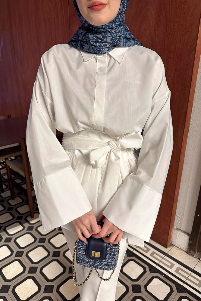 Beli Bağlamalı Geniş Kol Gömlek - Ekru