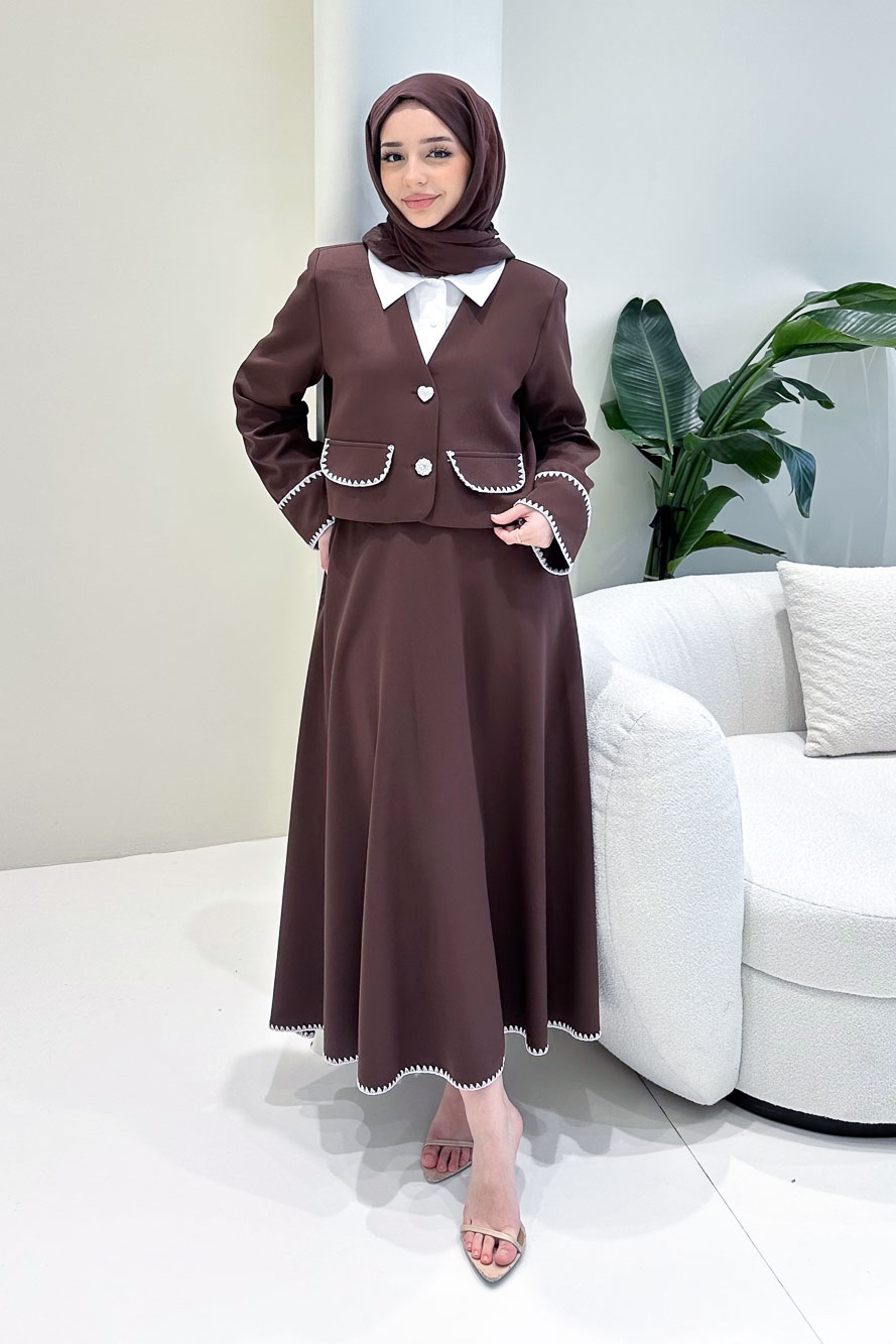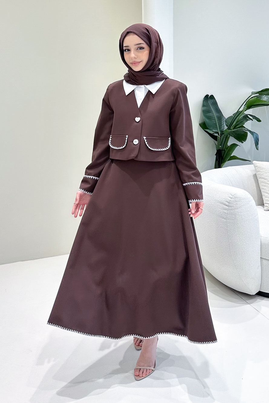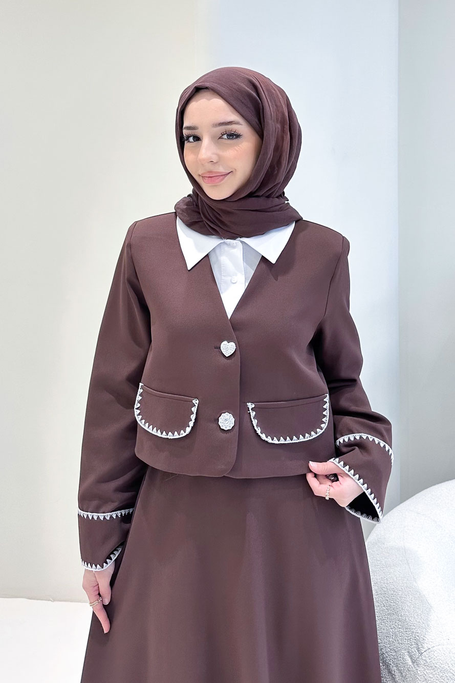 Astarlıdır. Gömlek detaylı tasarıma sahiptir. Ceketi kalp ve çiçek düğmelidir. Eteği fermuarlıdır, yarım lastiklidir ve etek ucu dikiş detaylıdır. Kolları cep detaylıdır. Manken üzerinde S bedendir.