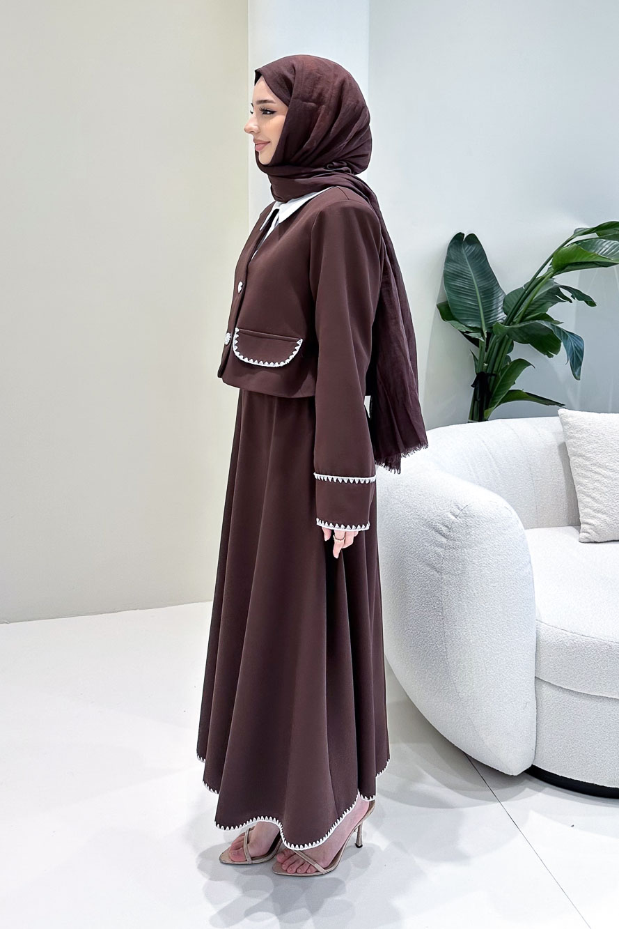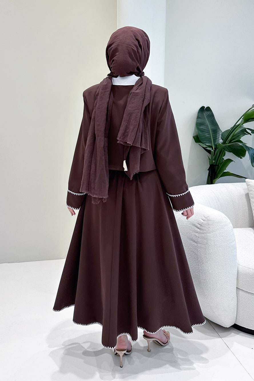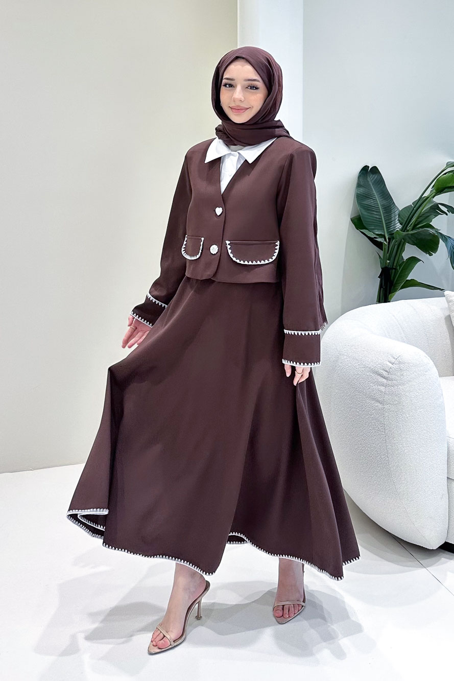 Astarlıdır. Gömlek detaylı tasarıma sahiptir. Ceketi kalp ve çiçek düğmelidir. Eteği fermuarlıdır, yarım lastiklidir ve etek ucu dikiş detaylıdır. Kolları cep detaylıdır. Manken üzerinde S bedendir.