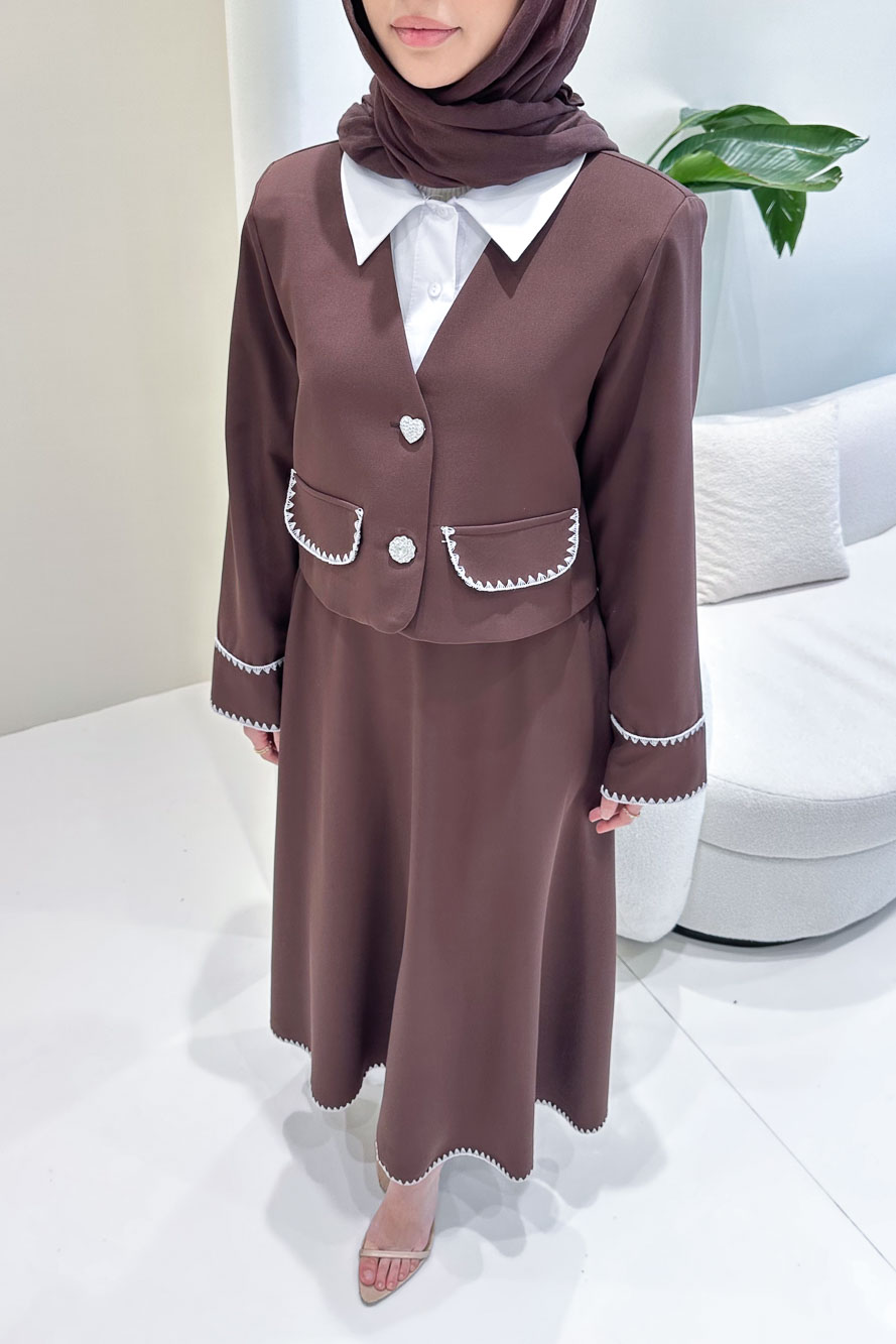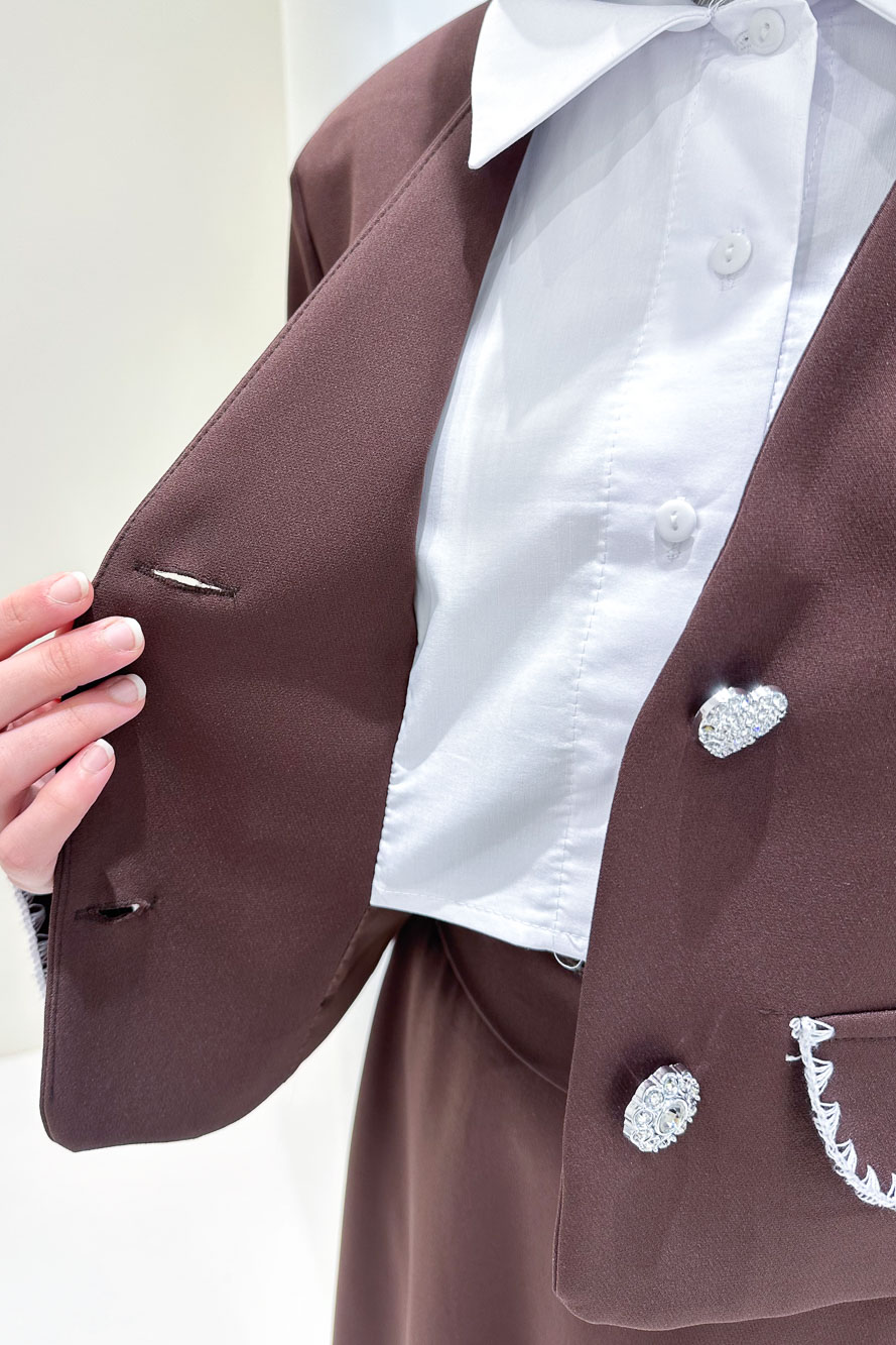 Kalp ve çiçek düğme detaylarıyla romantik bir dokunuş sunarken, modern kesimiyle zarif bir siluet oluşturur.