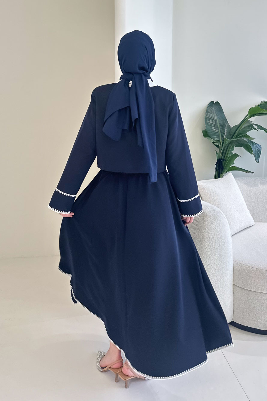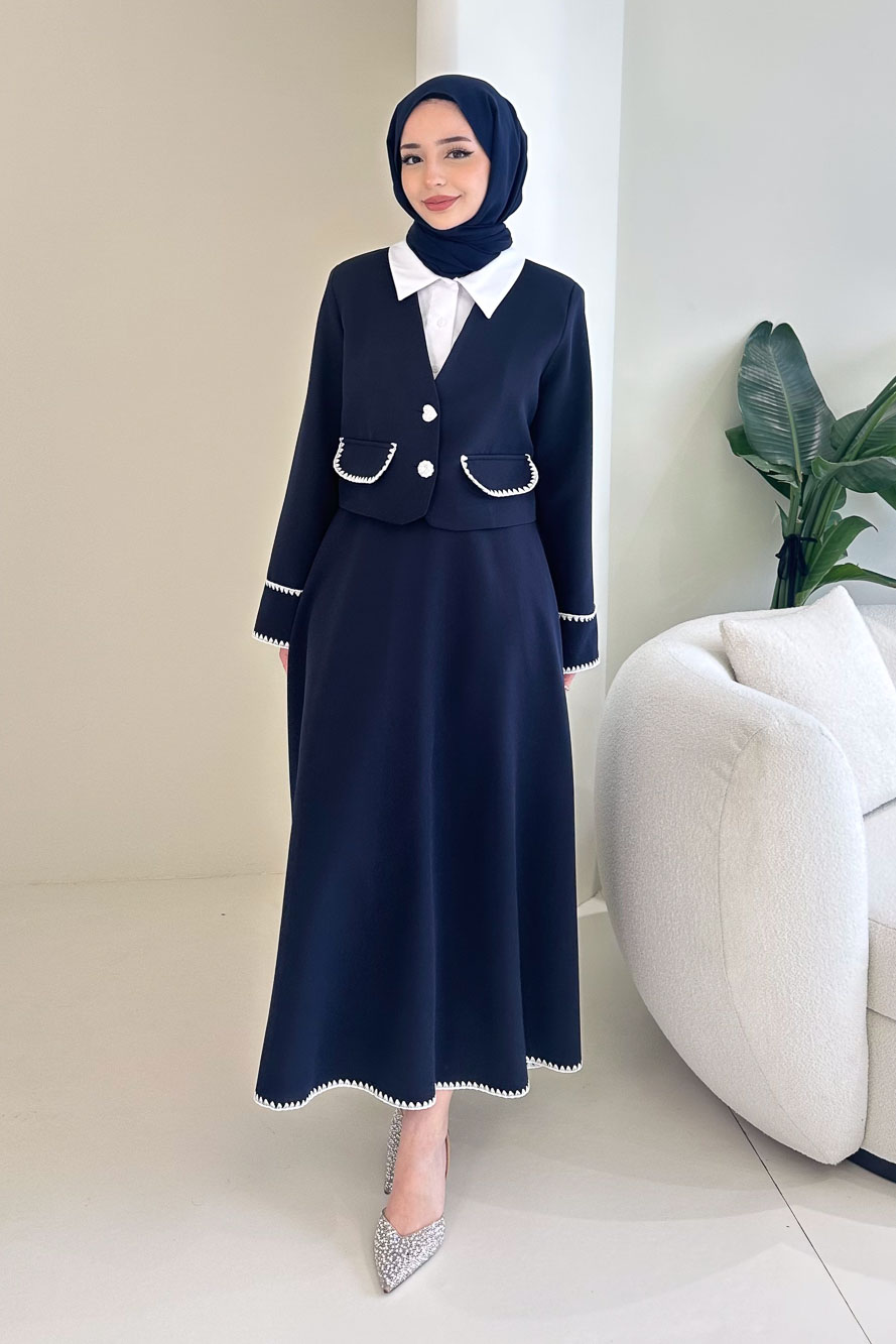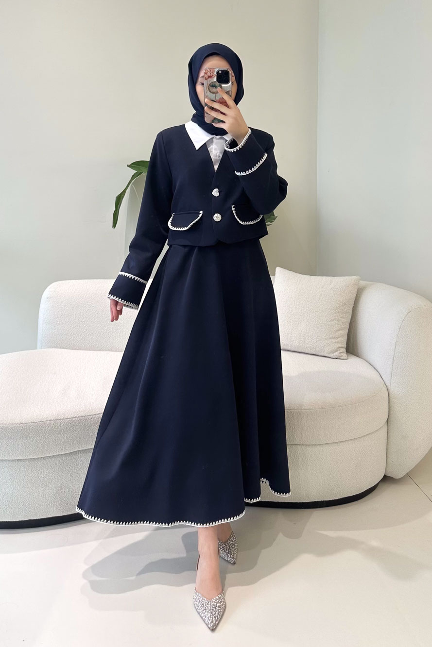 Astarlıdır. Gömlek detaylı tasarıma sahiptir. Ceketi kalp ve çiçek düğmelidir. Eteği fermuarlıdır, yarım lastiklidir ve etek ucu dikiş detaylıdır. Kolları cep detaylıdır. Manken üzerinde S bedendir.