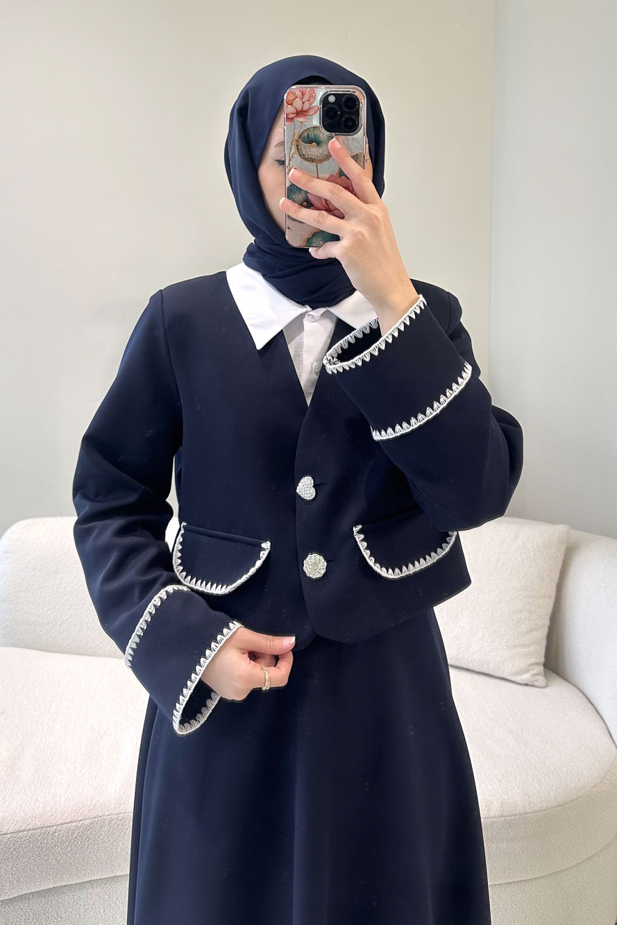 Kalp ve çiçek düğme detaylarıyla romantik bir dokunuş sunarken, modern kesimiyle zarif bir siluet oluşturur.