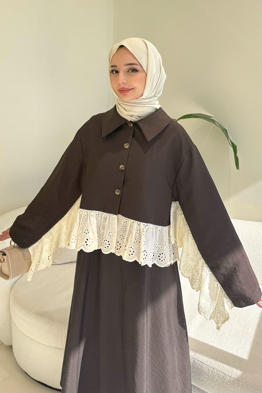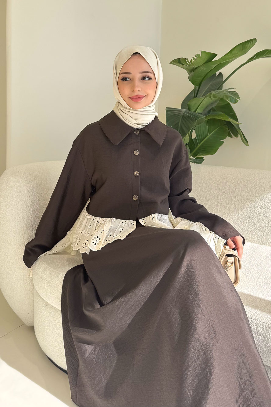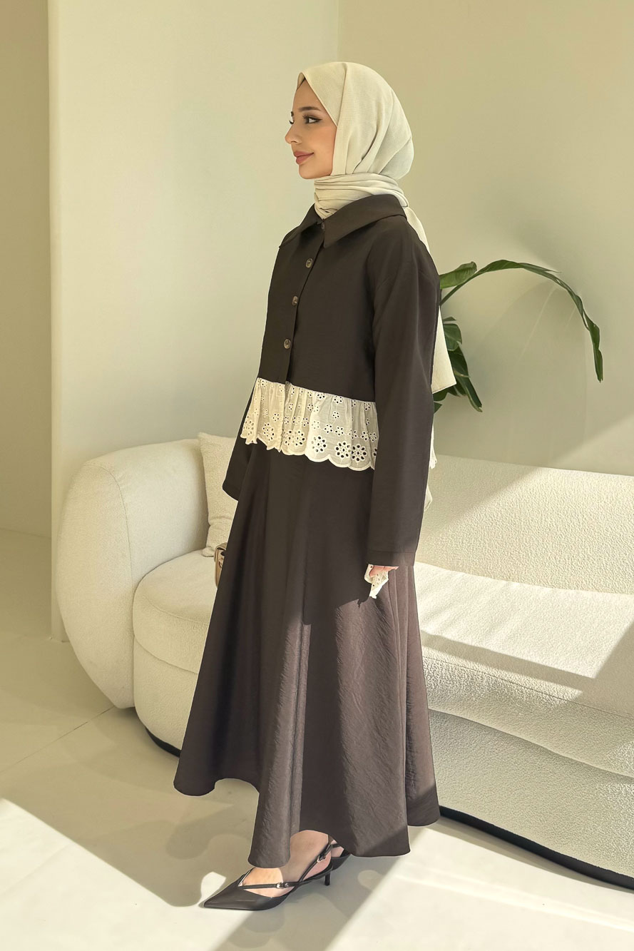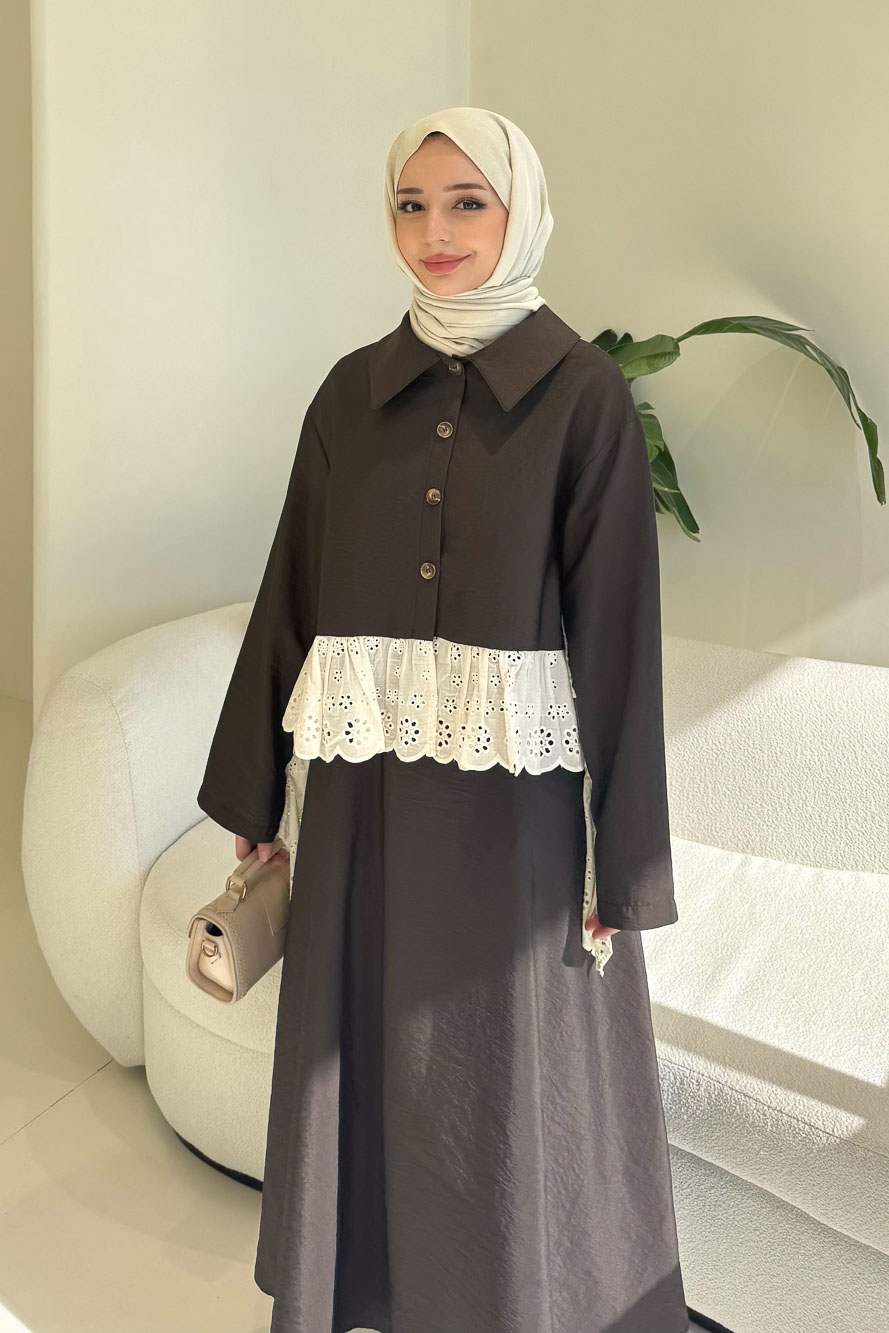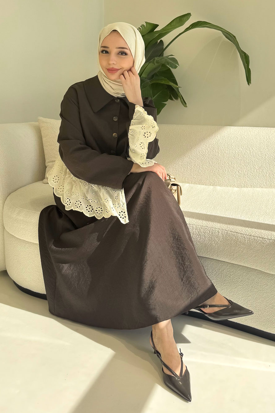 Brodeli üst tasarımı ve zarif düğme detaylarıyla feminen ve dengeli bir siluet sunar.
