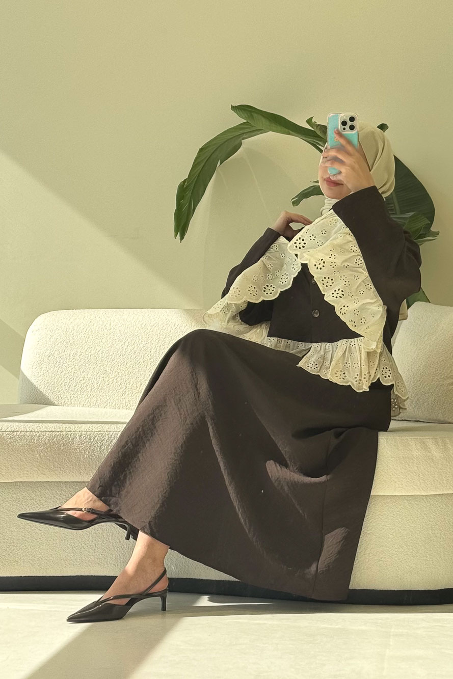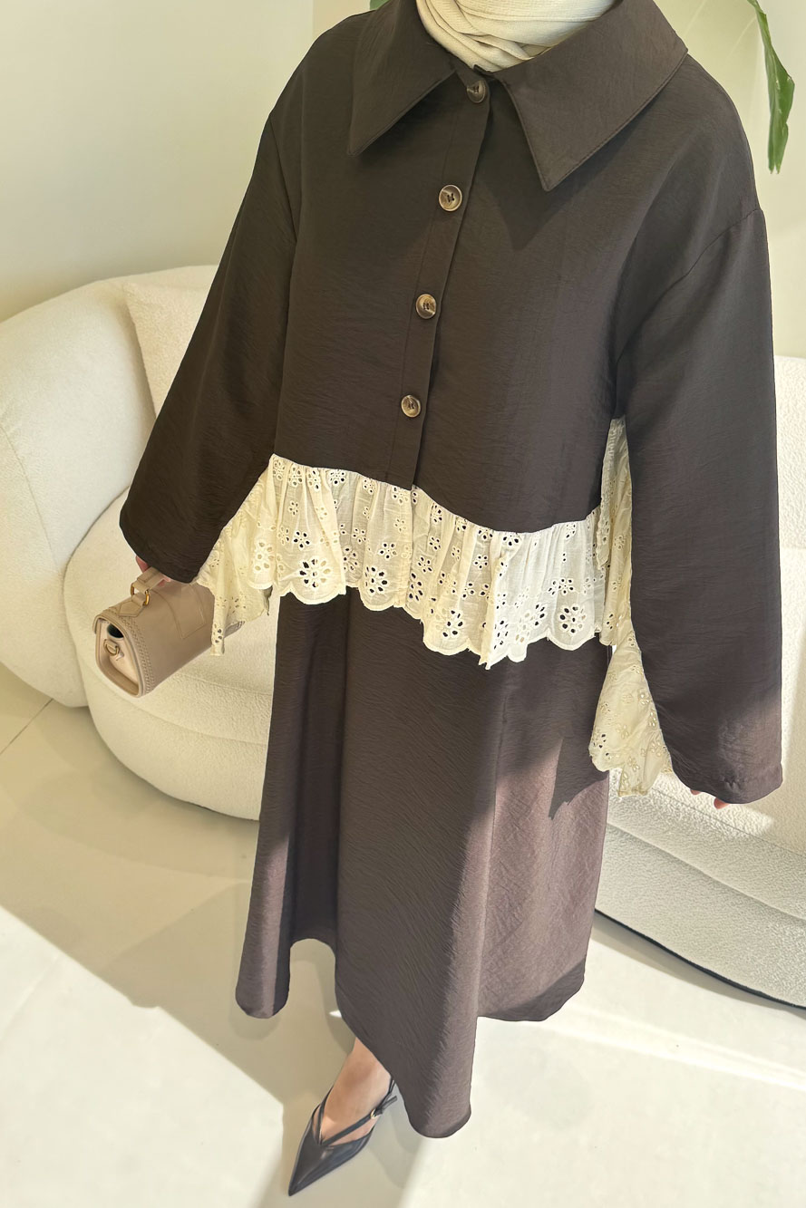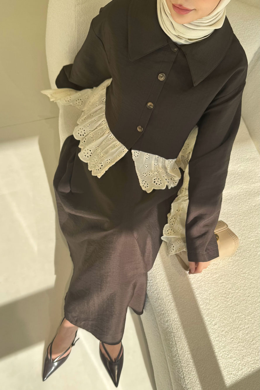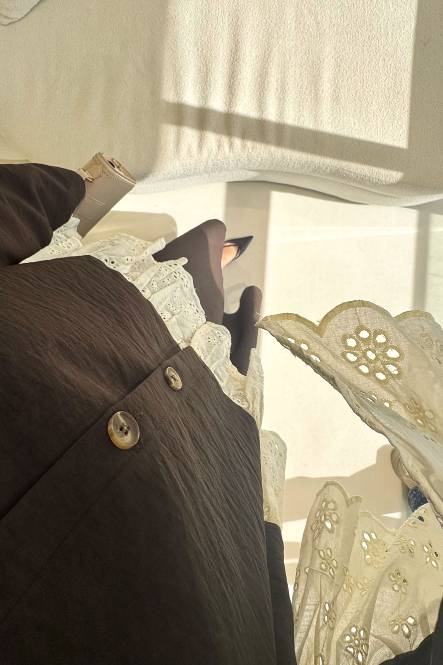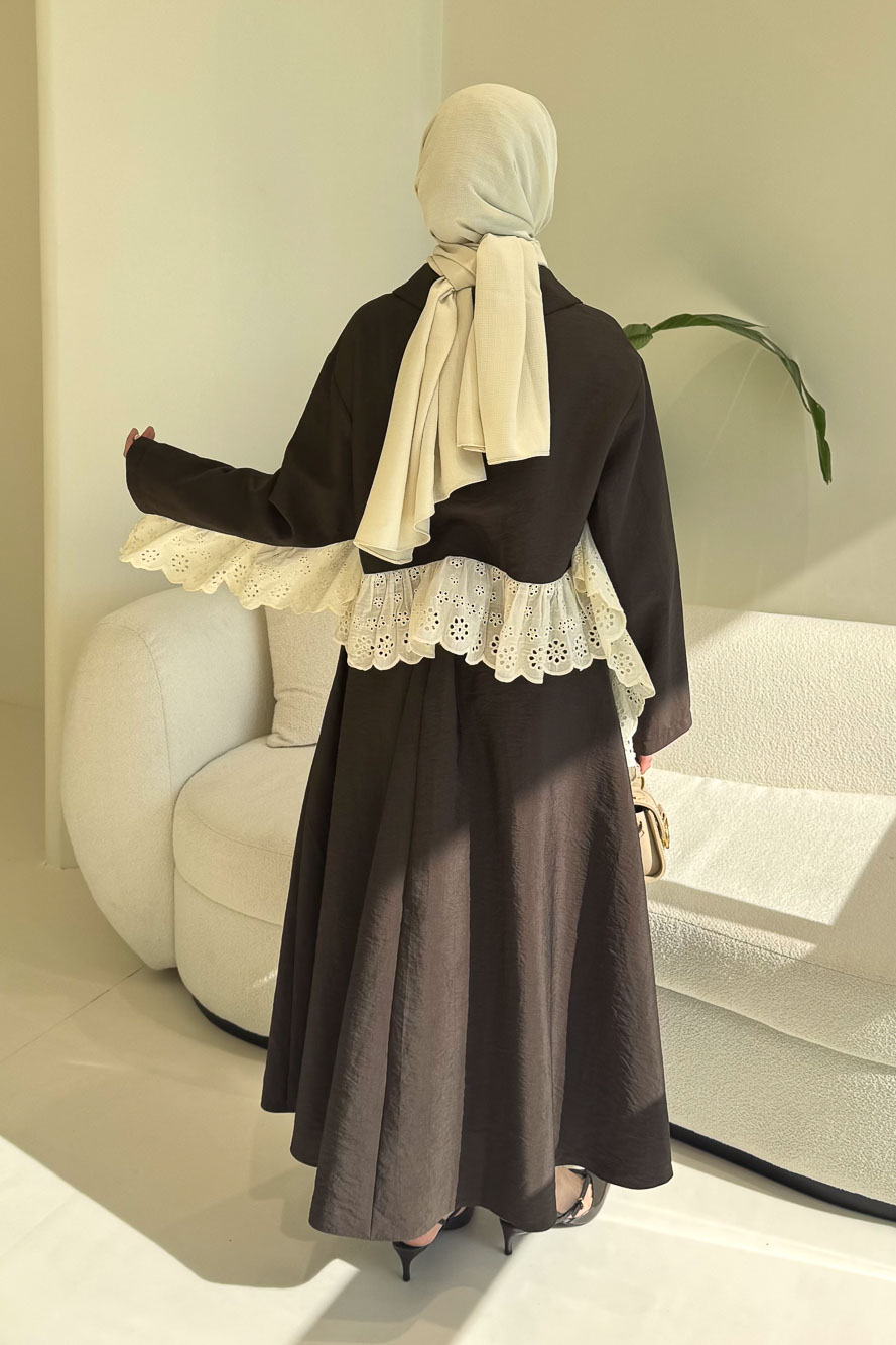 Brodeli üst tasarımı ve zarif düğme detaylarıyla feminen ve dengeli bir siluet sunar.