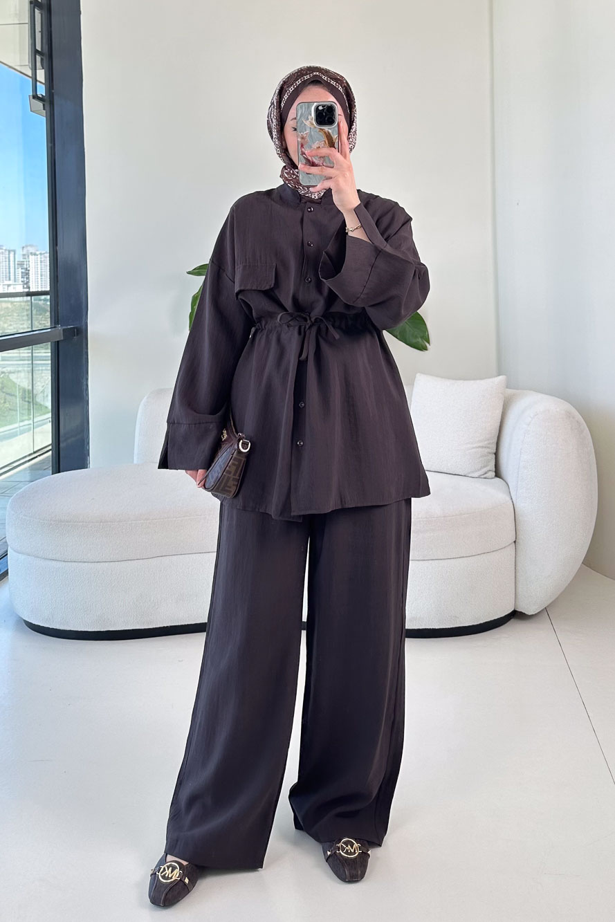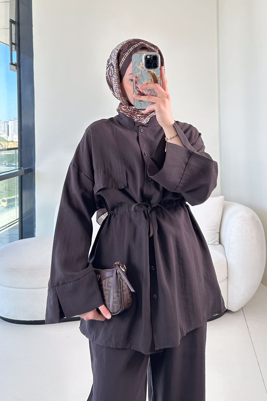 Üst kısmındaki bağcık ve büzgü detayları takıma hareketli bir görünüm kazandırırken, kol manşetlerindeki yırtmaç detayı modern bir dokunuş sağlar. Pantolonun tam lastikli beli konfor sunarken, cepli yapısı kullanım kolaylığı sağlar. Rahat kesimi ile günlük kombinler için ideal bir tercihtir. Manken üzerinde 1 bedendir.