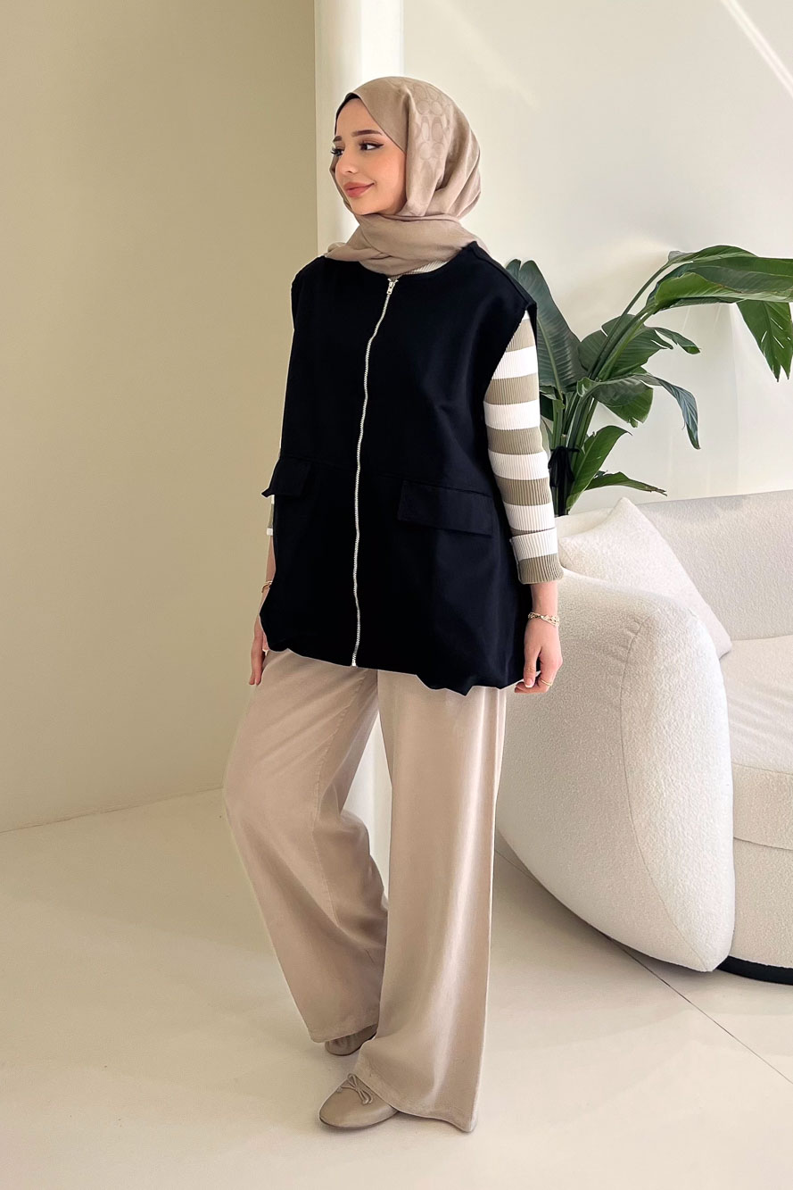Cepli Fermuarlı Yelek - Siyah