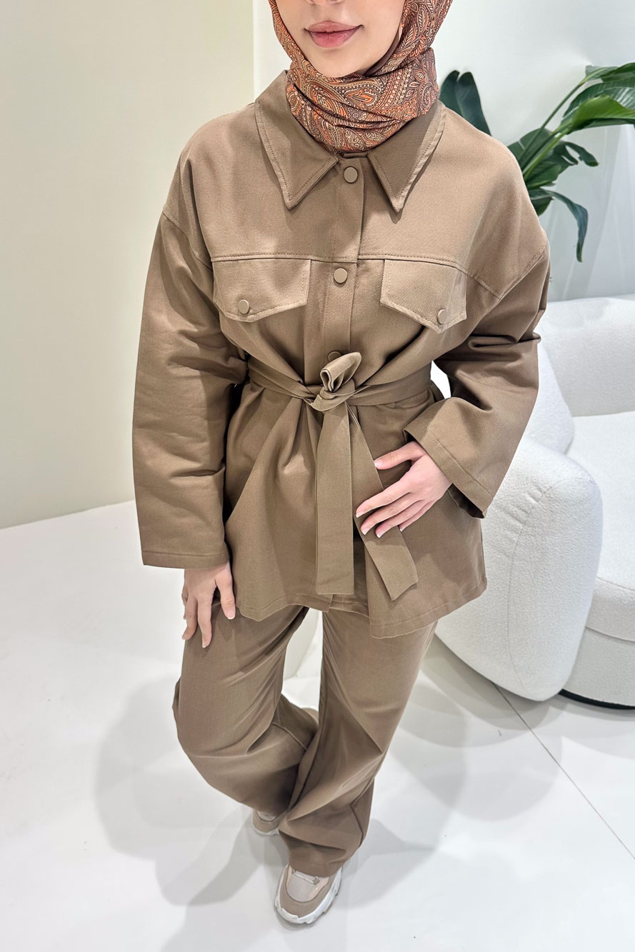 Nova Kot Pantolon Tunik Cepli Düğmeli Takım - Kahverengi