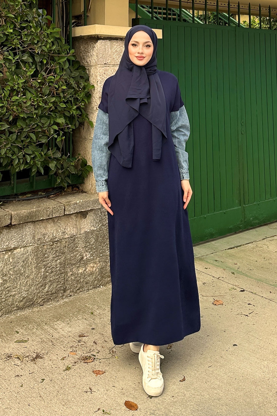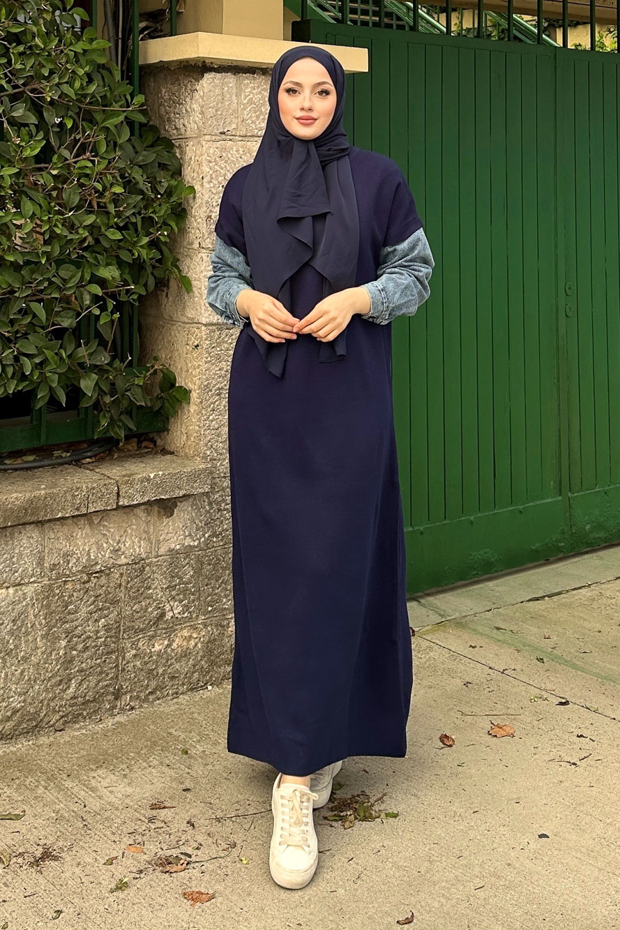 Denim Detaylı Triko Elbise - Lacivert
