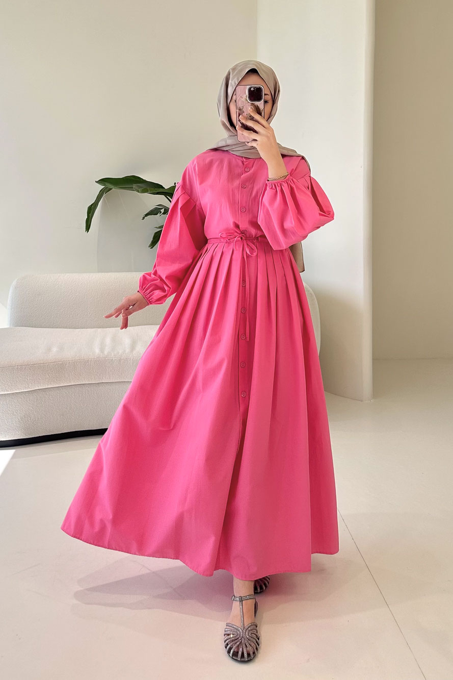 Düğmeli Bel Büzgülü Elbise - Pembe