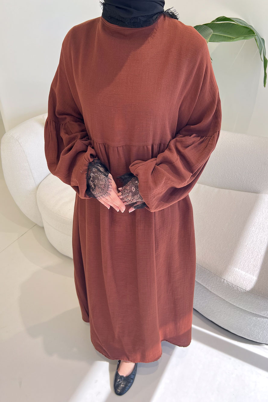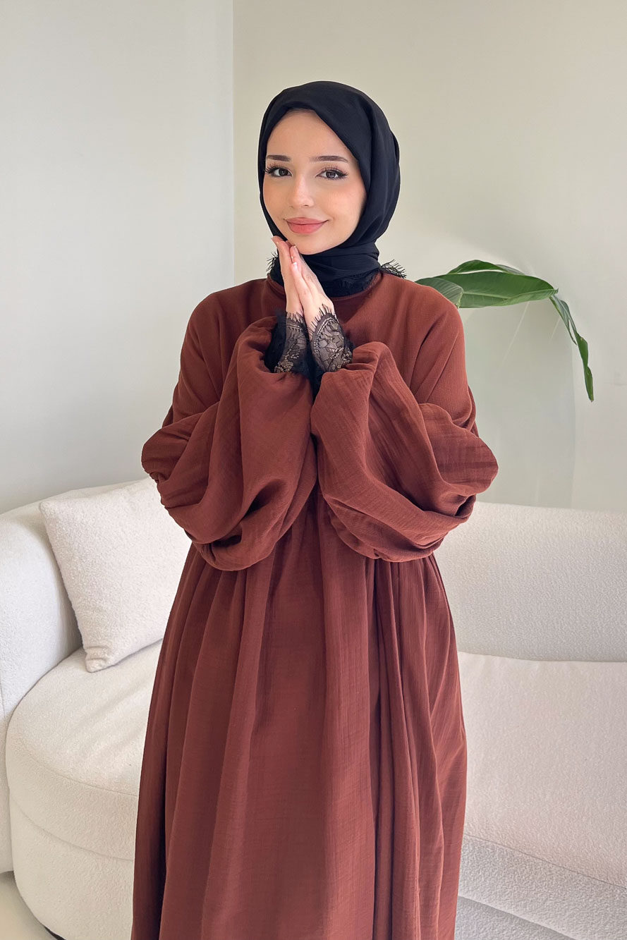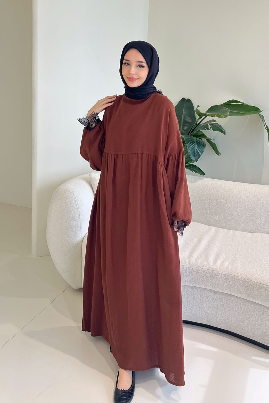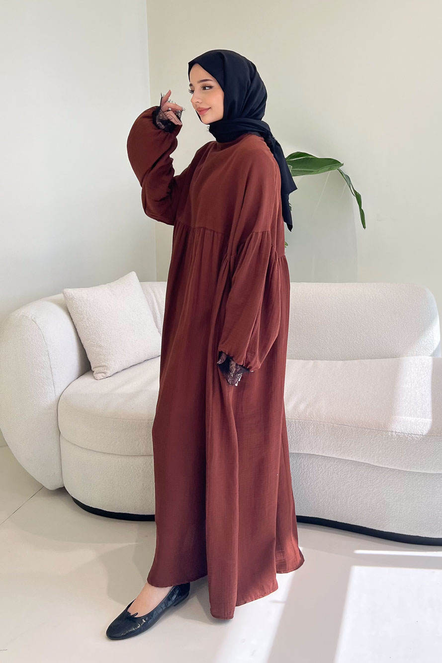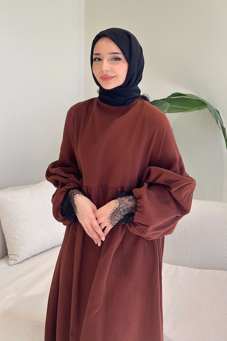 Elaria Dantel Detaylı Müslin Elbise - Kahverengi