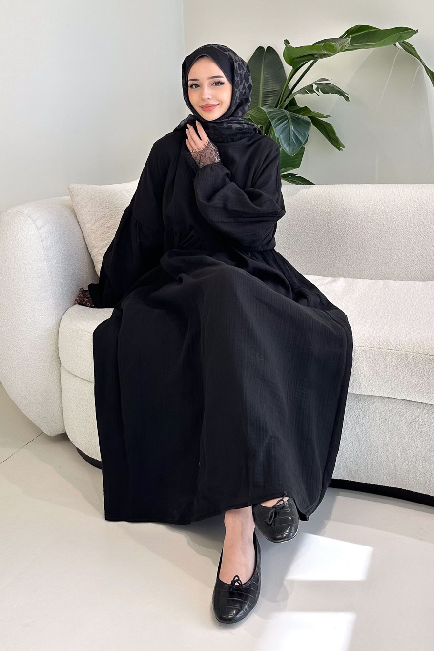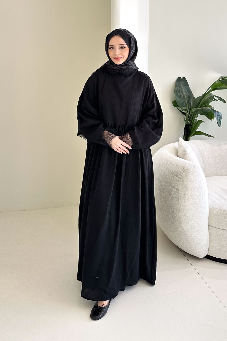 Elaria Dantel Detaylı Müslin Elbise - Siyah