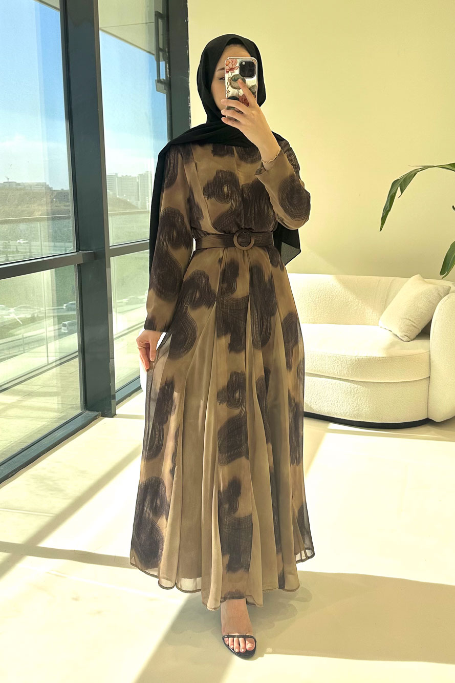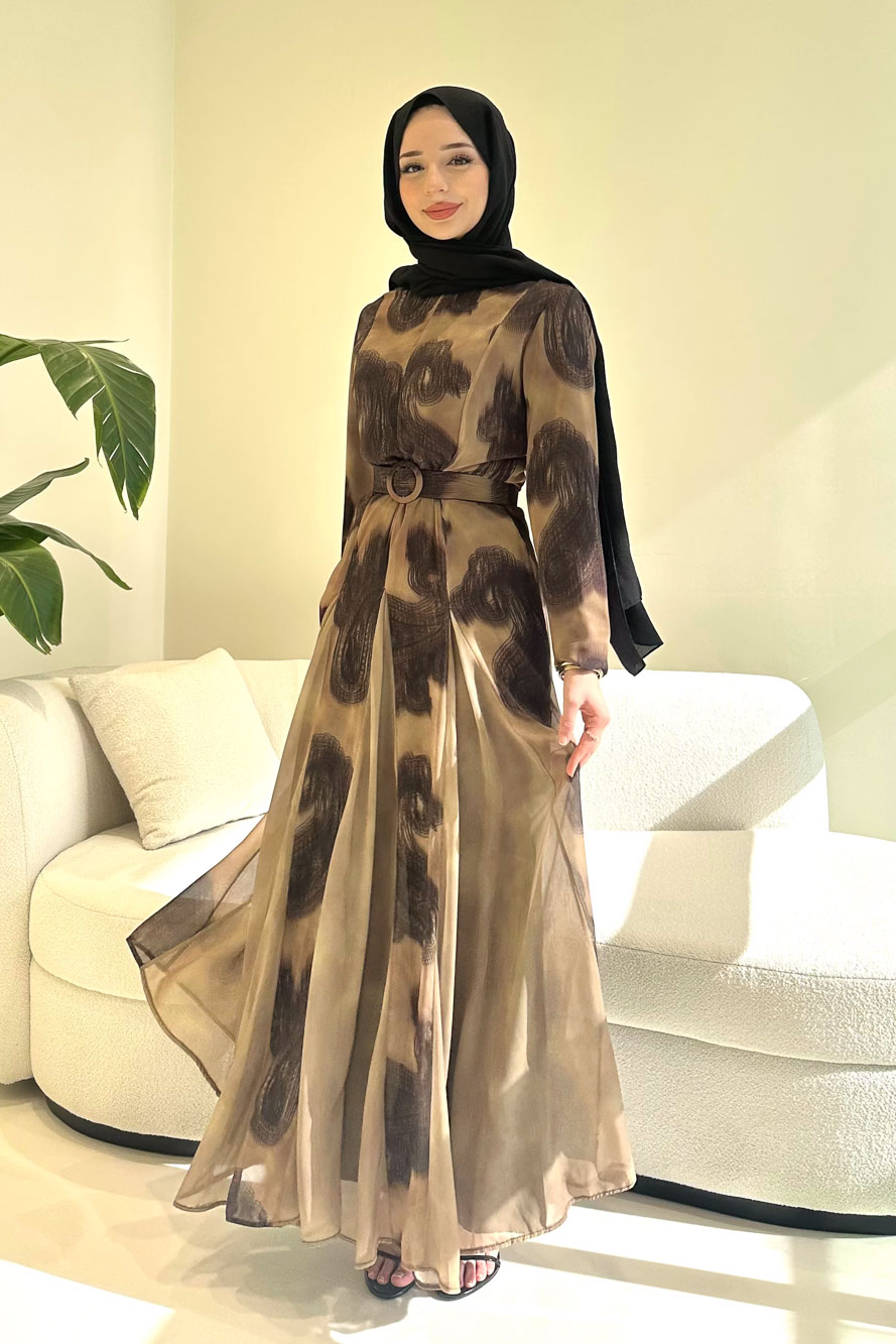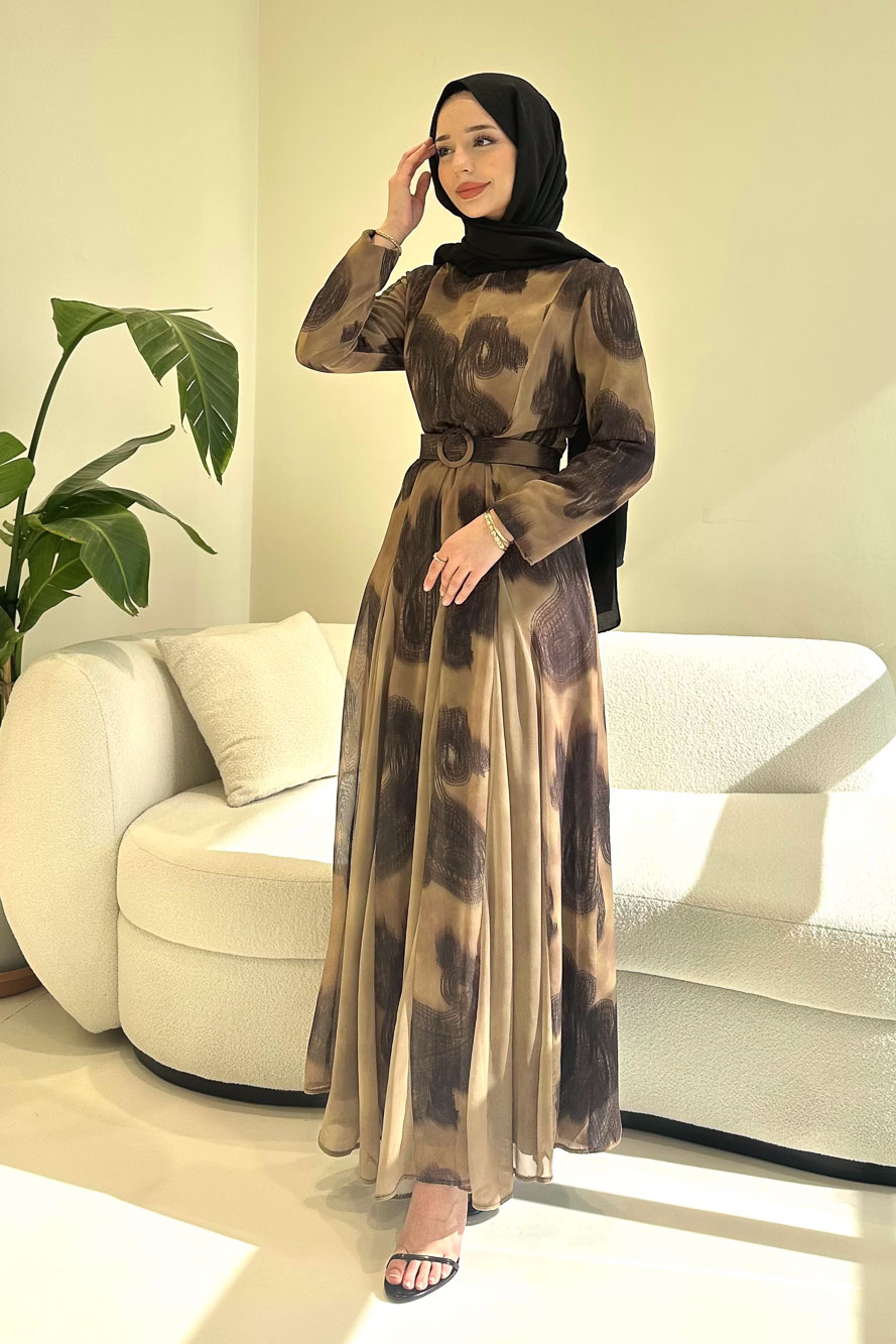 Akışkan şifon dokusu ve alt bölümdeki desen geçişiyle zarif ve hareketli bir siluet sunar.