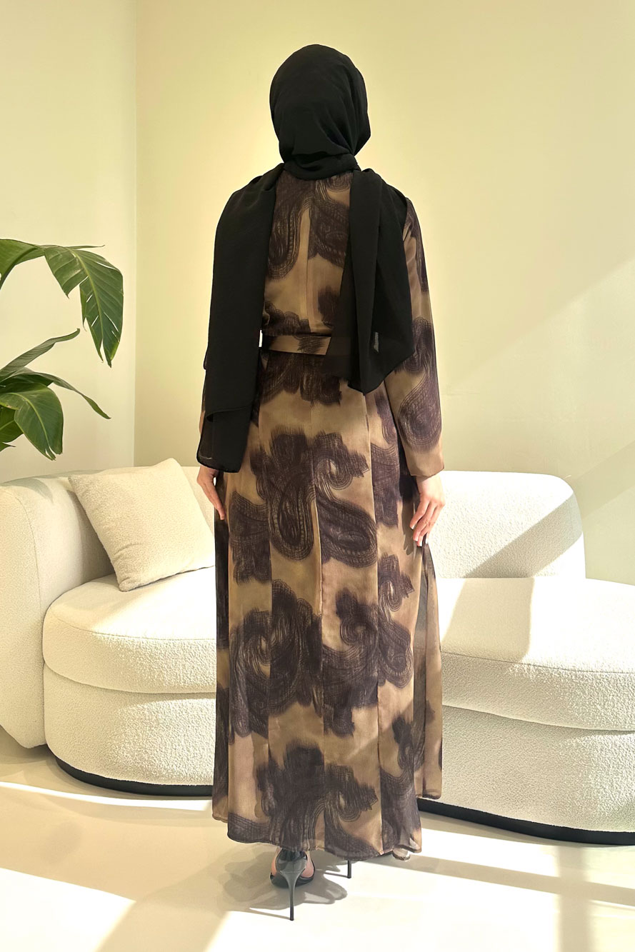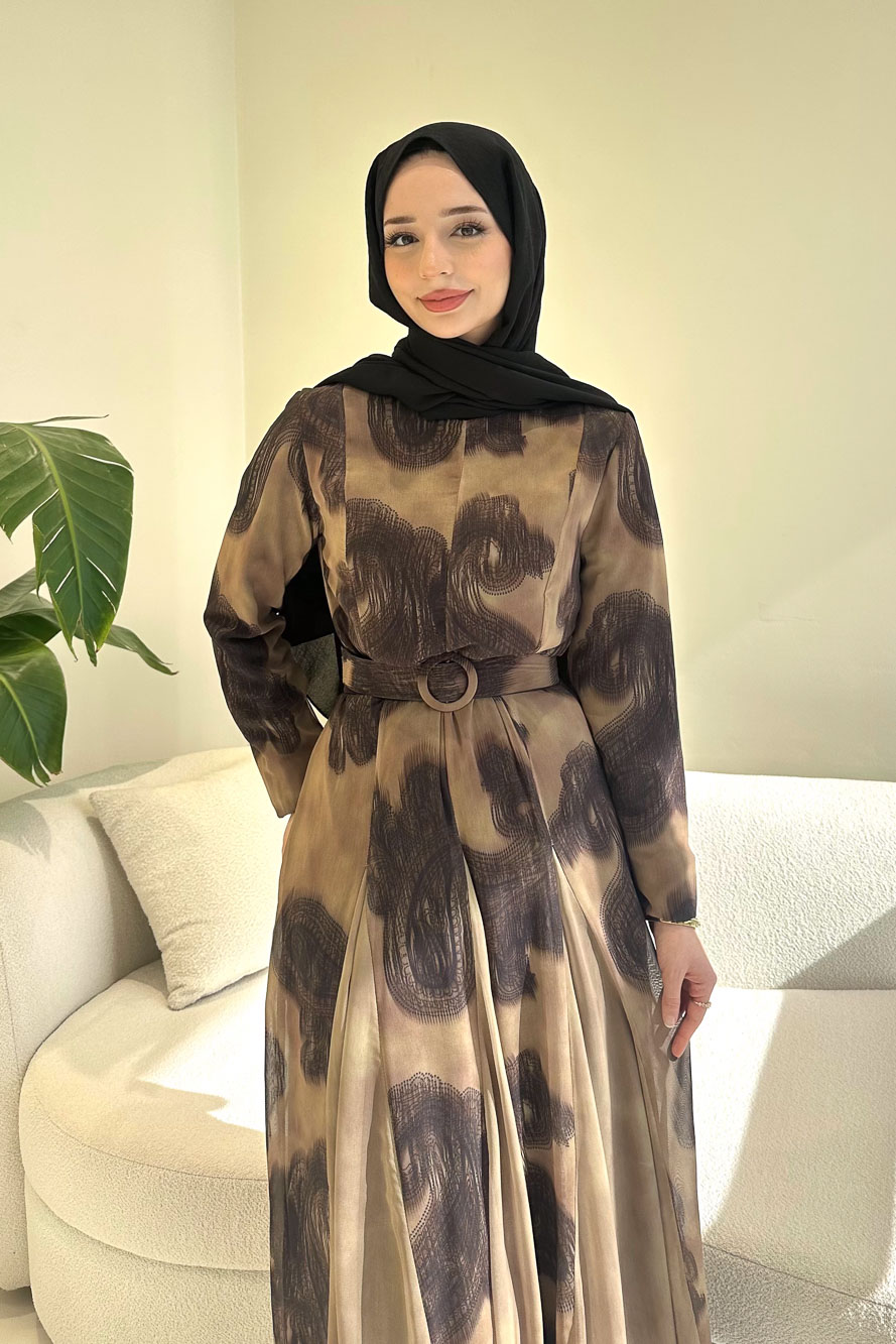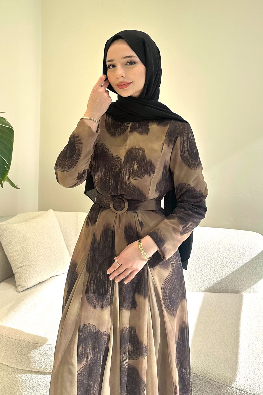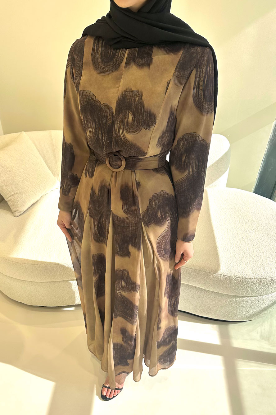Akışkan şifon dokusu ve alt bölümdeki desen geçişiyle zarif ve hareketli bir siluet sunar.