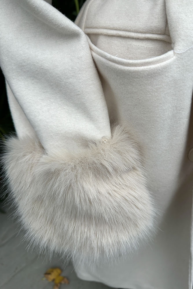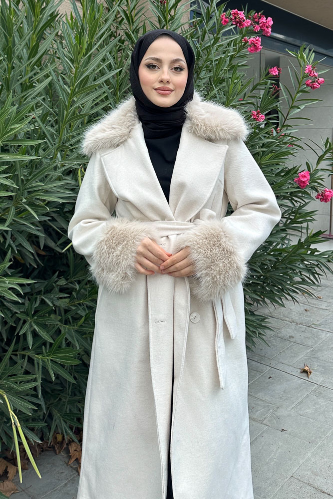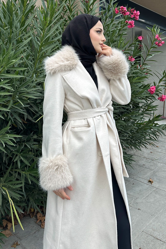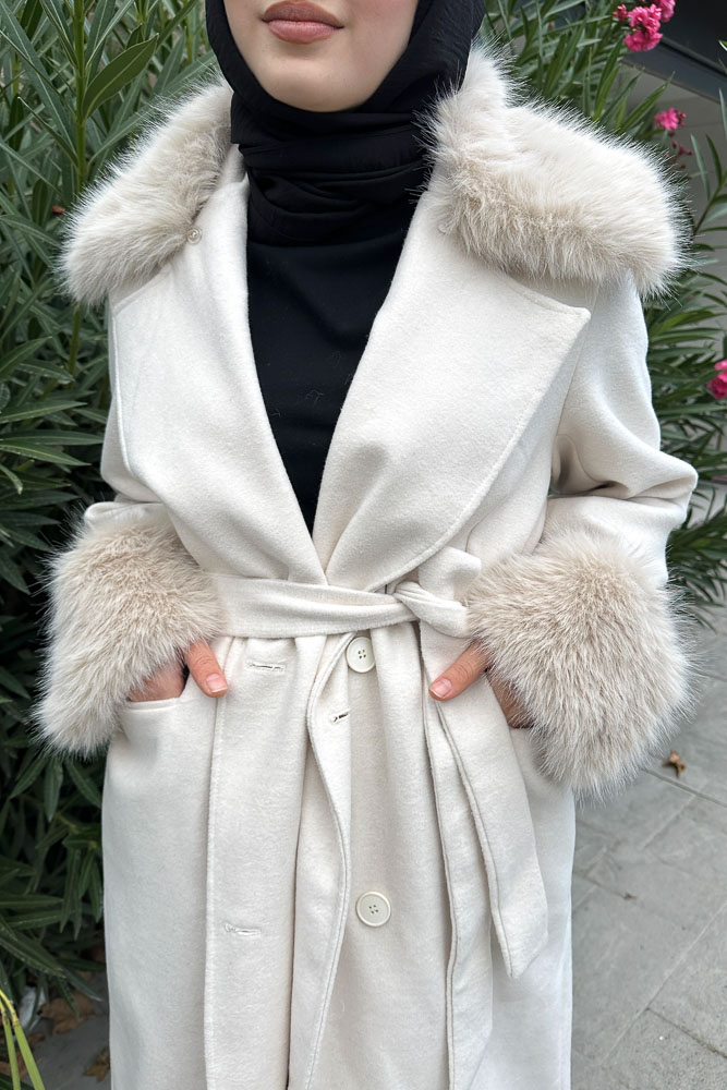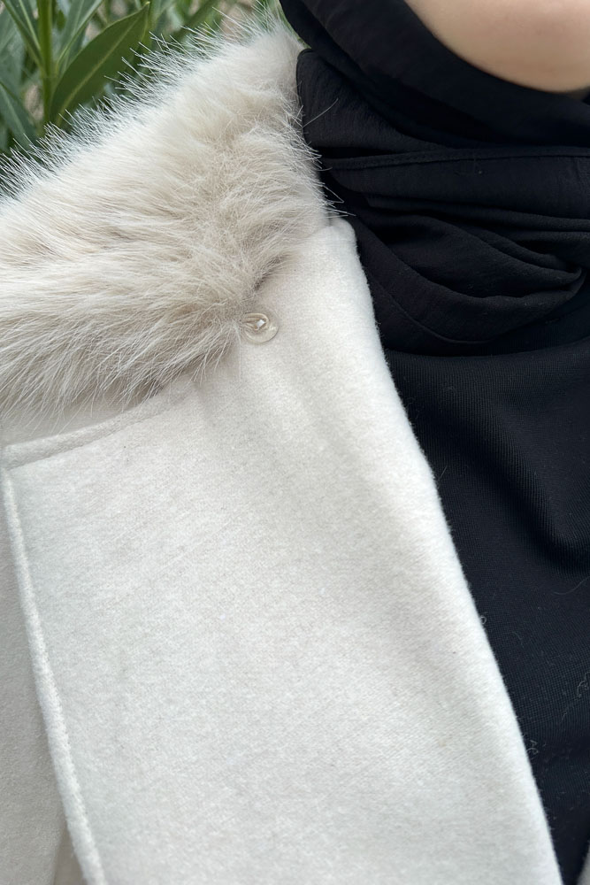 Elysia Yakası Kürklü Kaşe Kaban - Ekru