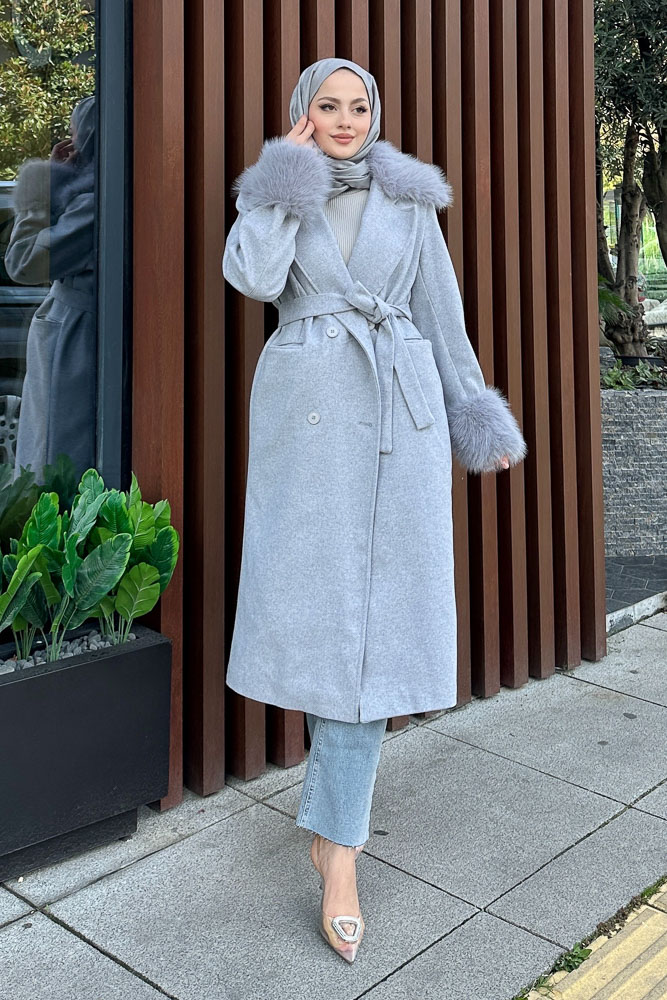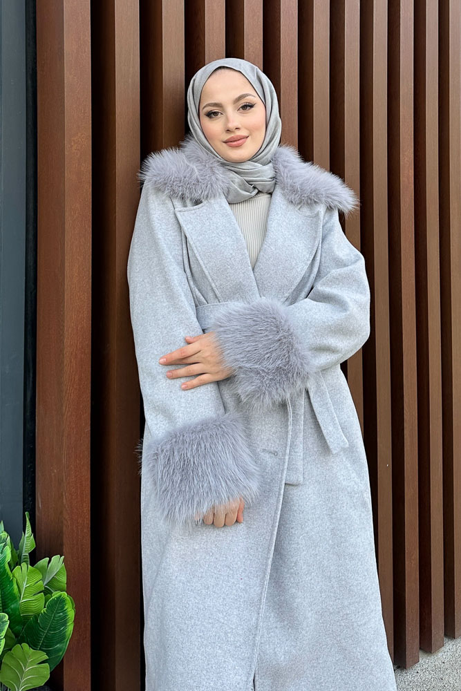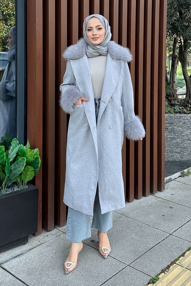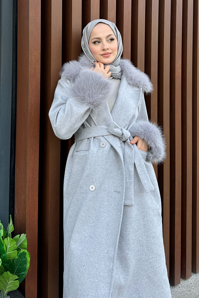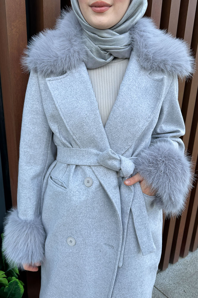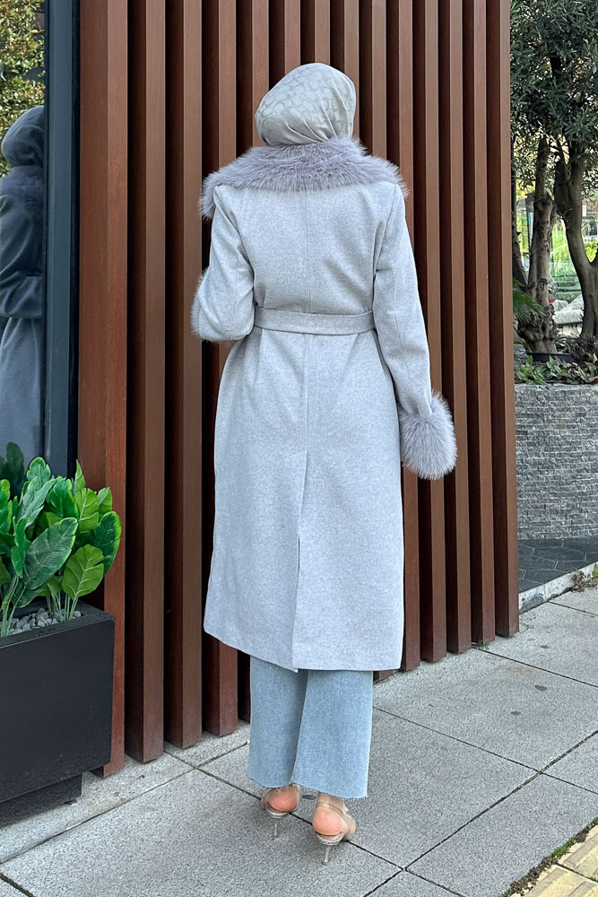 Elysia Yakası Kürklü Kaşe Kaban - Gri
