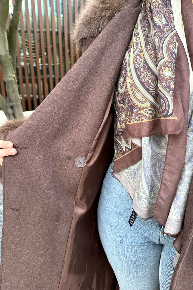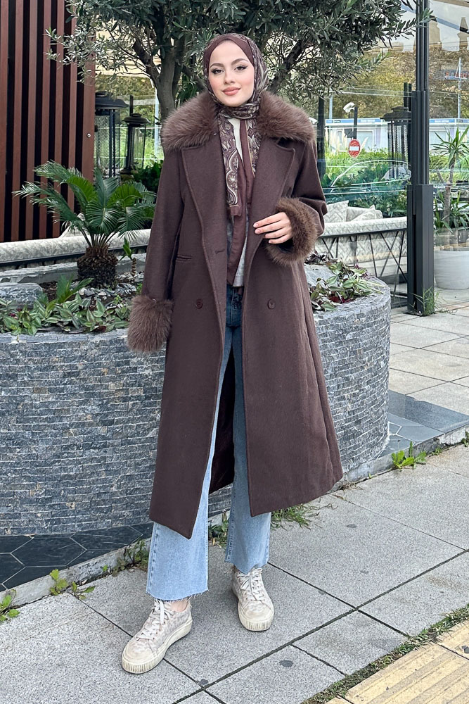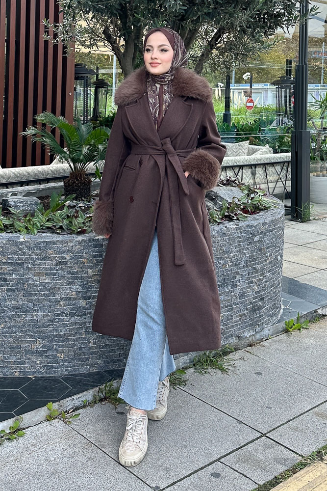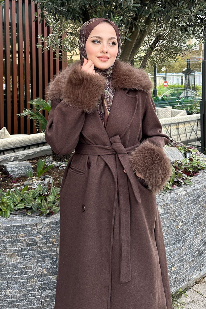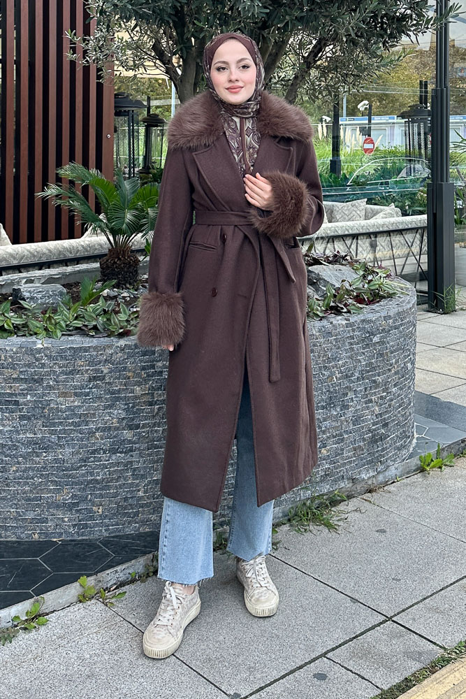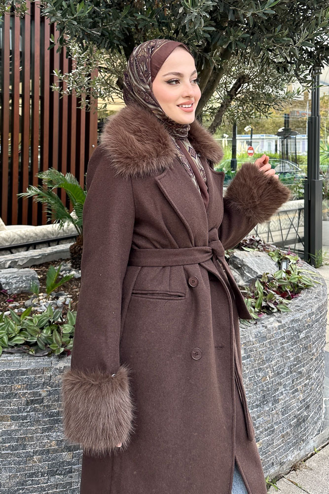 Elysia Yakası Kürklü Kaşe Kaban - Kahverengi