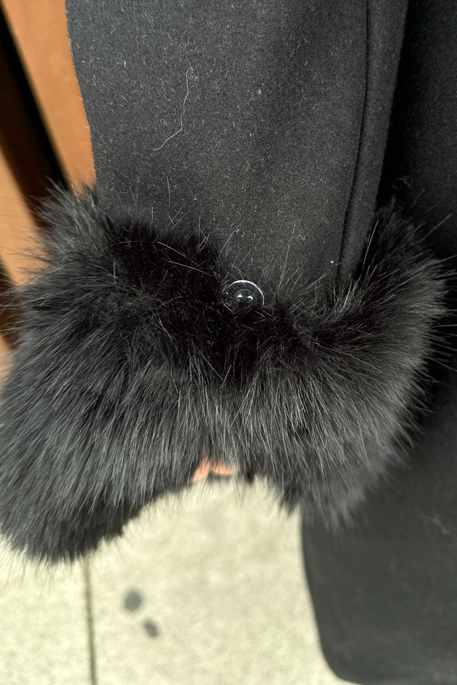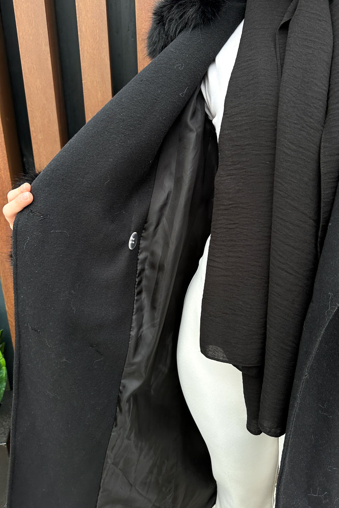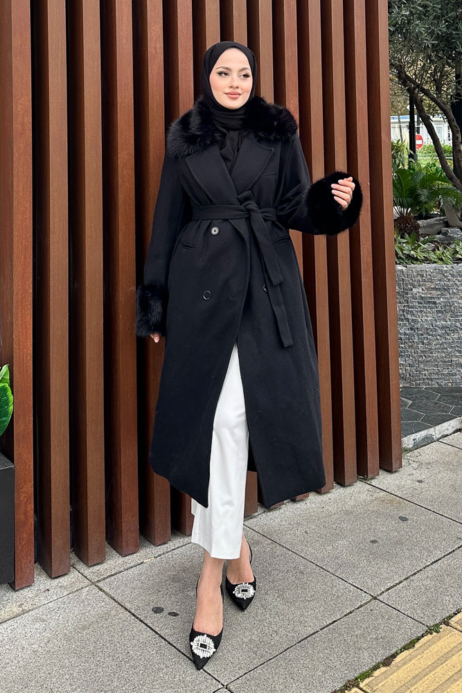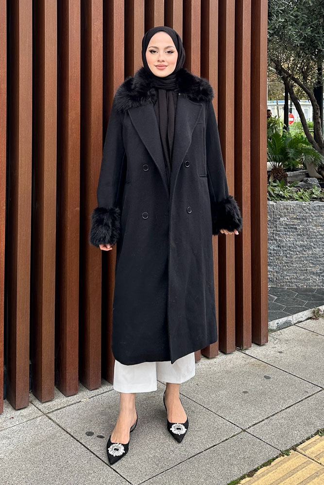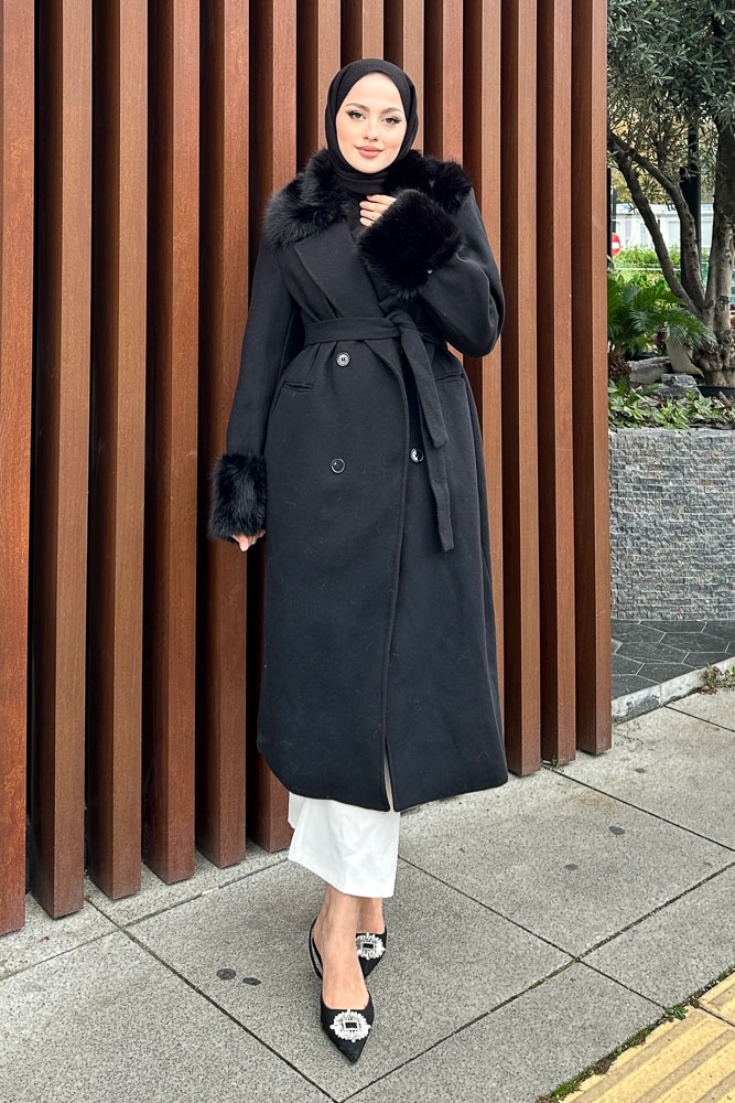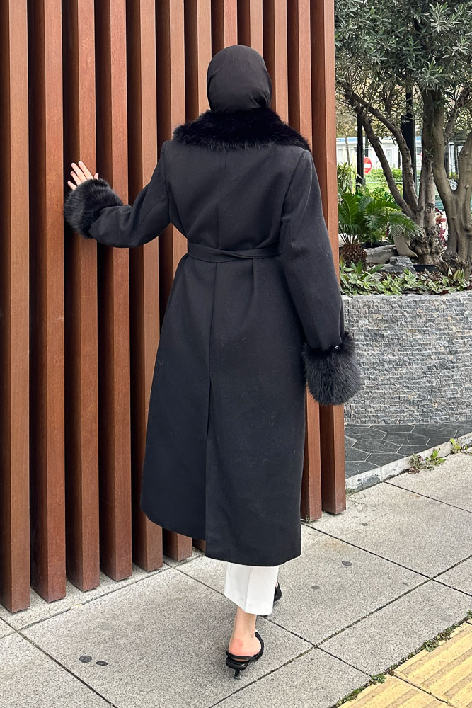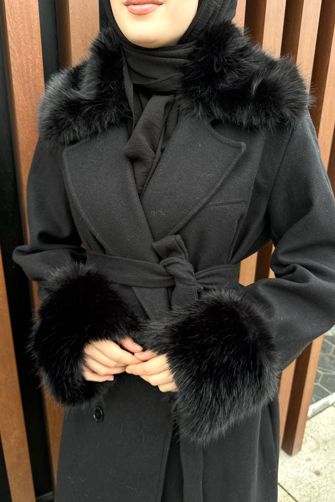 Elysia Yakası Kürklü Kaşe Kaban - Siyah