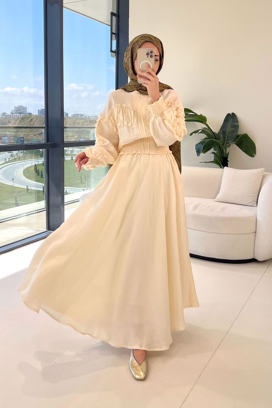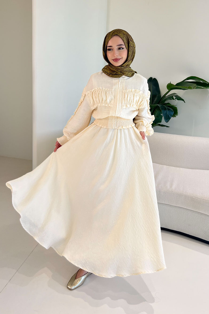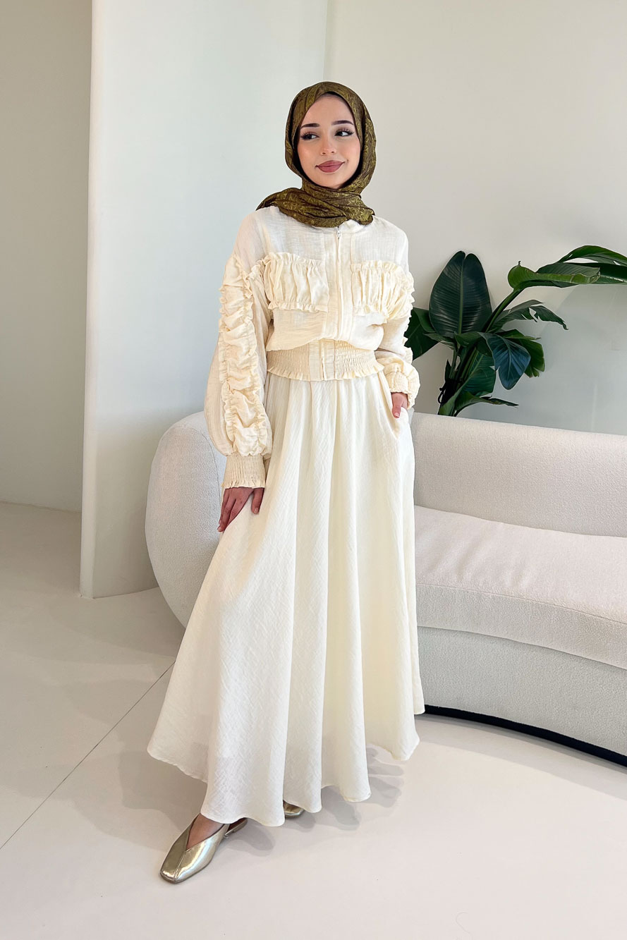 Fermuarlı Büzgü Detaylı Müslin Etek Takım - Bej