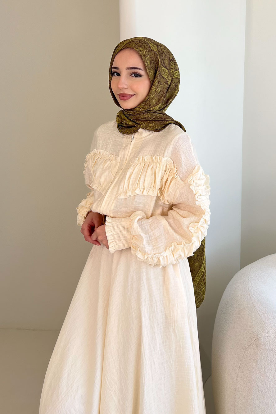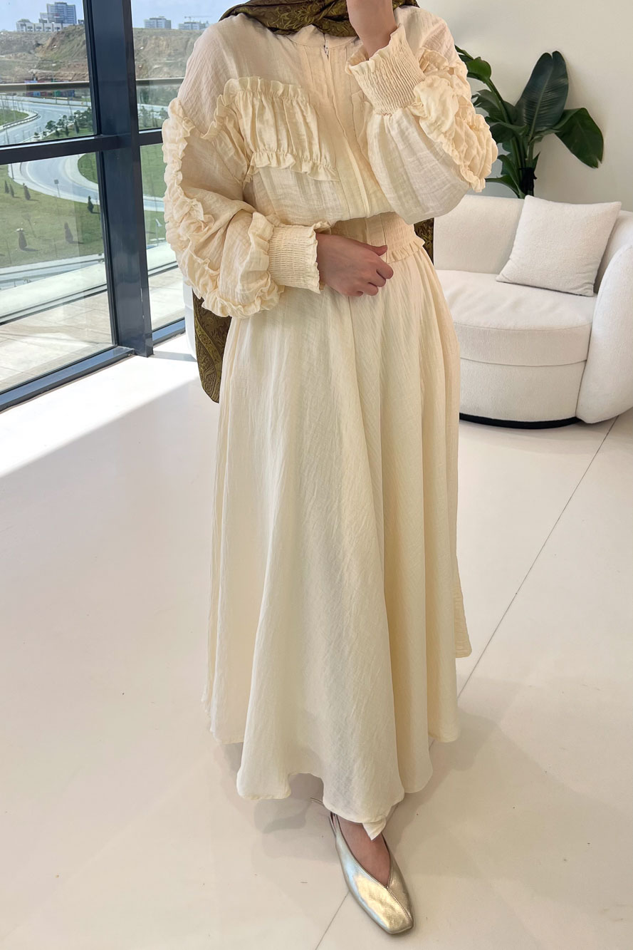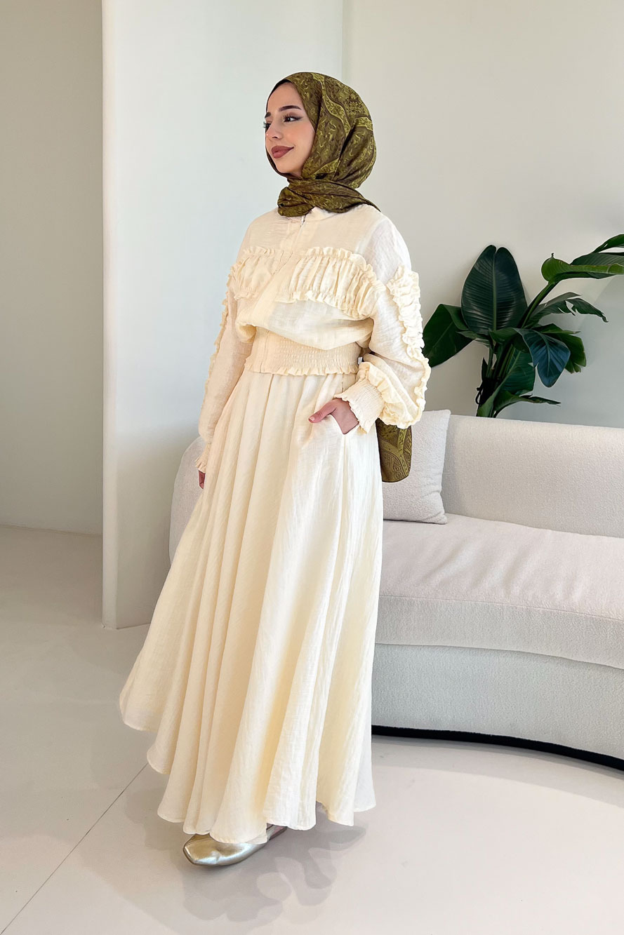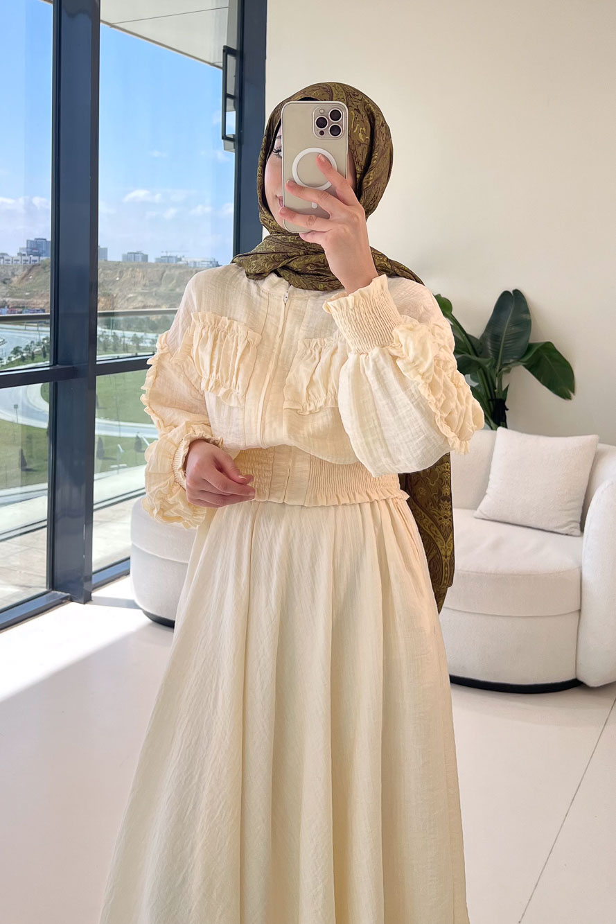 Fermuarlı Büzgü Detaylı Müslin Etek Takım - Bej