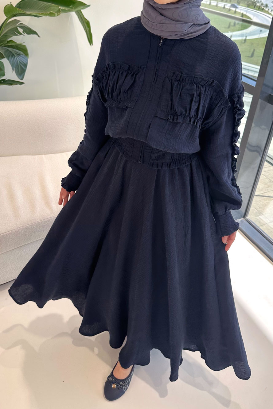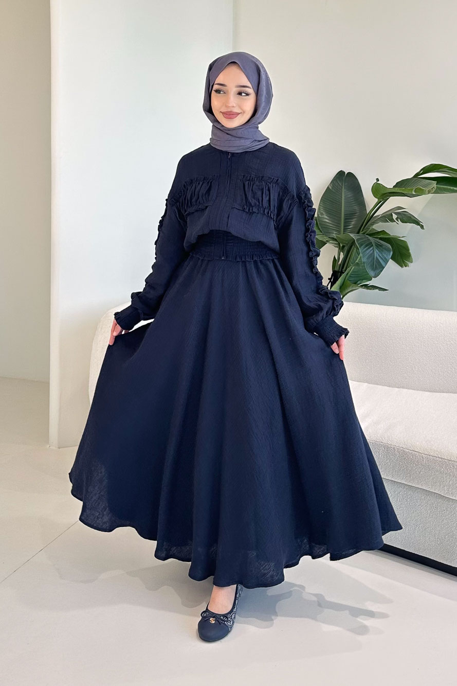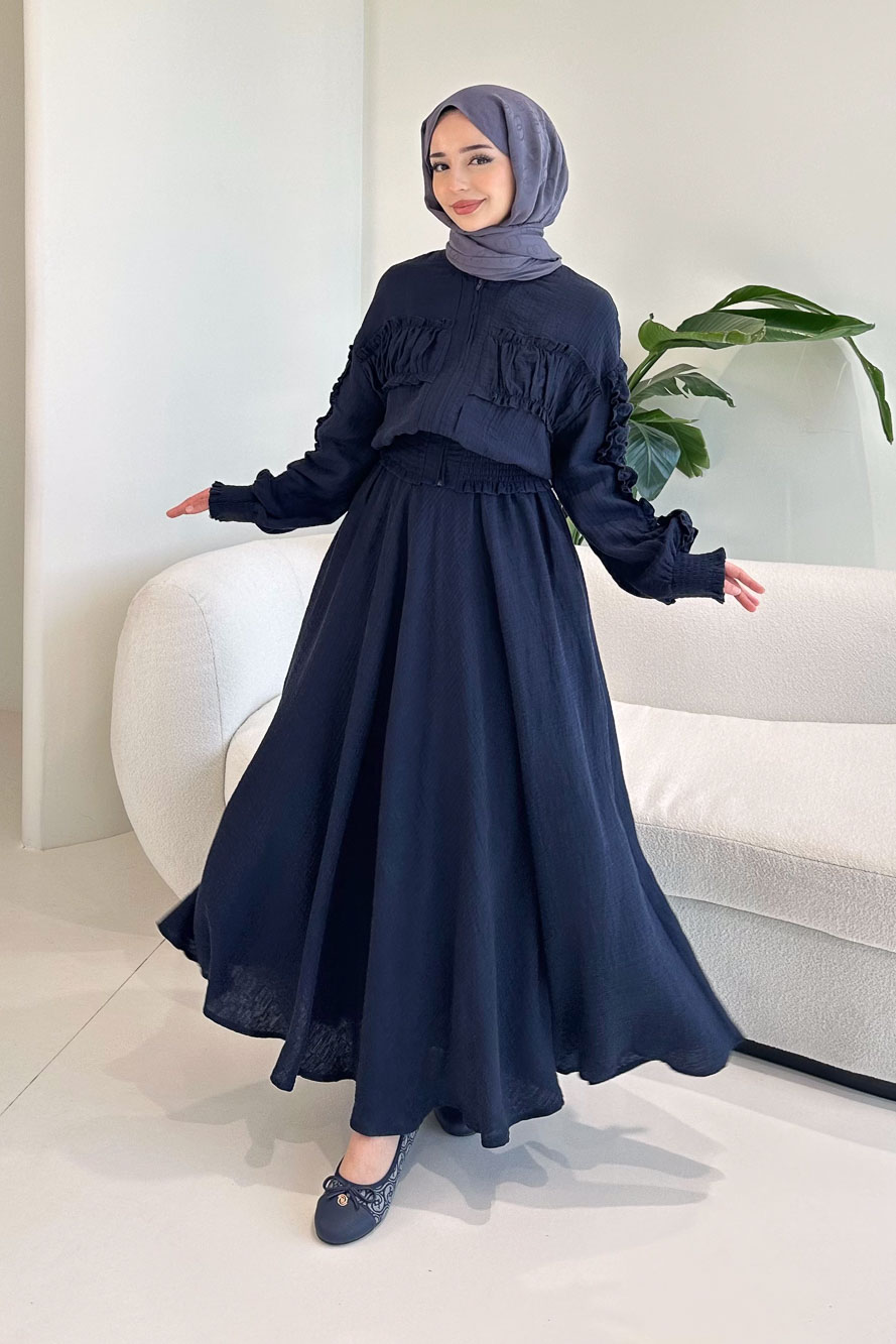 Fermuarlı Büzgü Detaylı Müslin Etek Takım - Lacivert