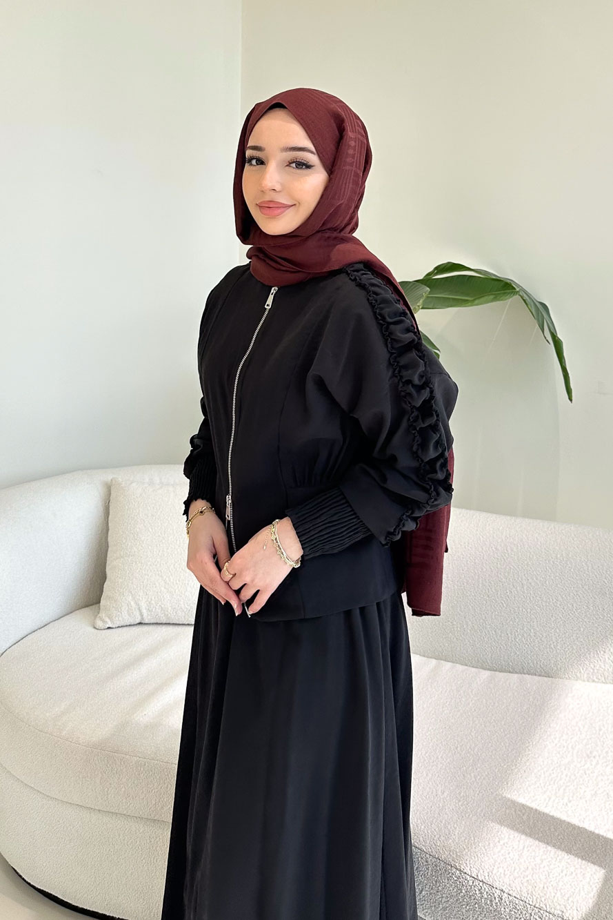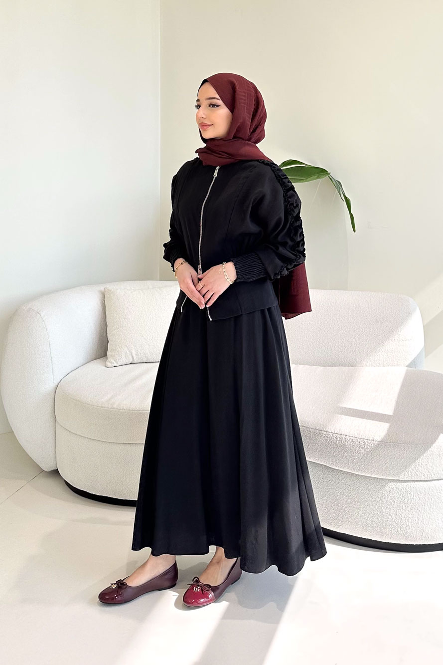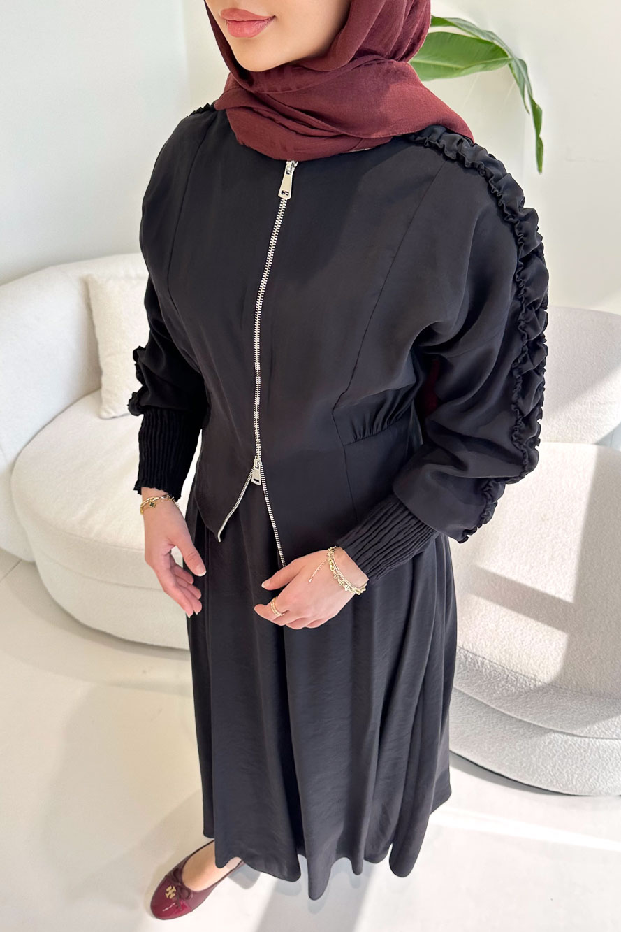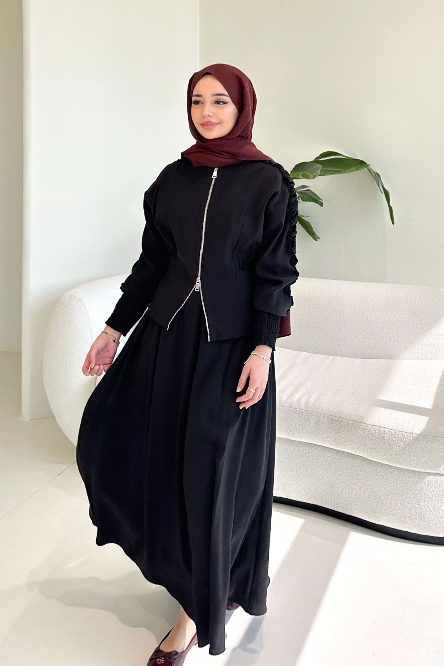 Fermuarlı Büzgü Kol Etekli Takım - Siyah