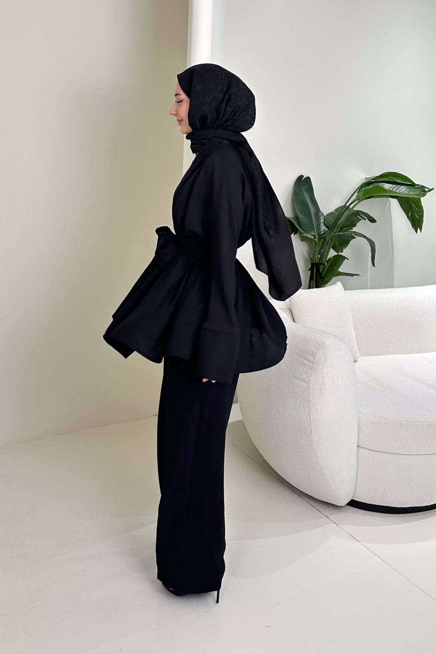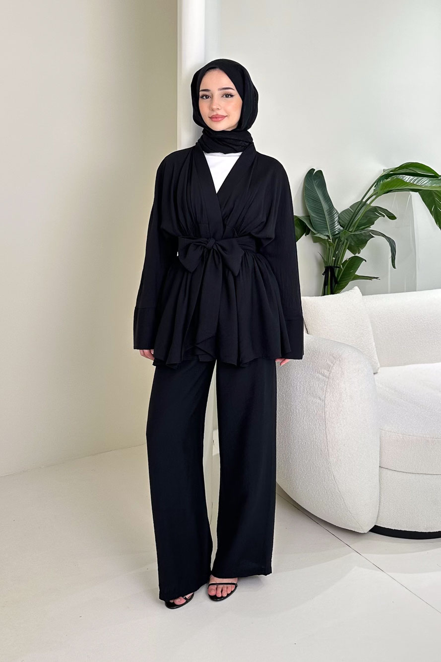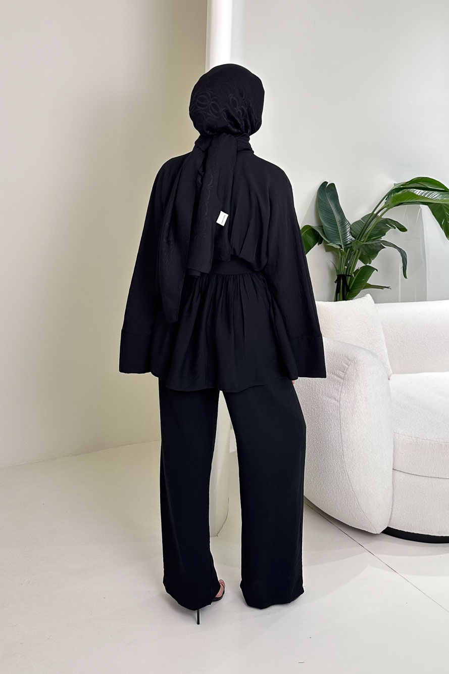 Geniş Kol Bağlama Detaylı Pantolon Takım - Siyah