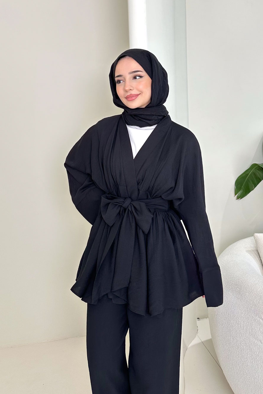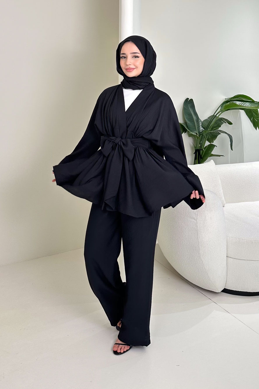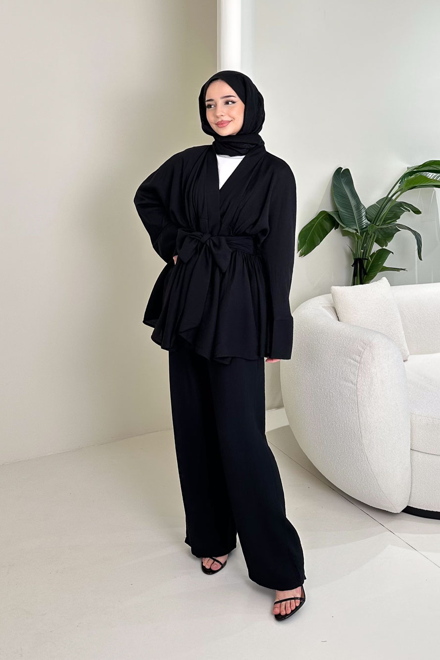Geniş Kol Bağlama Detaylı Pantolon Takım - Siyah