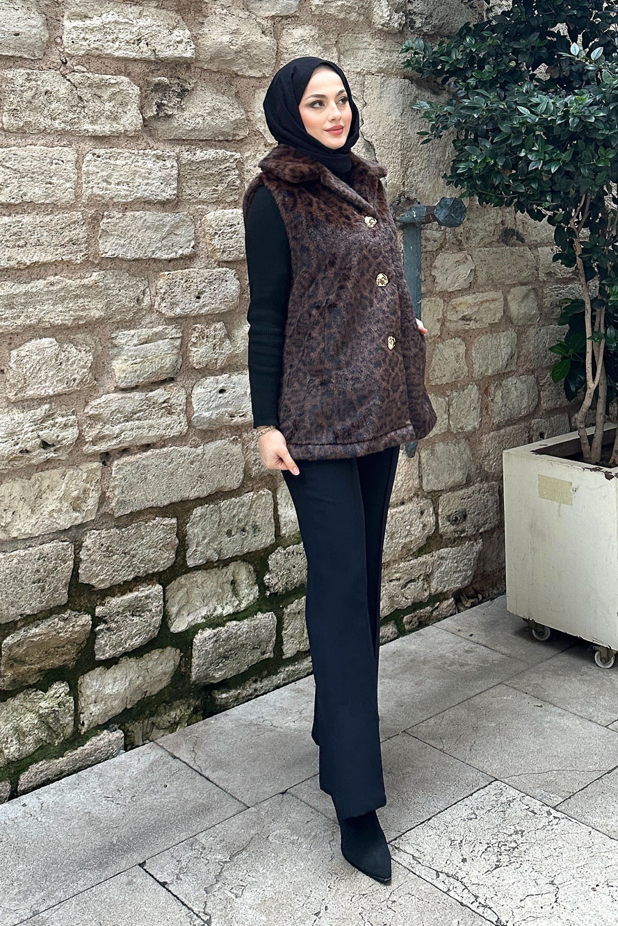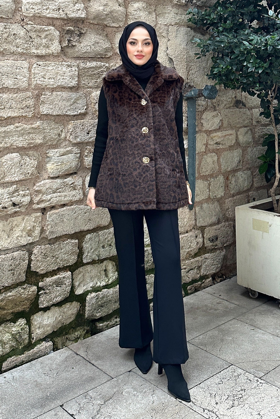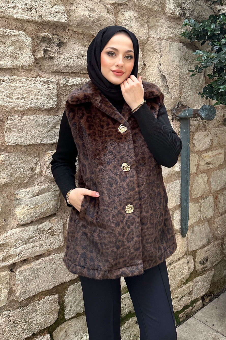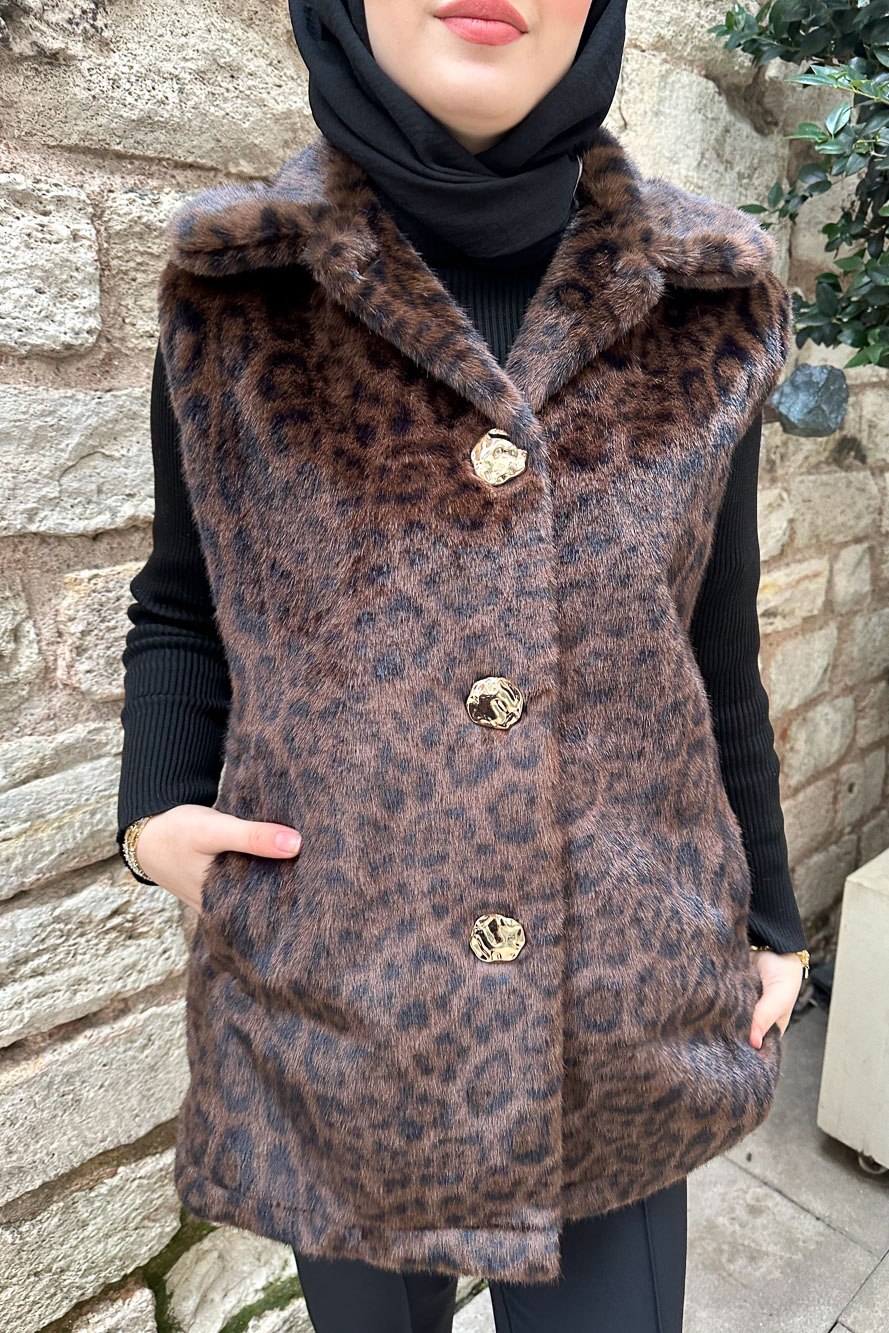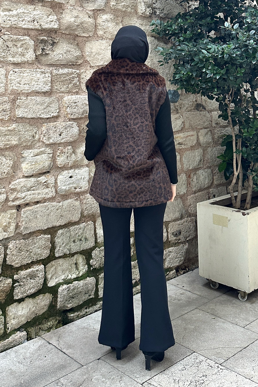 Geniş Yaka Leopar Yelek - Kahverengi