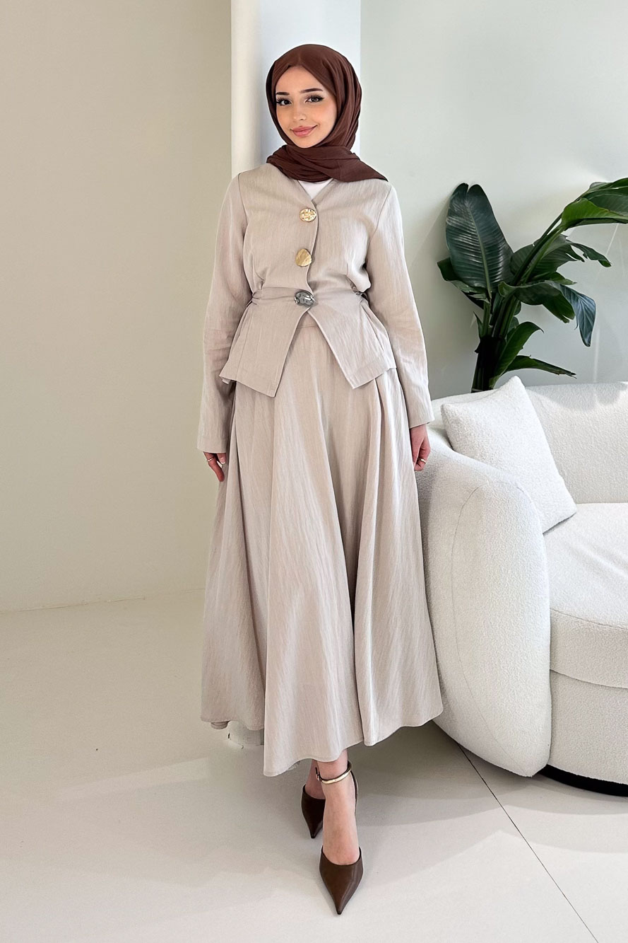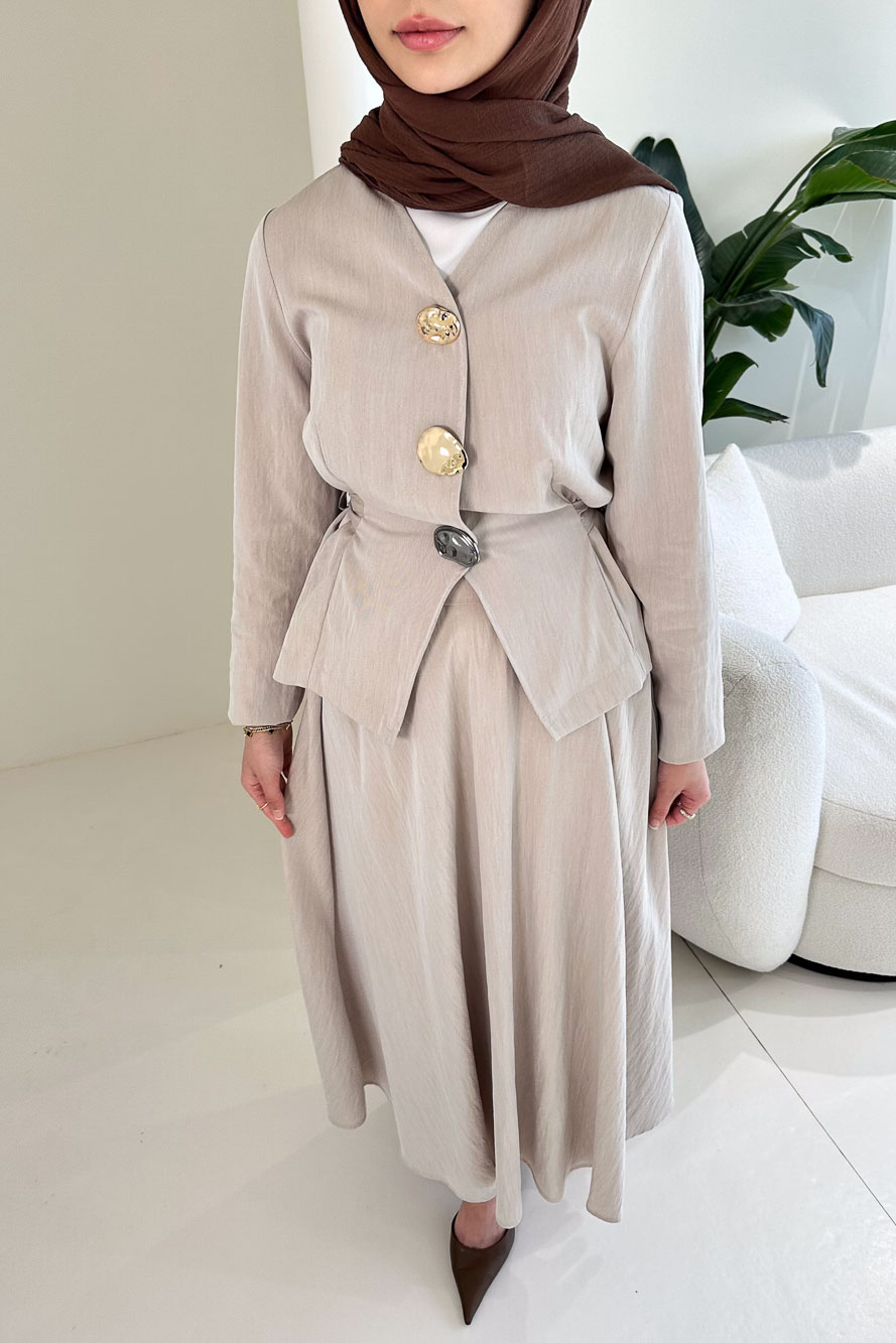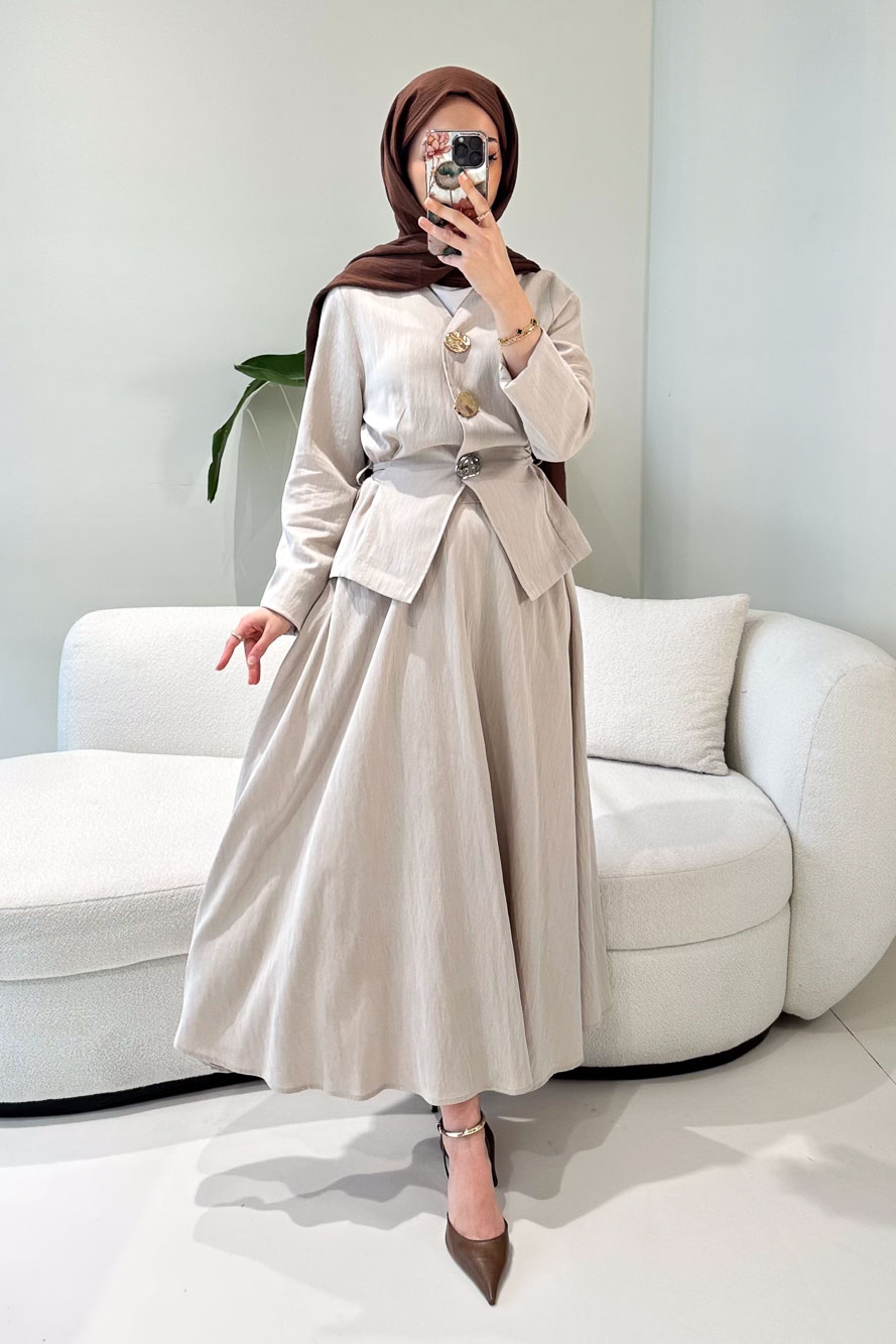 Gold Düğme Detaylı Etek Takım - Camel