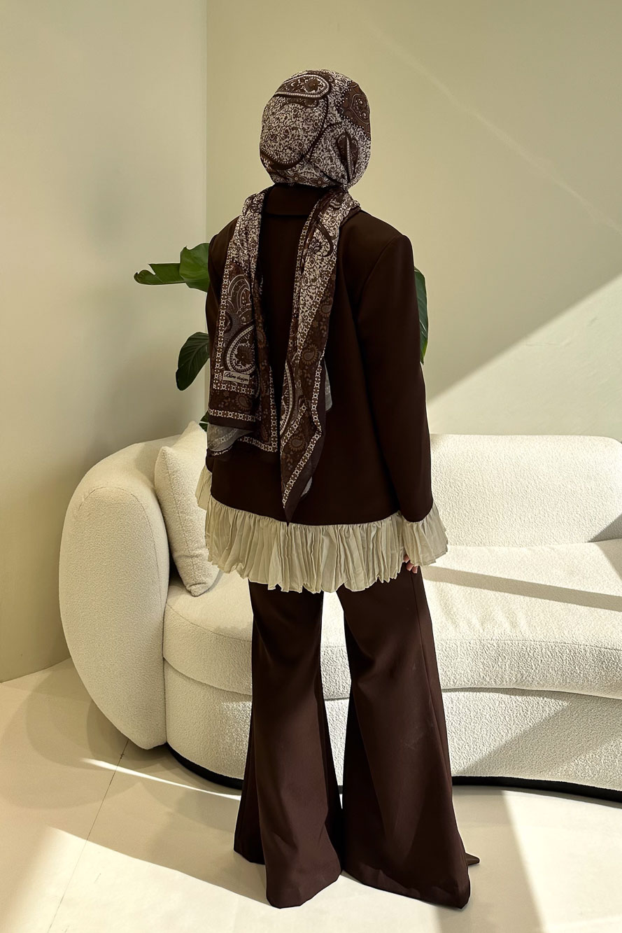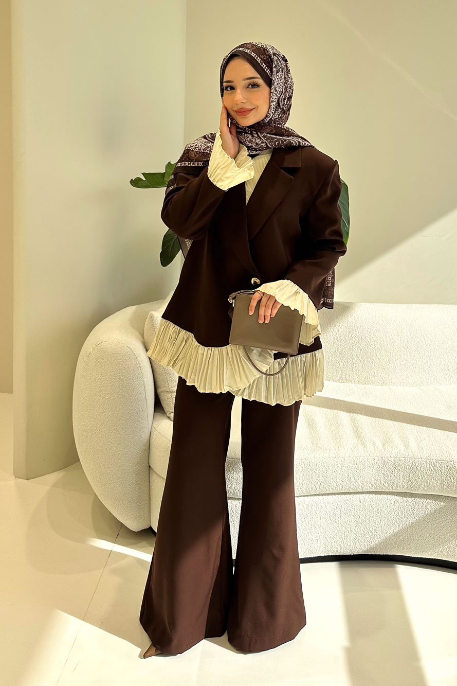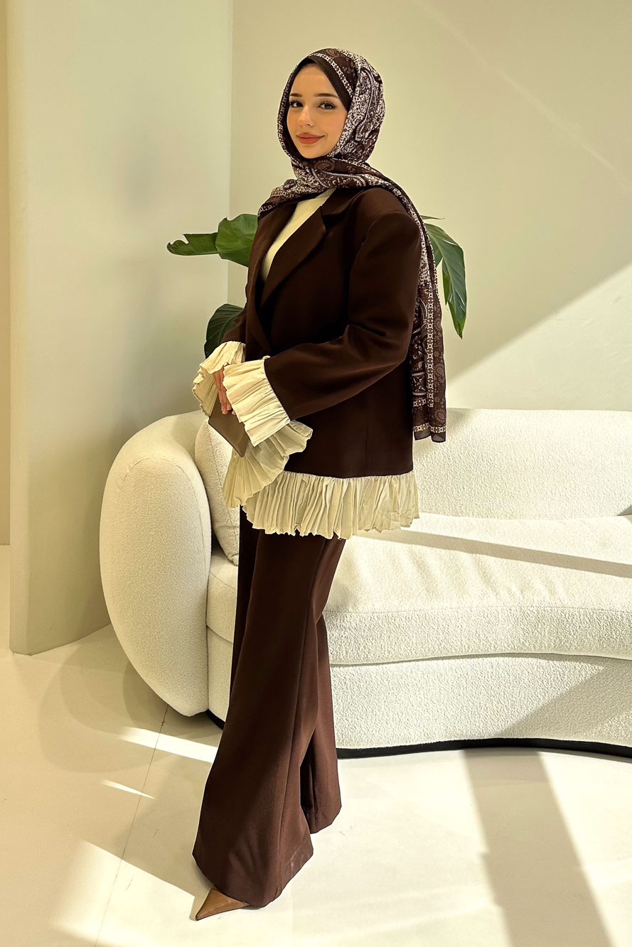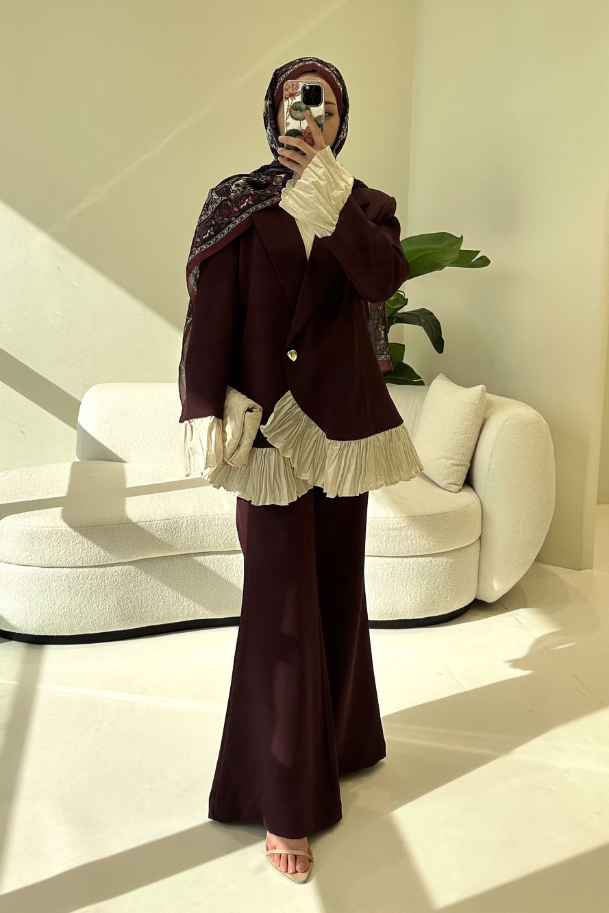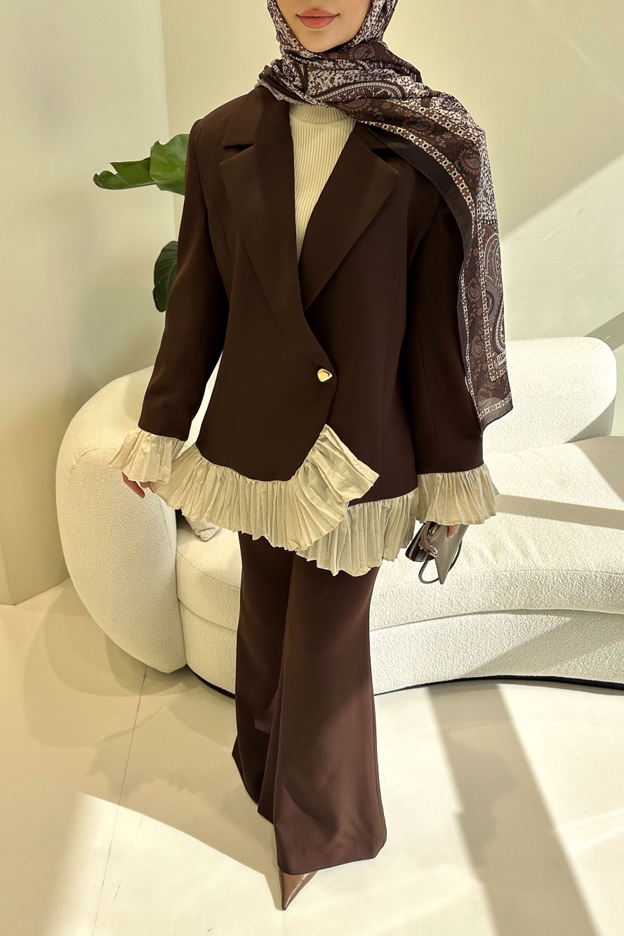 Plise garnili detayları ve tek gold düğmeli ceket tasarımıyla zarif ve güçlü bir siluet sunar.